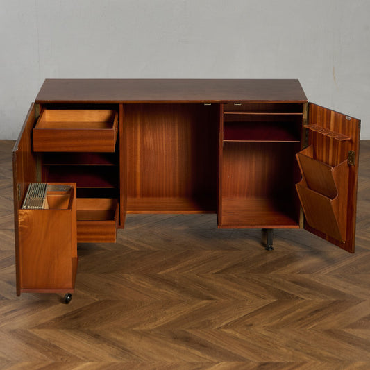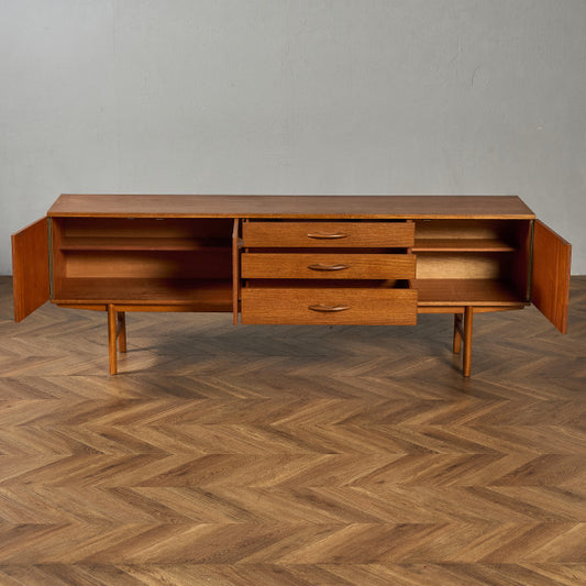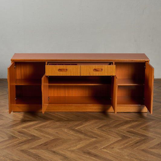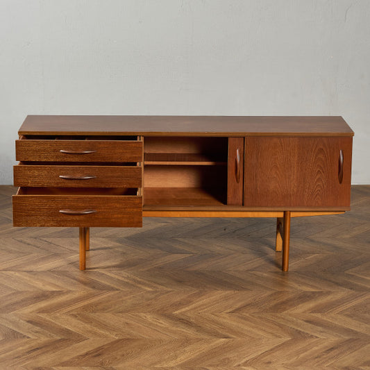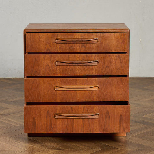 1952年、イギリスの老舗家具メーカーE.Gomme社が戦後の住宅事情に合わせて立ち上げたG-PLANは、「計画的に買い足せる家具」という革新的なコンセプトで英国モダン家具の象徴となりました。従来のセット販売から脱却し、予算に応じて単品購入できるシステムを確立し、数年後に買い足してもシリーズ内で統一感が保たれる設計が特徴です。1960年代にはデンマーク人デザイナーのイブ・コフォード・ラーセンを起用し、北欧デザインの洗練さと英国の堅牢性を融合。チーク材の深い色味を活かした「Fresco」シリーズや、彫刻的な脚部が印象的な「Brasilia」シリーズなど、機能美を追求した名作を生み出しました。初期の金色のEG刻印から中期の赤い円形ロゴシールまで、時代ごとの証が刻まれた家具たちは、1950〜70年代の英国ミッドセンチュリーを代表する存在として、今なお世界中のコレクターを魅了しています。