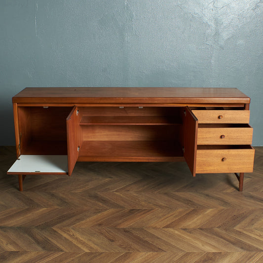 ネイサン社の創業は1916年、イギリス・ロンドンでロシア出身のバーネット・ネイサンが手作りの家具を製造したことに遡ります。1954年ニュー ヨークで開かれた家具展覧会においてイギリスを代表するデザインとして選ばれて一躍有名になり、チーク材の家具を本格的に生産。G-planシリーズで有名なエベネゼル・グーム社と並び、イギリスミッドセンチュリーを代表する家具メーカーへと発展しました。とくに「クラシックレンジ」シリーズは、時代を超越したデザインで優れた快適性と職人技が見事に融合。クラシックと北欧スタイルの折衷的な独自のデザインスタイルを生み出し、ジャコビアンドアスタイリングと美しいチーク材の組み合わせの自然な輝きがロンドンの都市生活者を虜にしました。