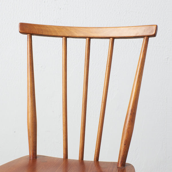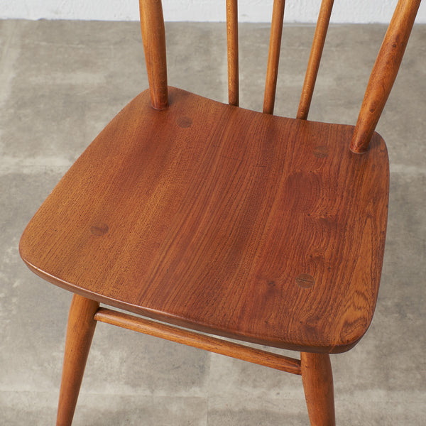 This design is an adaptation of the traditional British Windsor chair, the Comb Back Chair. Its design is similar to that of the Goldsmith Chair, but the Stick Back Chair has an overall more linear form, giving it a simpler impression. It is the lightest of all Ercol chairs, known for their light weight, making it even easier to handle and use. As it is a model that is no longer in production, it is becoming less and less common on the secondhand market. Prices of vintage items in particular have skyrocketed, making it a rare and popular chair.