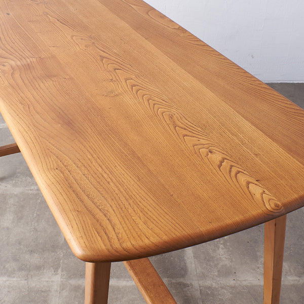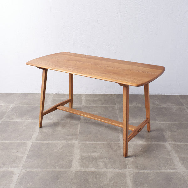A rare dining table with trestle legs. Designed around 1957, at the very beginning of the ERCOL Windsor series. A simple and stylish design that highlights the balance between the curved top with rounded corners and the ERCOL-like flared legs. It is easy to coordinate with any space, and it is easy to match with chairs, so you will not have any trouble matching it. It is a very rare item that you will rarely come across.