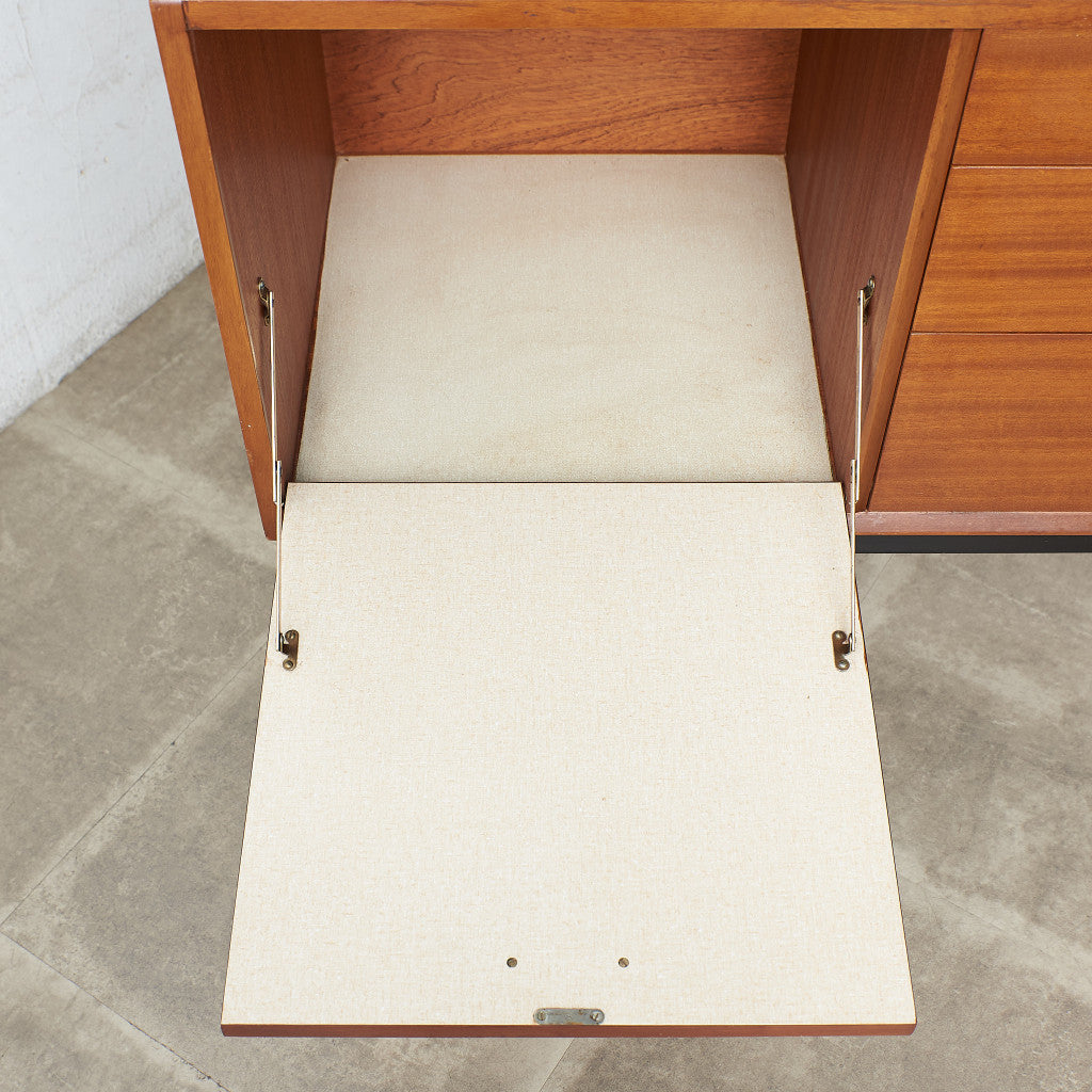 This elegant sideboard exudes a British atmosphere that is unique to Nathan. The beautiful wavy wood grain, which is not often seen in Japan, the black legs, and the contrast of the metal colored handles make this an eye-catching piece. The fact that it is less available than G-PLAN or McIntosh also tickles the hearts of collectors.