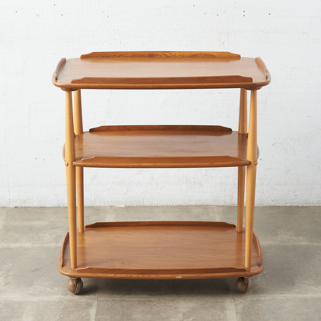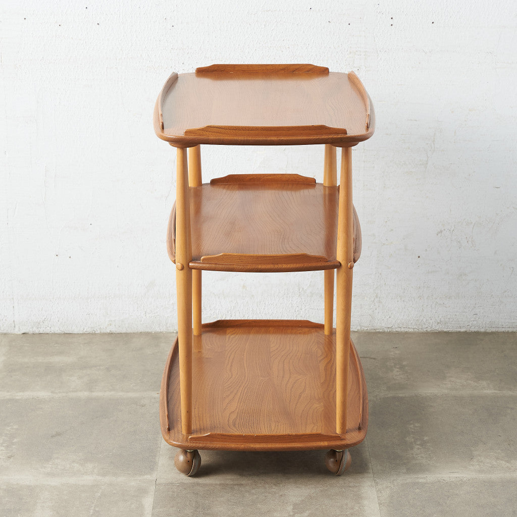 This is a traditional British tea trolley style, but it is a high-level fusion of the formality of British style and Ercol Modern. The joints between the top and the support posts are firmly joined to ensure strength. The vivid grain pattern of the natural wood and the unique casters are accents. This is a wagon that you will want to show off at tea parties and when you have guests, but it is also convenient for storing things around the kitchen and transporting food.