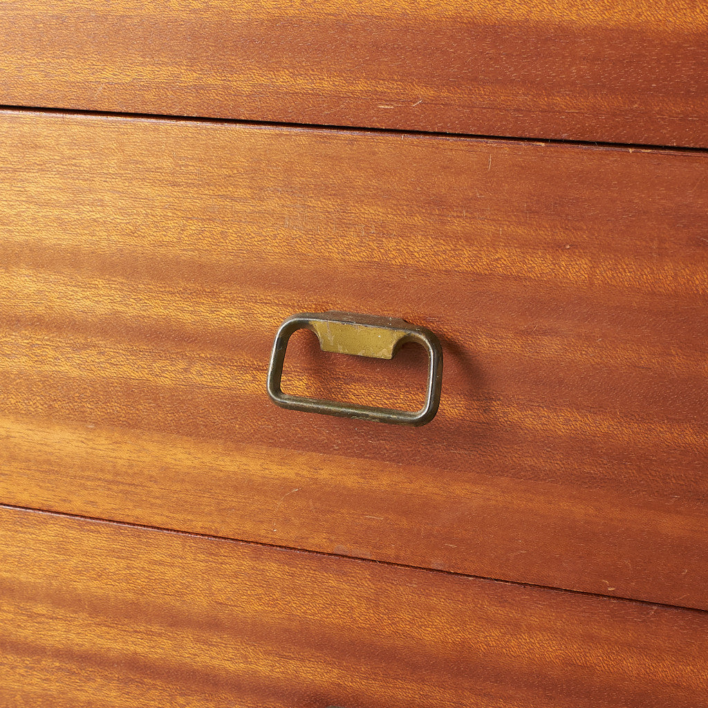 The chest of drawers is characterized by its elaborate details, such as the puffy legs and brass handles, which are unique to Avalon. It is a high-quality item with its own unique arrangement based on Danish style design.