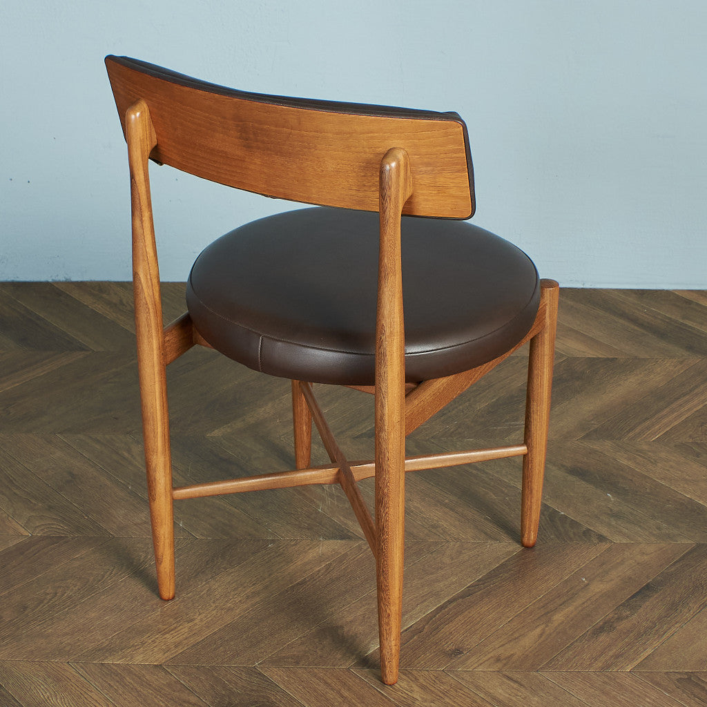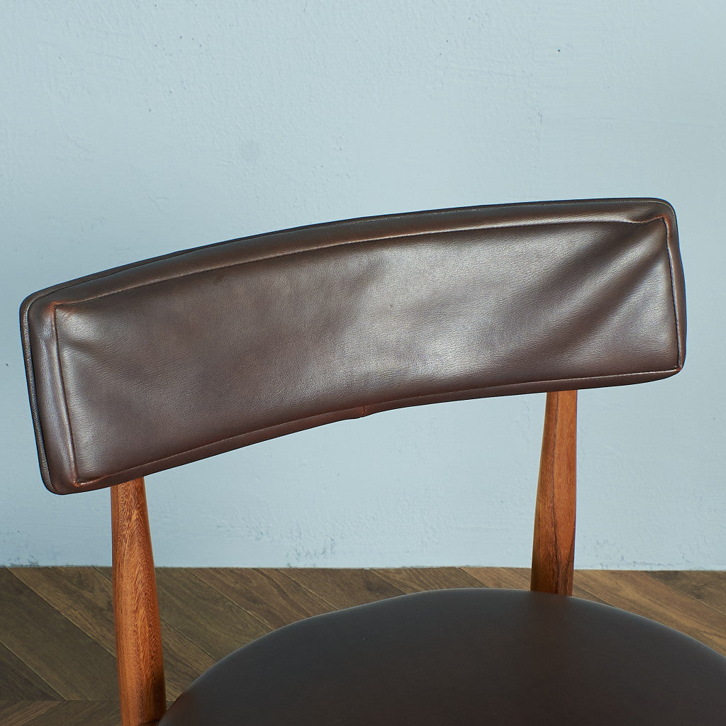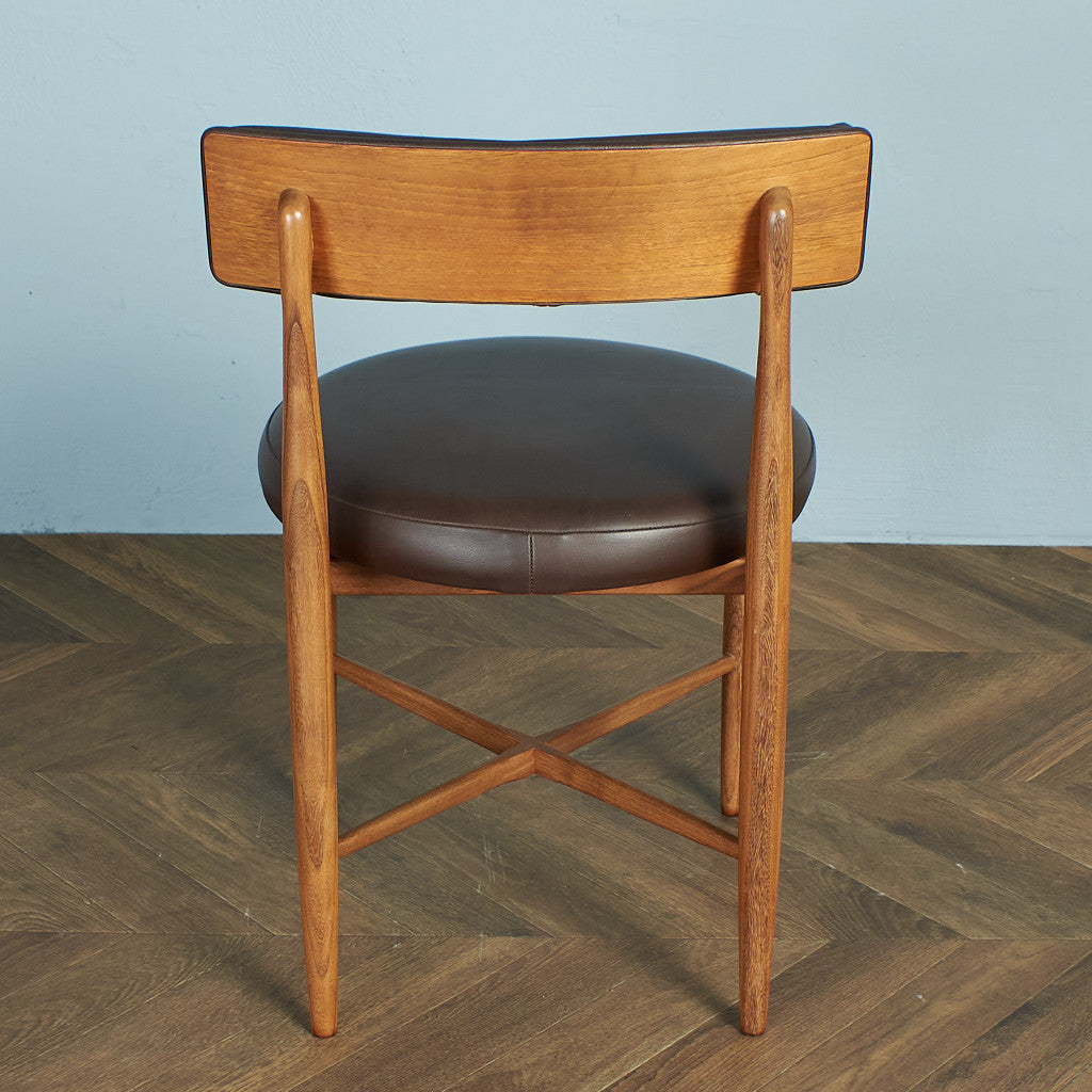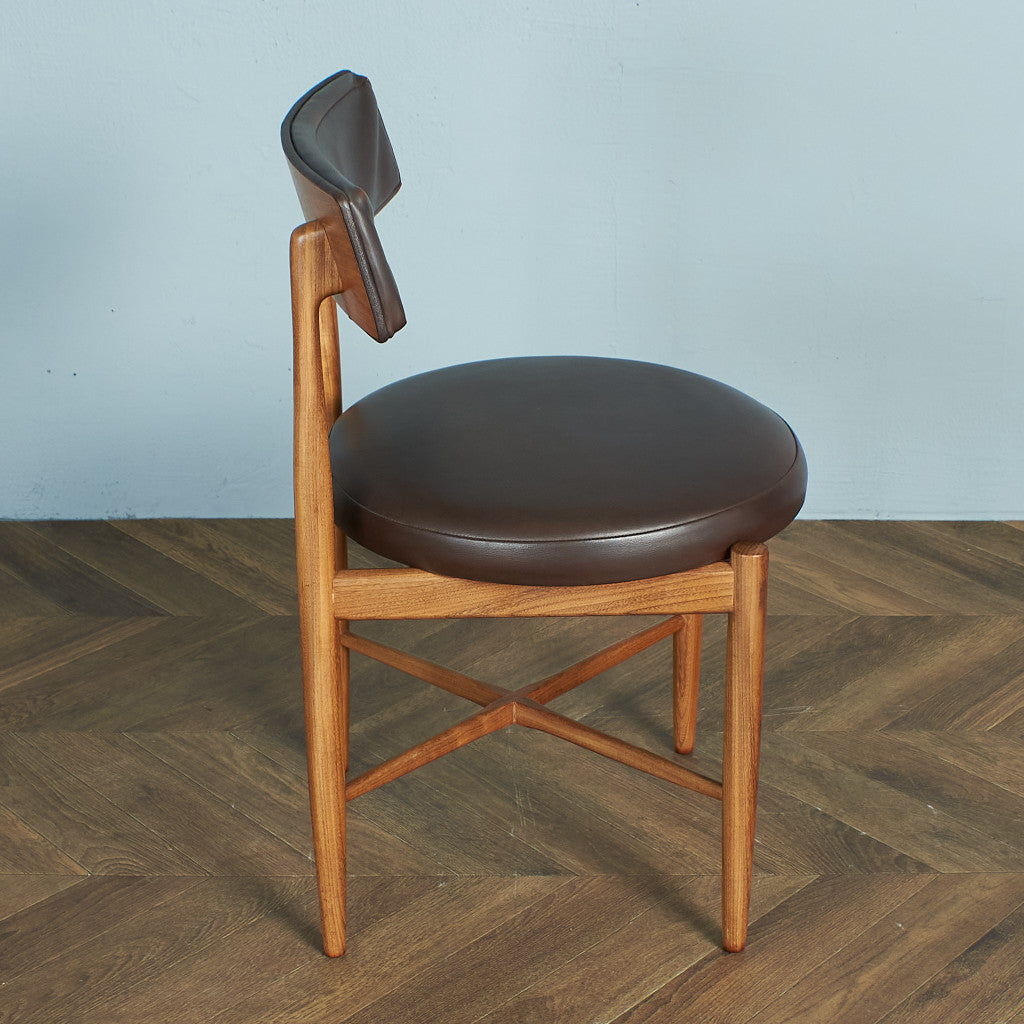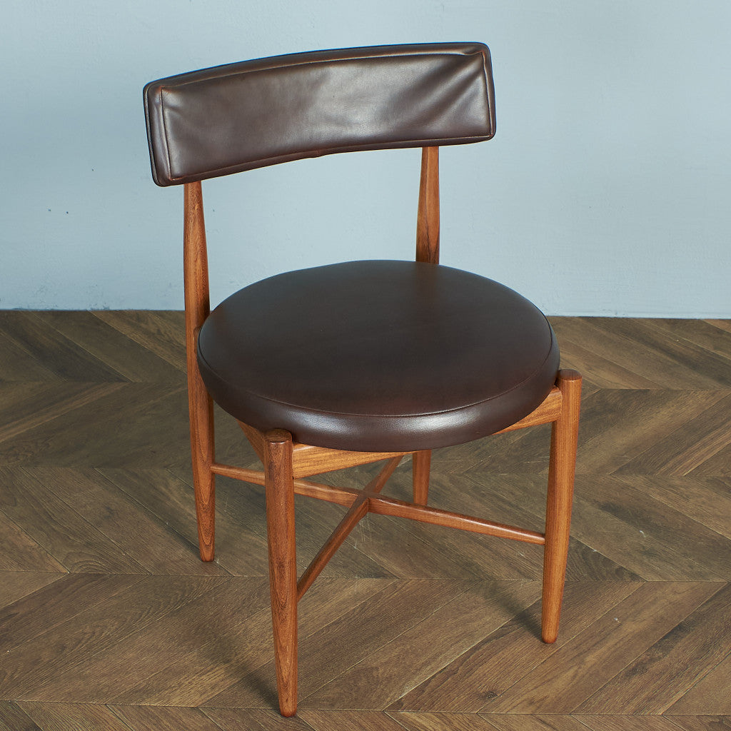This is the most popular standard model among the Fresco series dining chairs. It has a highly cushioned round seat and a cushioned backrest, making it extremely comfortable to sit on. The gently arched curve of the backrest can be coordinated with the edge line of a G-PLAN round dining table to create a unified look. The smooth lines that run from the legs to the plywood backrest are very beautiful, making this chair very picturesque when viewed from behind.