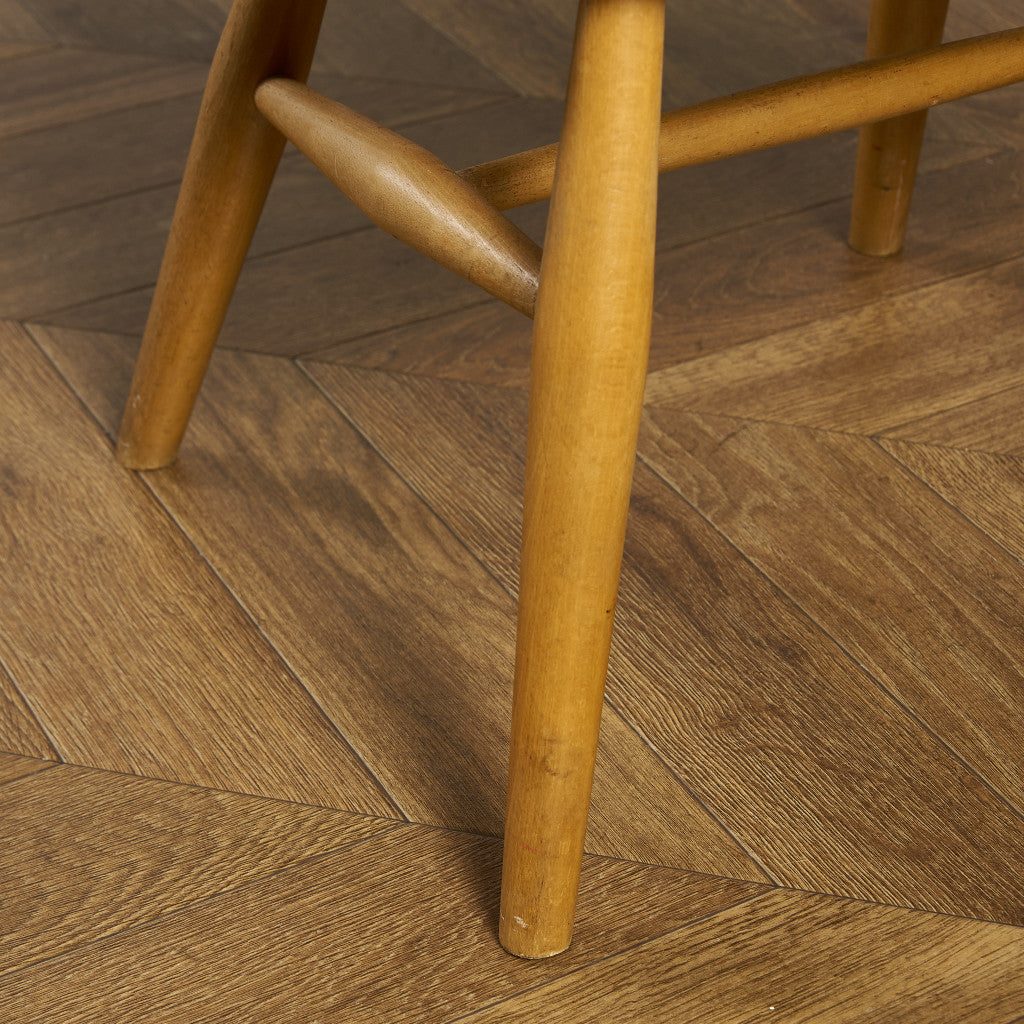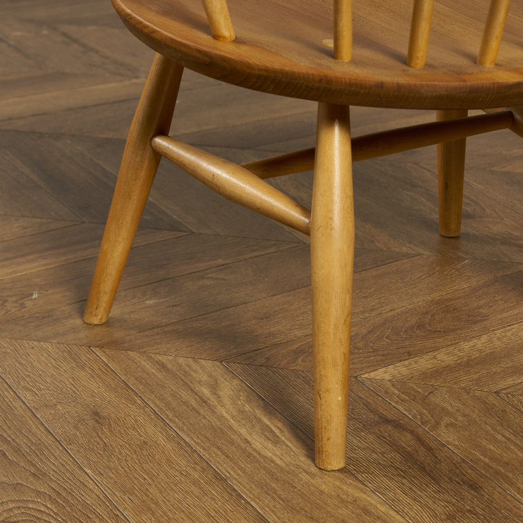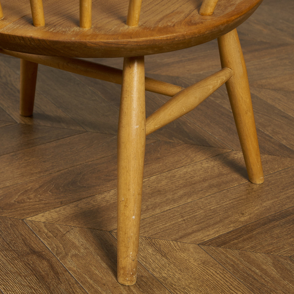 アーコール社のヴィンテージチェアの中でもレア度&人気共に一番人気のあるスモーカーズチェア。パブでゆったりと腰掛けながら葉巻を吸うための椅子スモーカーズボウウィンザーチェアをモチーフにデザインされており、幅広の座面によるゆったりとしたかけ心地が魅力です。また、背もたれが牛の角のように美しく曲げられ滑らかに削りされていることから「カウホーン」とも呼ばれています。イギリス本国でも人気が高いため日本国内への流通は非常にレアな椅子です。