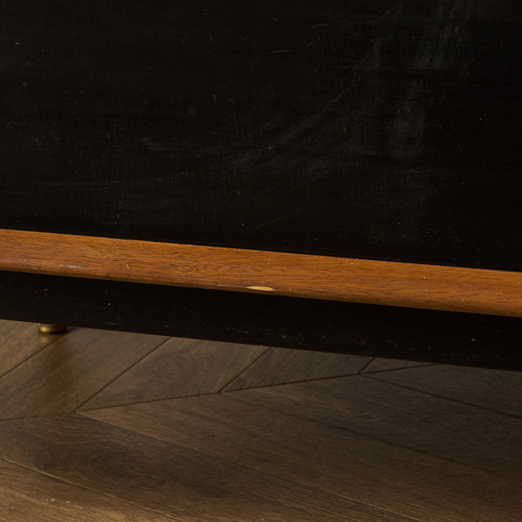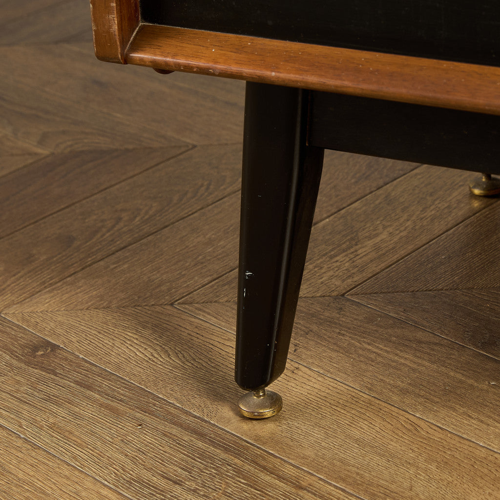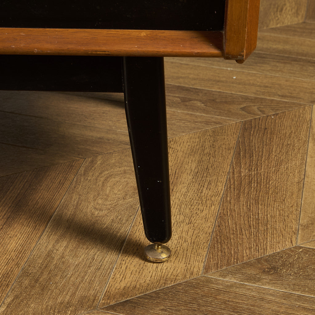1958年に発売されたTola&Black(トーラ&ブラック)。日本の漆塗りに着想を得てヨーロッパで黒塗りの家具が流行した1950年代に展開されたシリーズです。スタイリッシュで洗練された雰囲気が印象的で、トーラ材の美しい色調とブラックペイントや、真鍮メッキのゴールドのコントラストが目を惹きます。別名BB(Black&Brass)シリーズとも呼ばれ、現在でも人気の高いTola&BlackはG-PLANの中でも流通量が少なく、なかなか手に入りにくい希少価値の高いシリーズです。