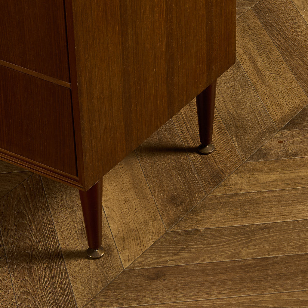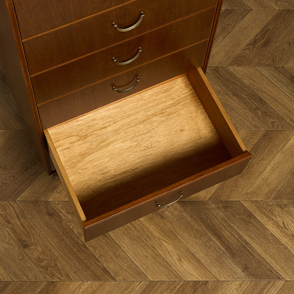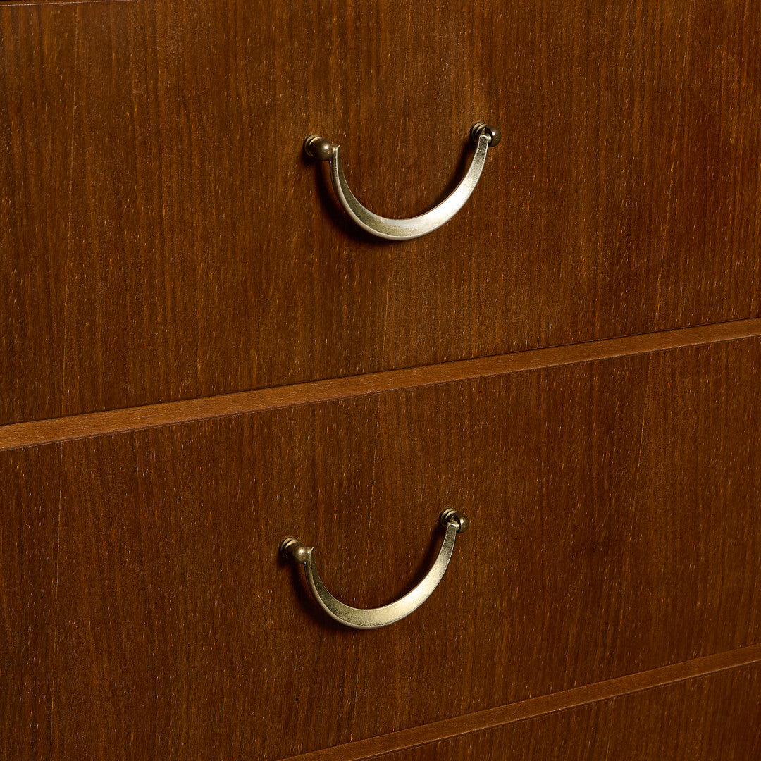 真鍮製のエレガントな取っ手など細部にまで拘りがみられる上質なデザインが印象的な6段チェスト。シンプルながらも細部に作り手の拘りが感じられる一品で、ユーズド市場でも流通量の少ないMeredewのレアモデルです。
