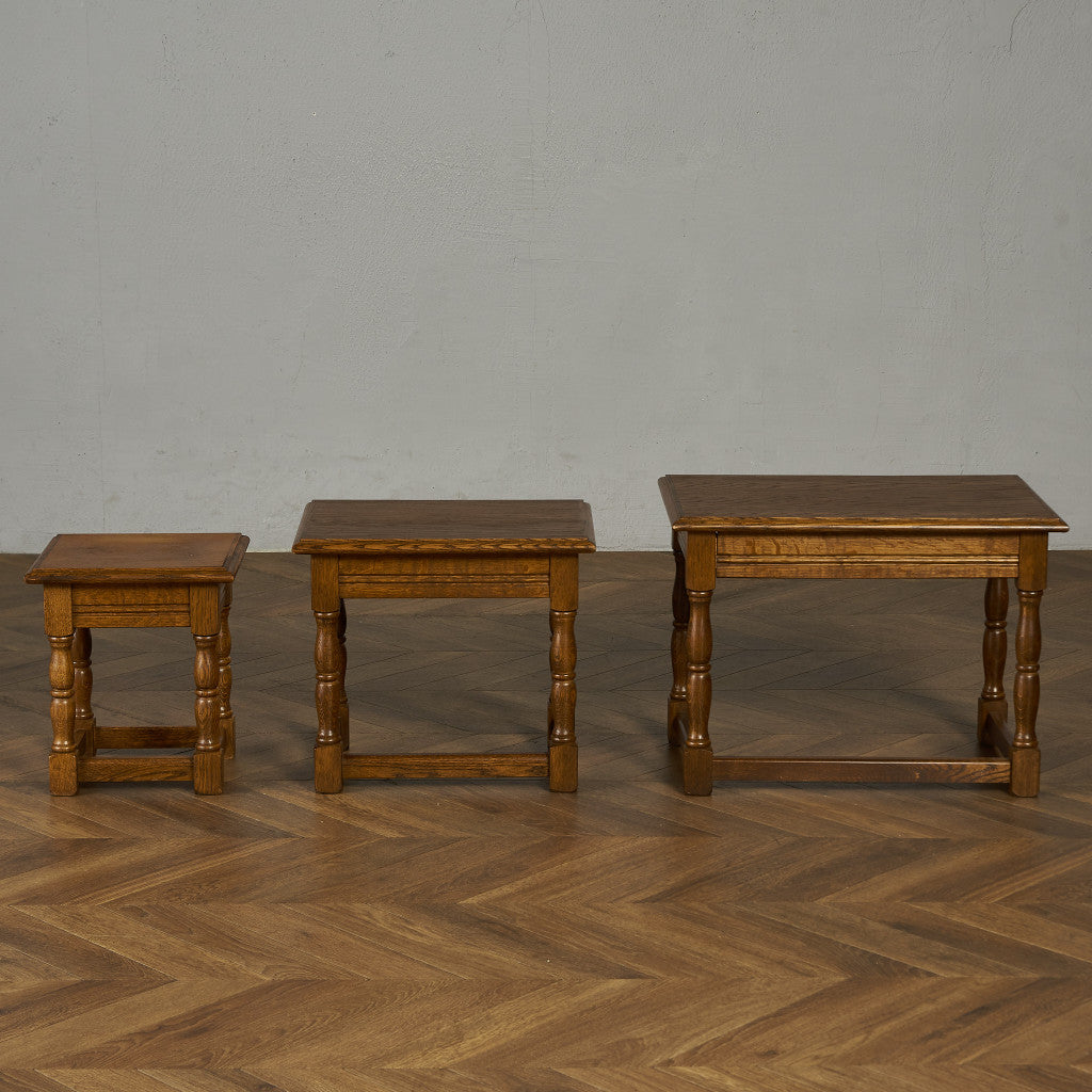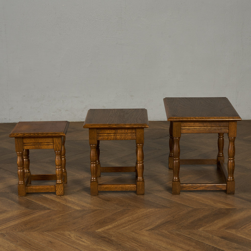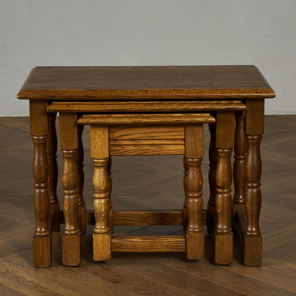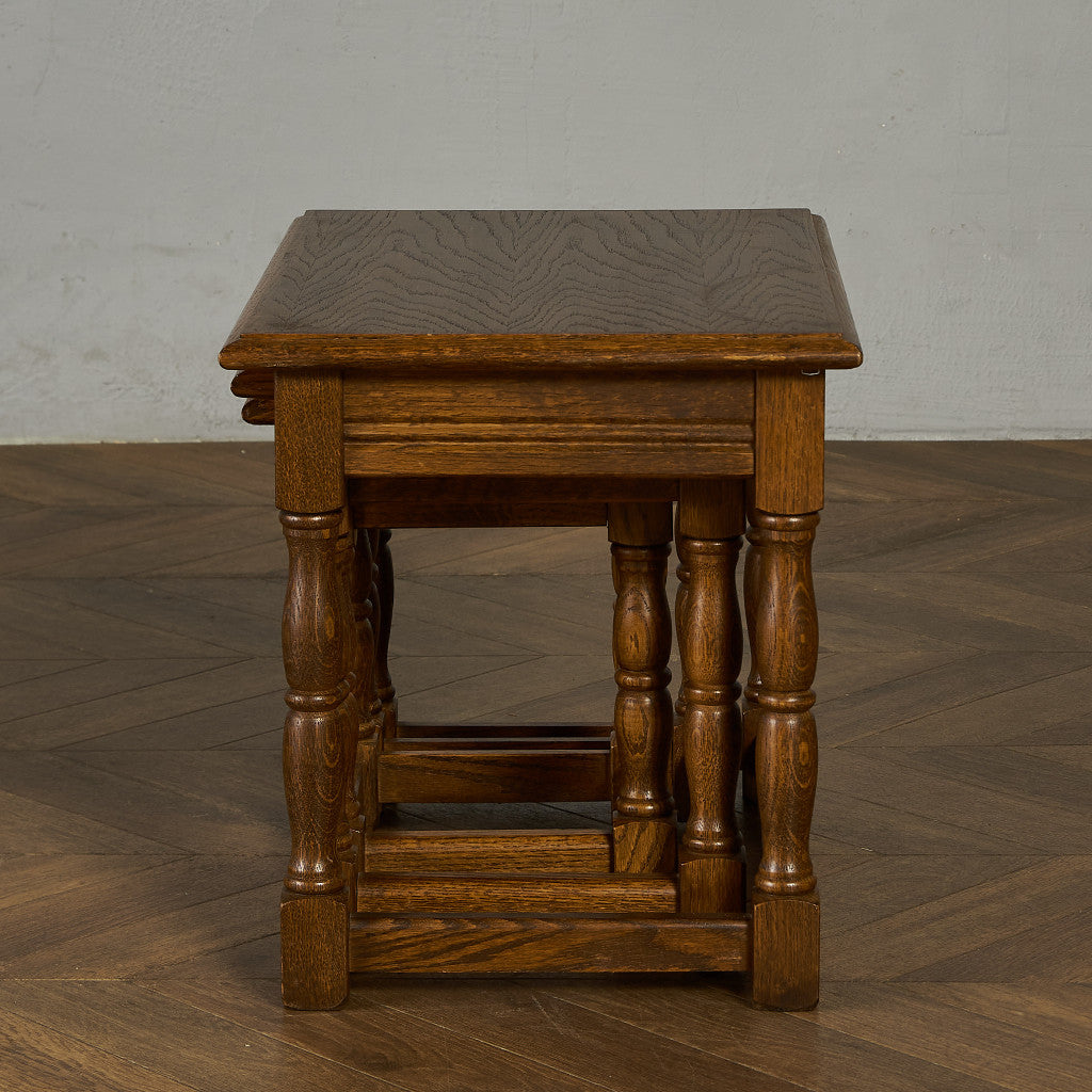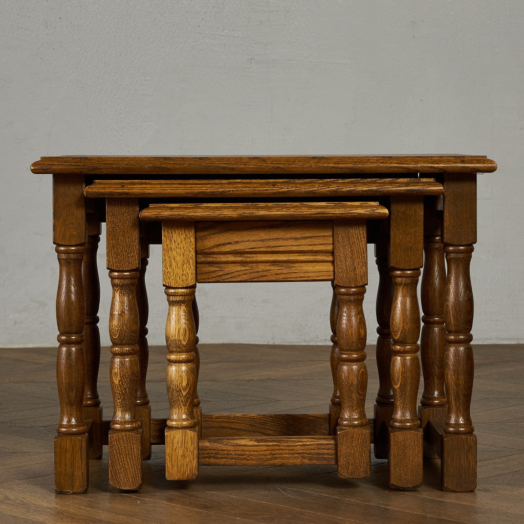 良質なオーク材を使用し、随所に美しいディテールを備えたネストテーブル。脚部に施された挽物細工が目を惹く、上質なお品です。
