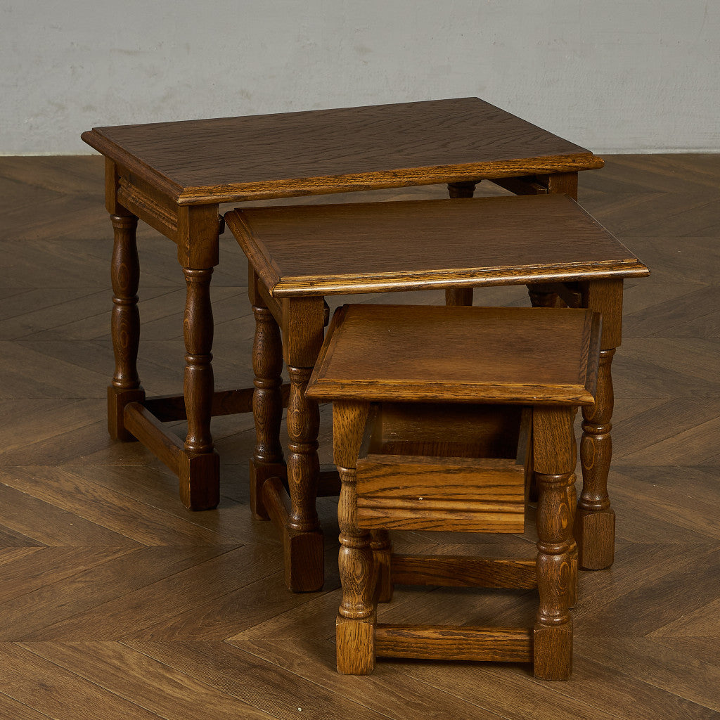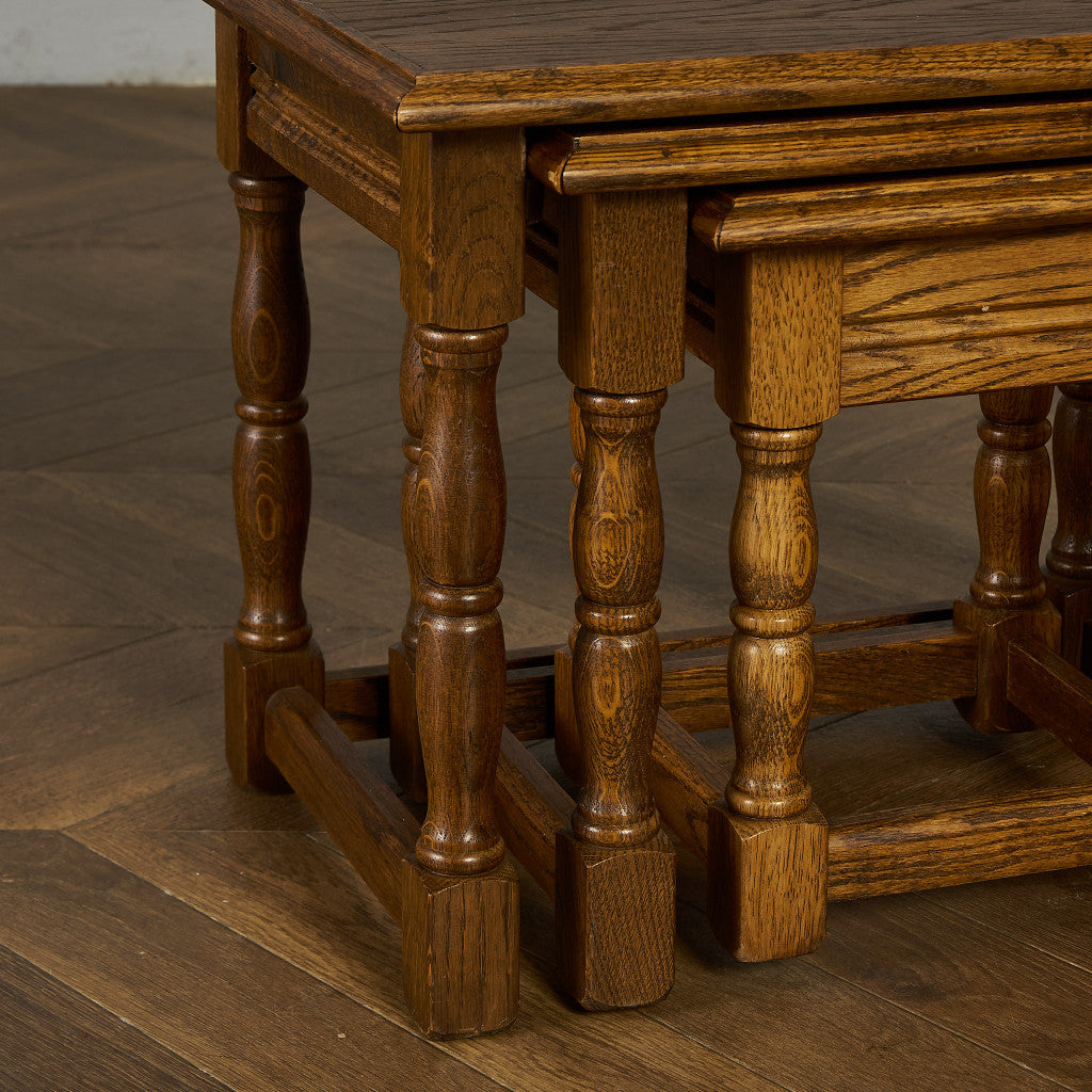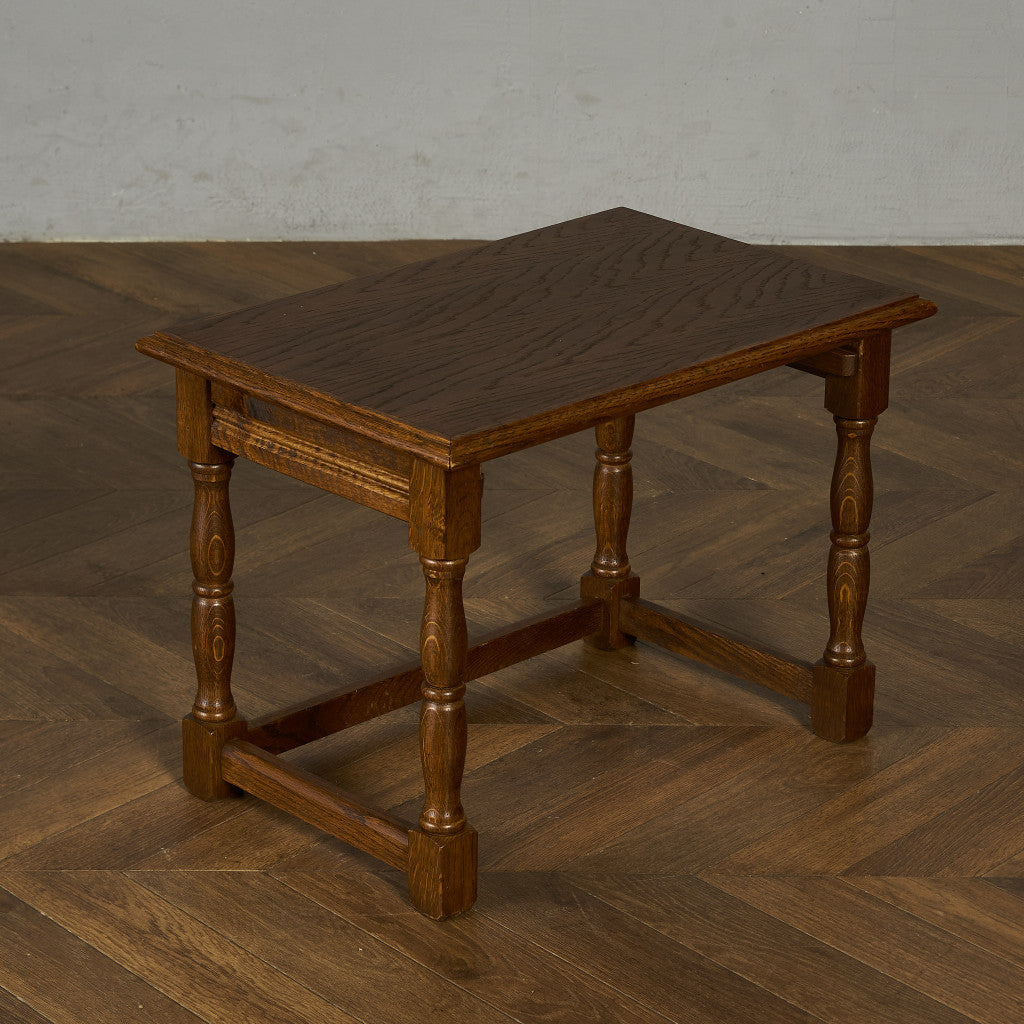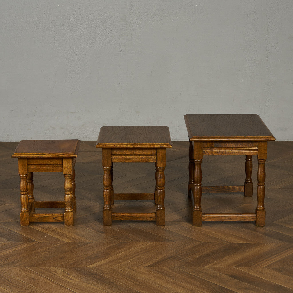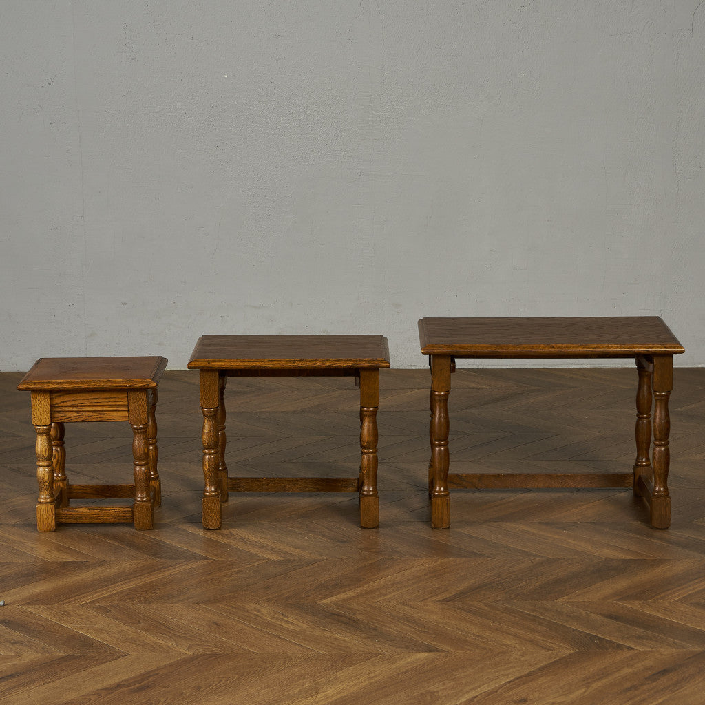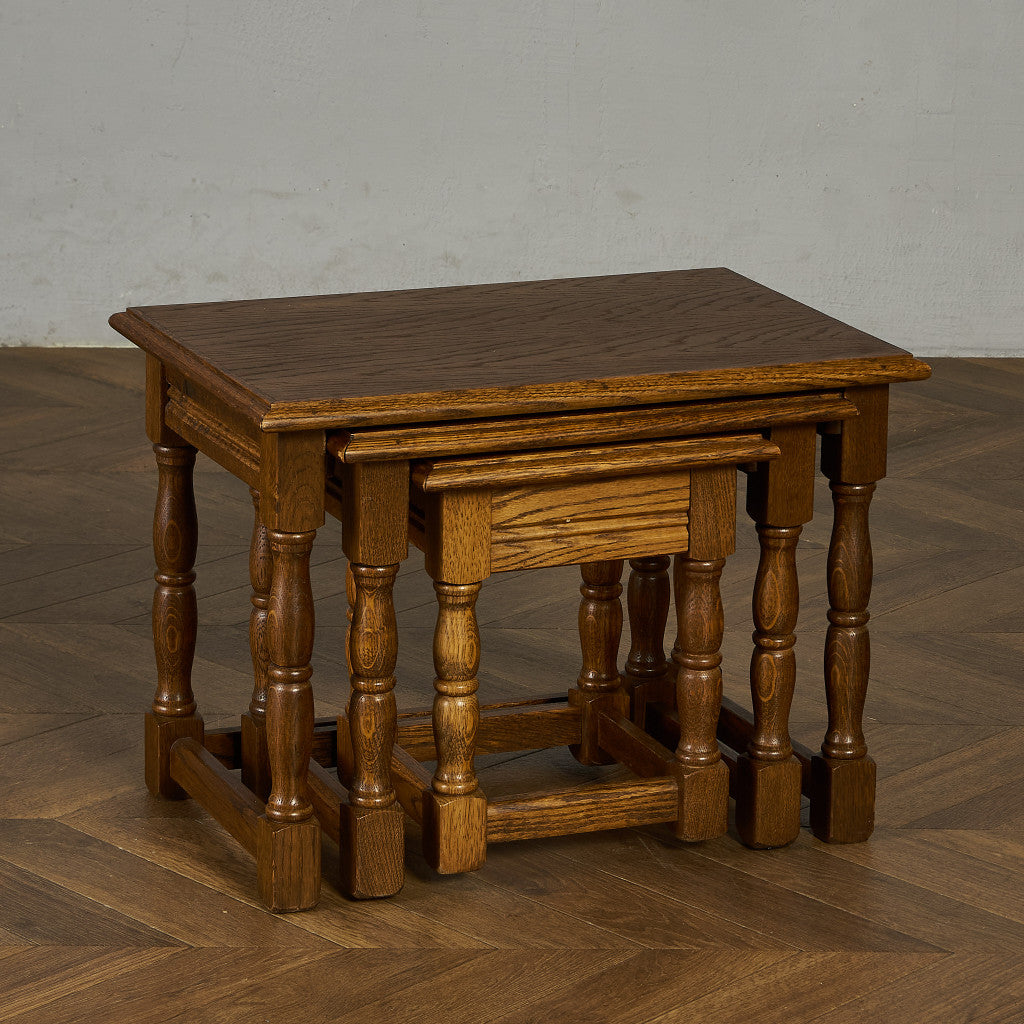 良質なオーク材を使用し、随所に美しいディテールを備えたネストテーブル。脚部に施された挽物細工が目を惹く、上質なお品です。