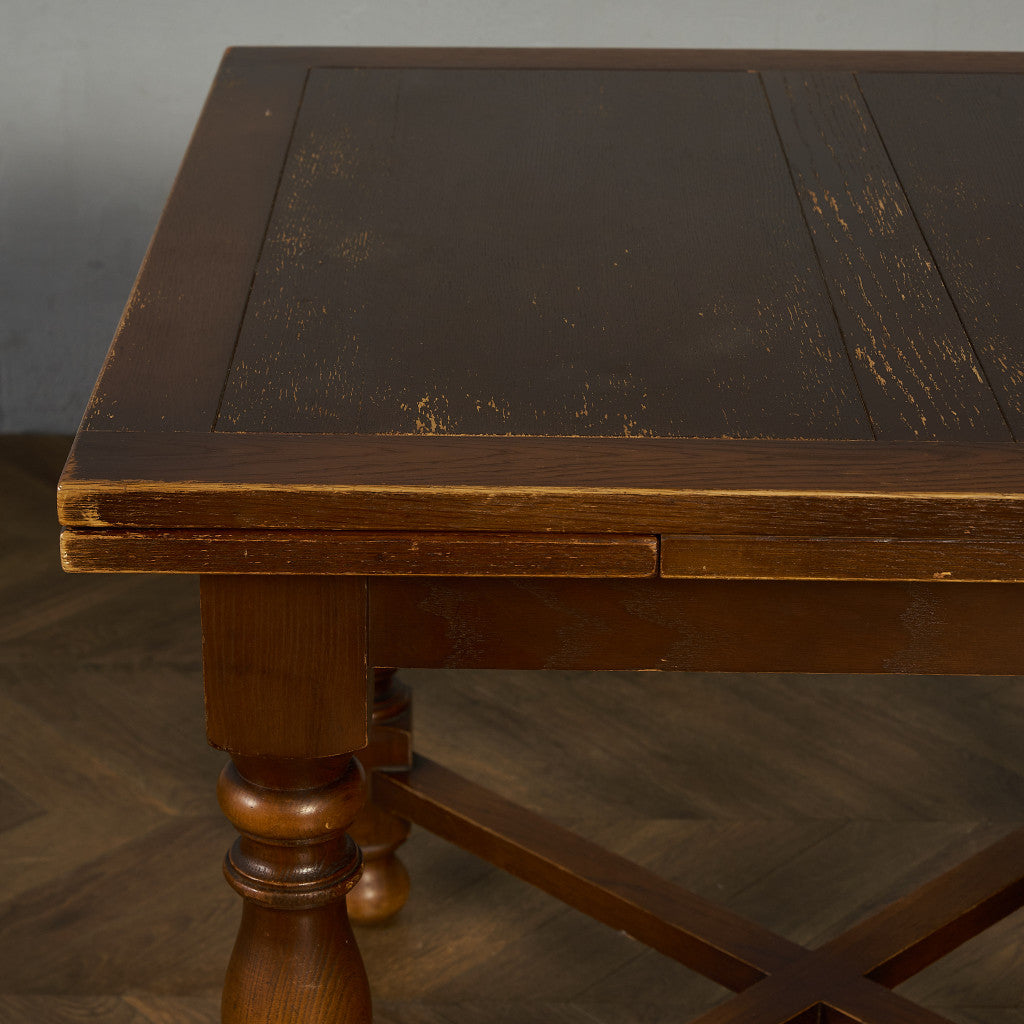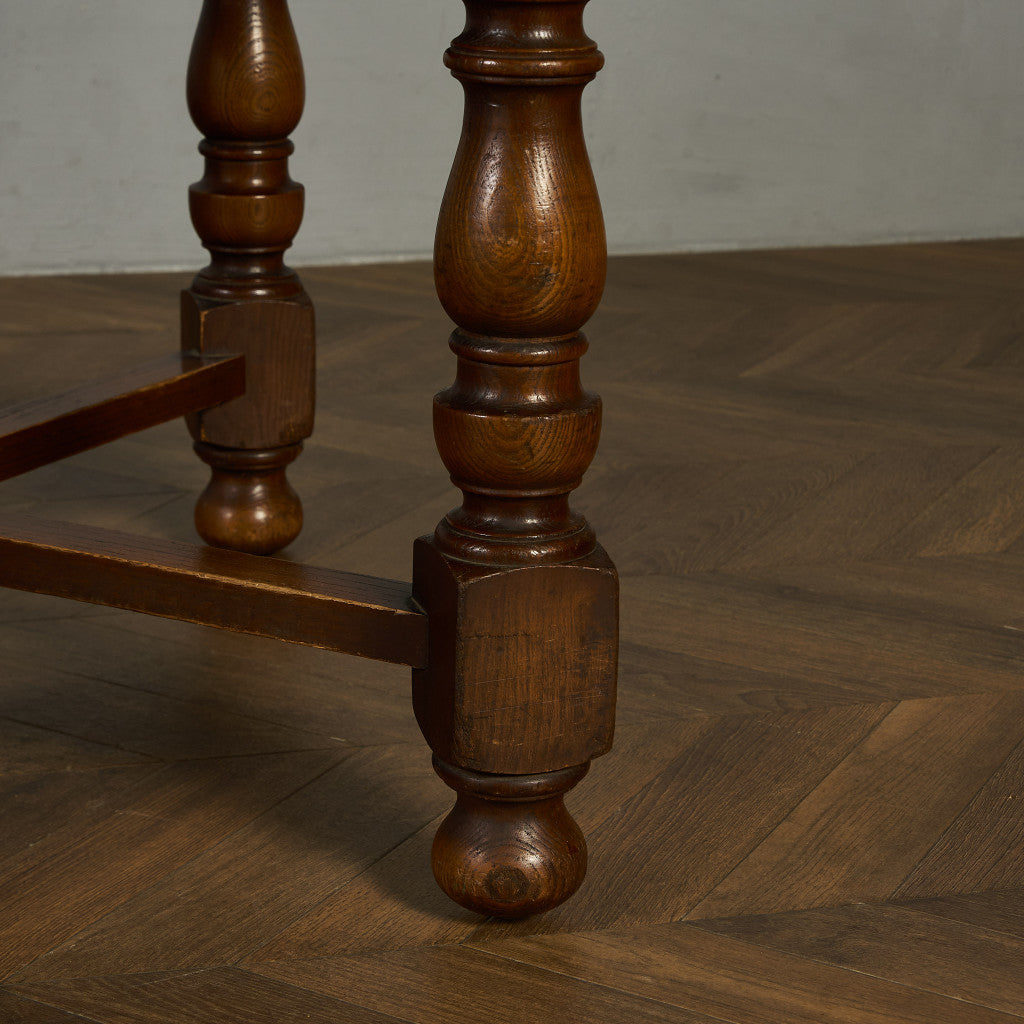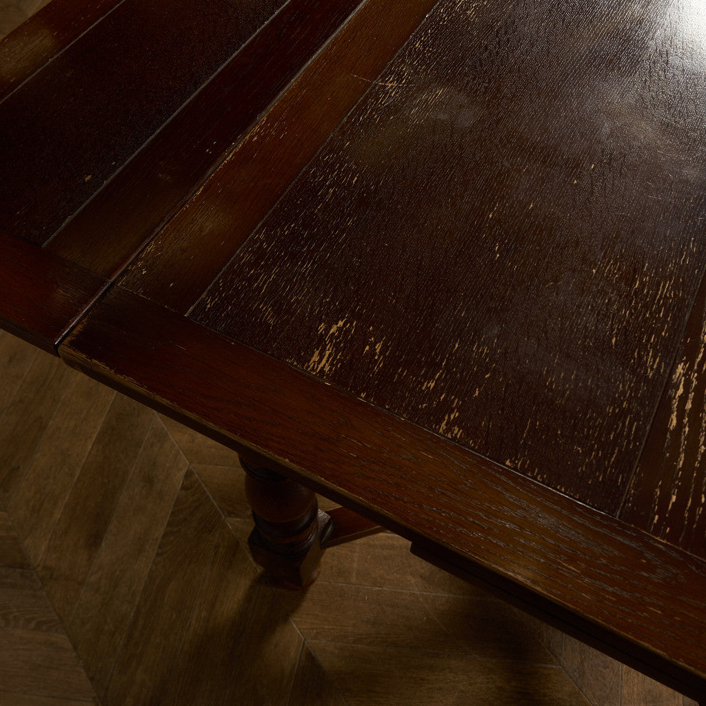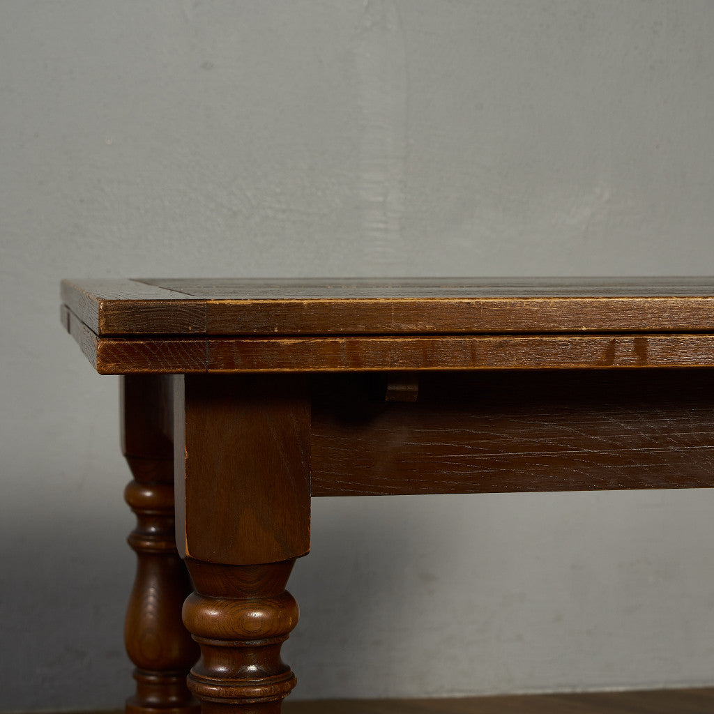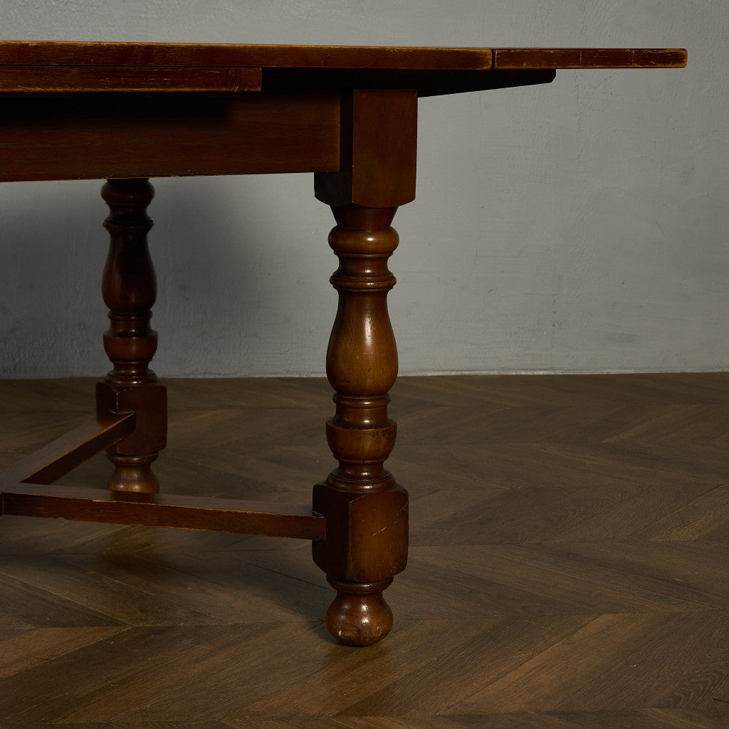 良質なオーク材を使用し、随所に美しいディテールを備えたドローリーフテーブル。趣ある挽物細工の脚や使い込まれた柔らかな木肌、飴色の落ち着いた色合いなど、ディテールの良さが際立つエレガントな佇まいが魅力です。