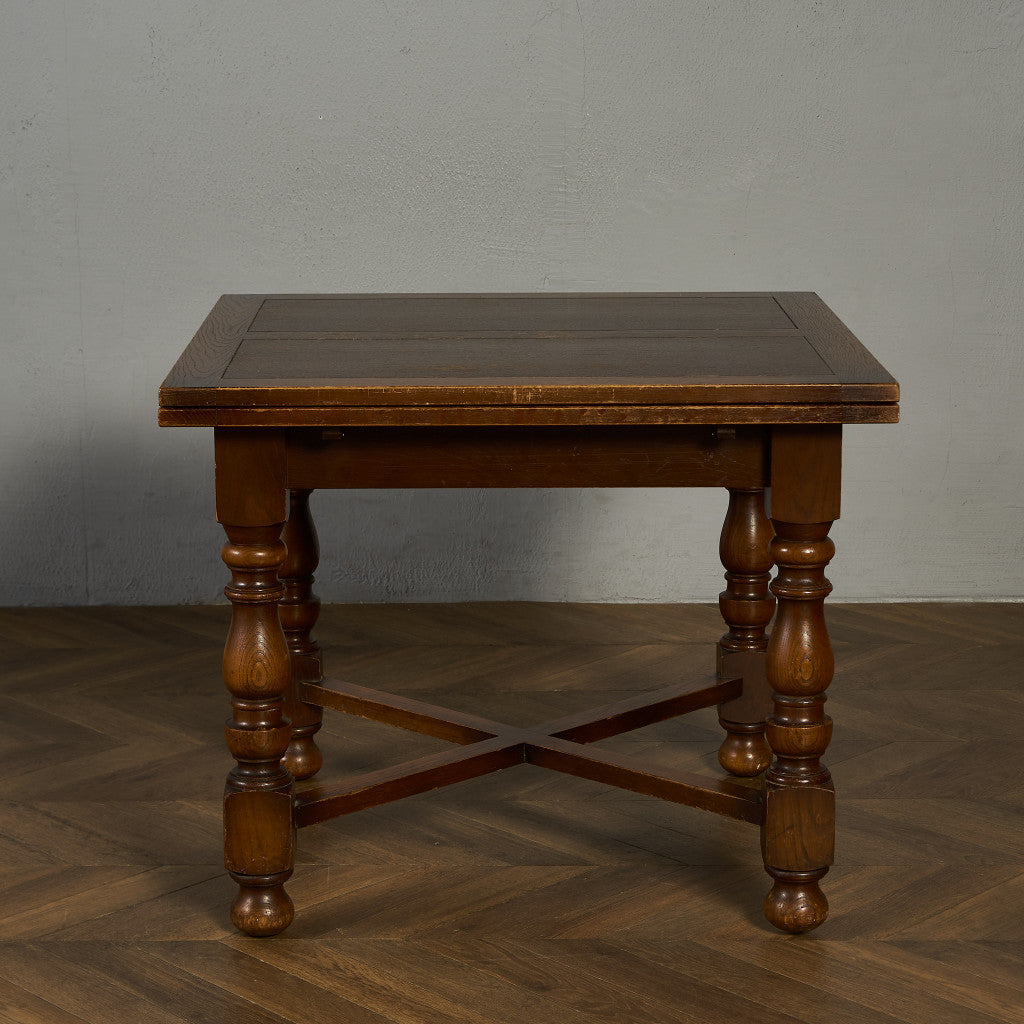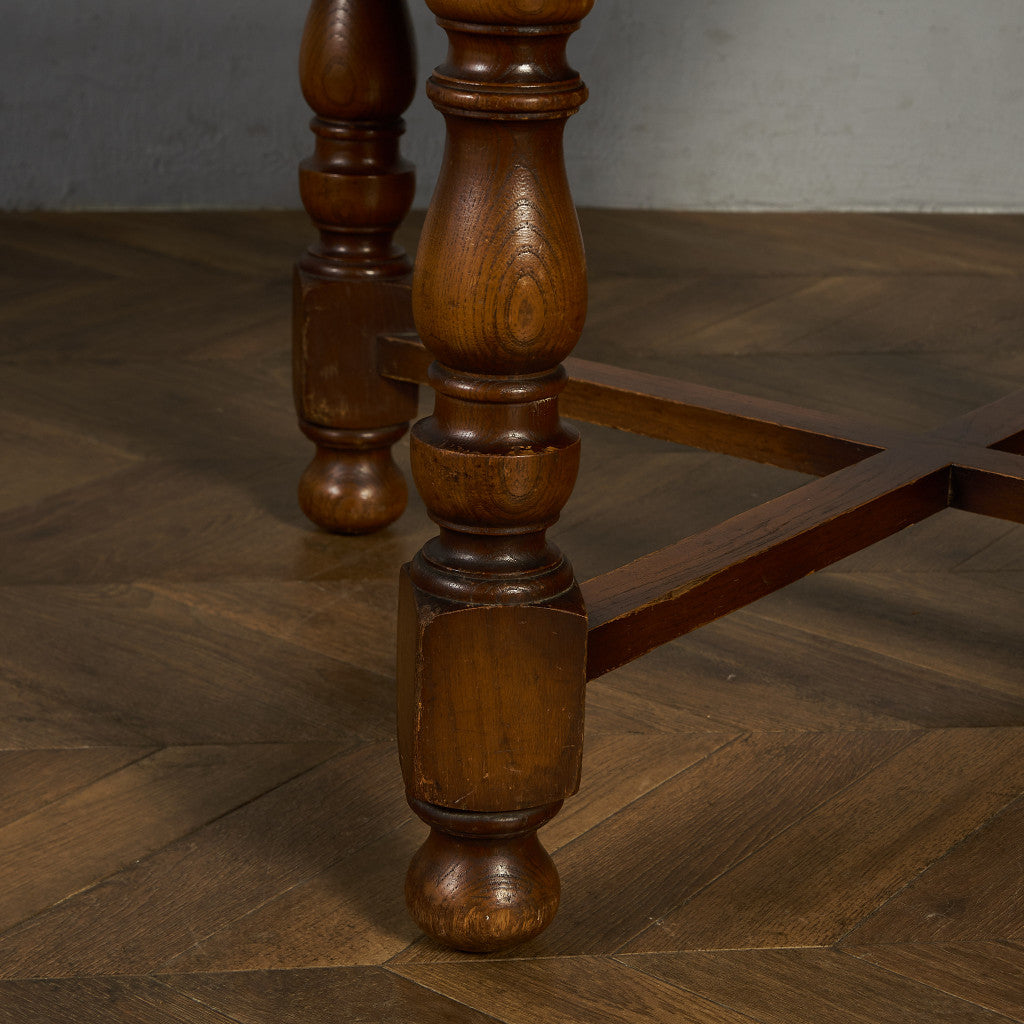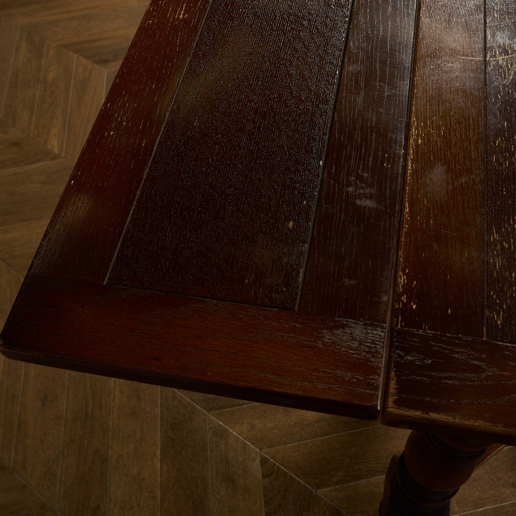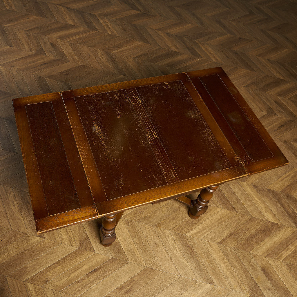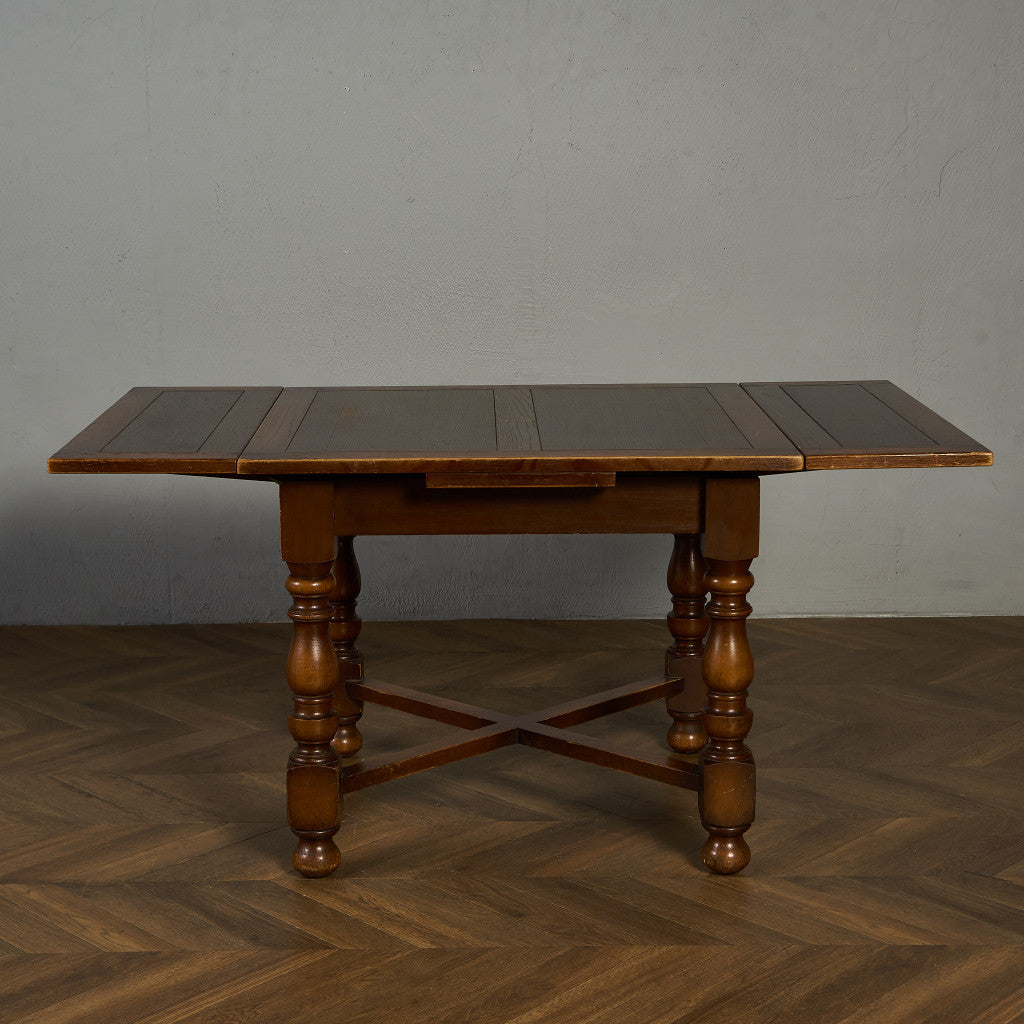 良質なオーク材を使用し、随所に美しいディテールを備えたドローリーフテーブル。趣ある挽物細工の脚や使い込まれた柔らかな木肌、飴色の落ち着いた色合いなど、ディテールの良さが際立つエレガントな佇まいが魅力です。