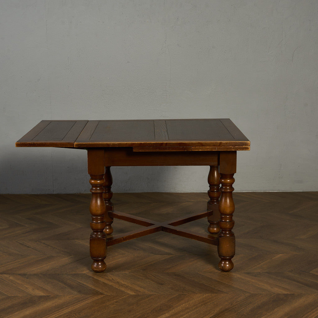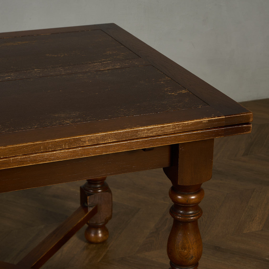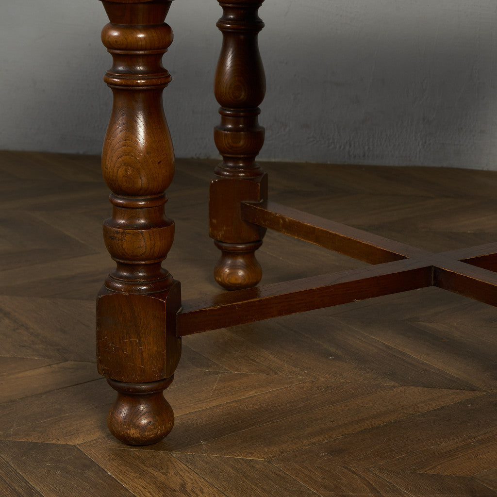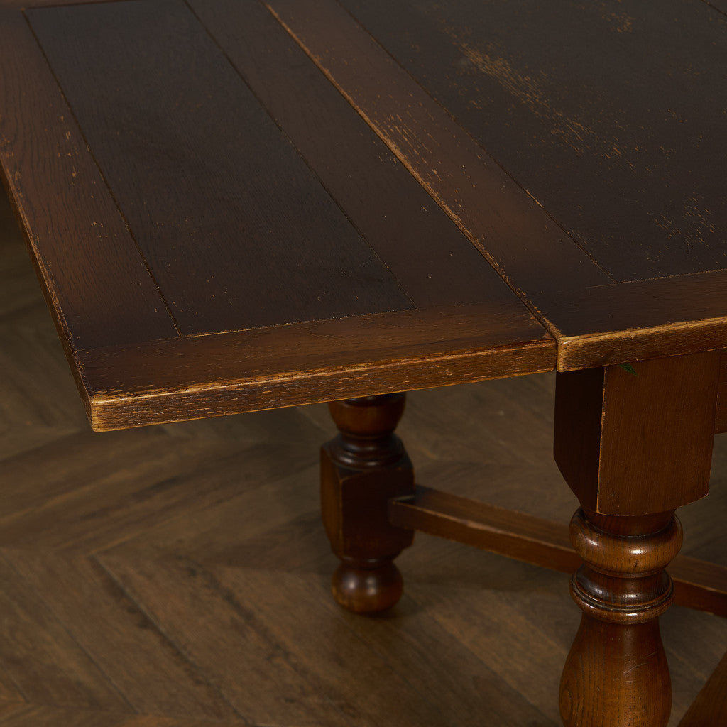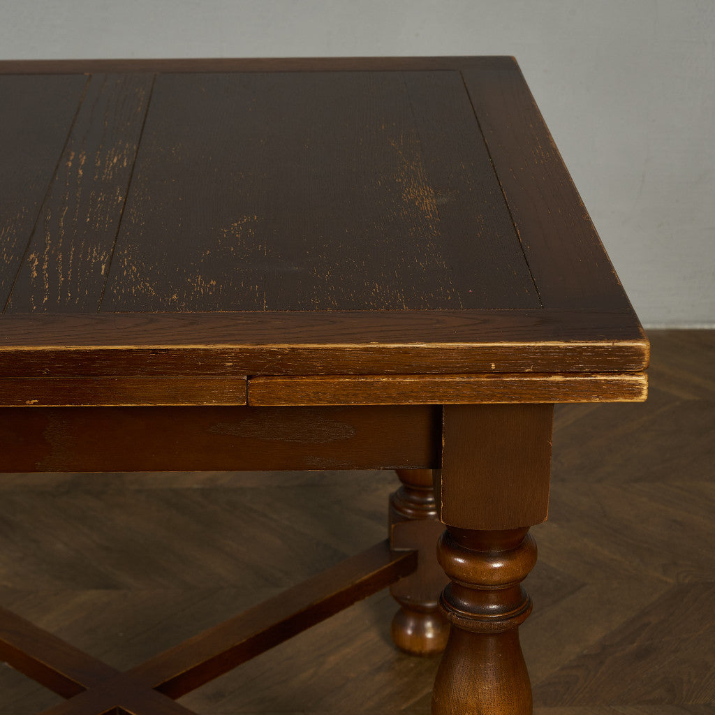 良質なオーク材を使用し、随所に美しいディテールを備えたドローリーフテーブル。趣ある挽物細工の脚や使い込まれた柔らかな木肌、飴色の落ち着いた色合いなど、ディテールの良さが際立つエレガントな佇まいが魅力です。