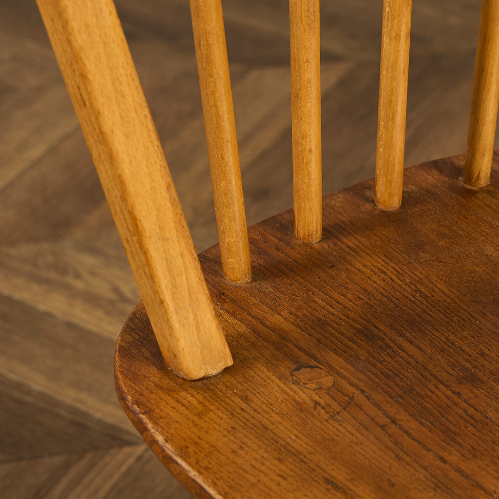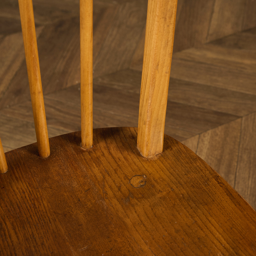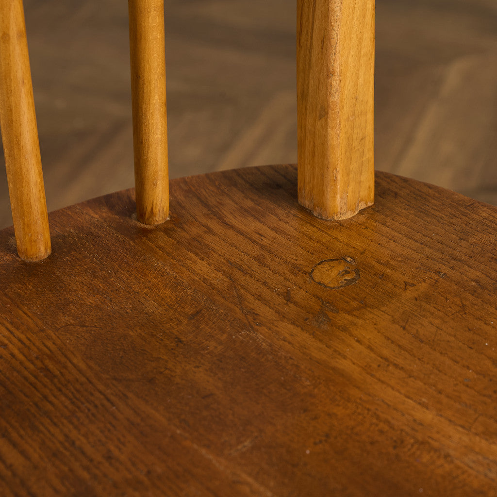 ERCOLのアイコン的存在であるウィンザーチェアシリーズの中で、最もオーソドックスなスタイルのフープバックチェアは「ボウバック(弓型の背もたれ)」という、クラシカルなデザインをベースに作られています。様々なバージョンがあり、背もたれのスポーク数が4本、5本、6本の3タイプ、座面はノーマル型とバイオリン型の2タイプ、大きさはノーマルサイズとラージサイズがあり、さらに6本スポークのチェアにはストレートレッグやアーム付きなどが存在し、その種類の豊富さもコレクター心をくすぐる大きな魅力となっています。特にスポーク5本タイプは流通量が少なく、希少性の高いアイテムです。