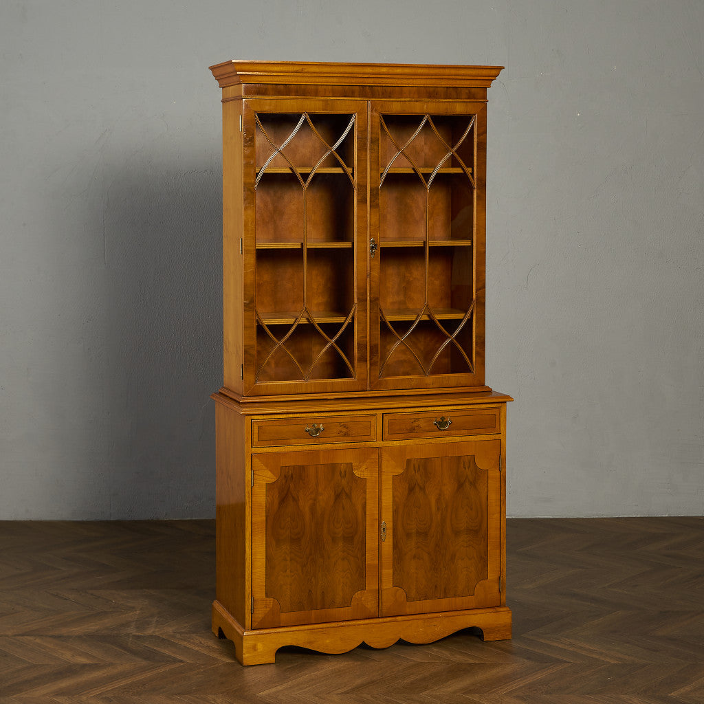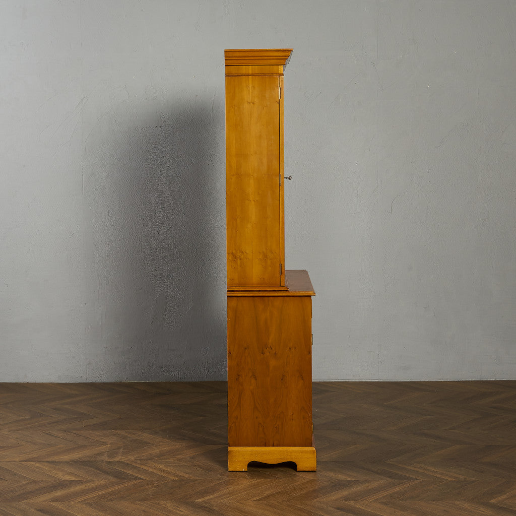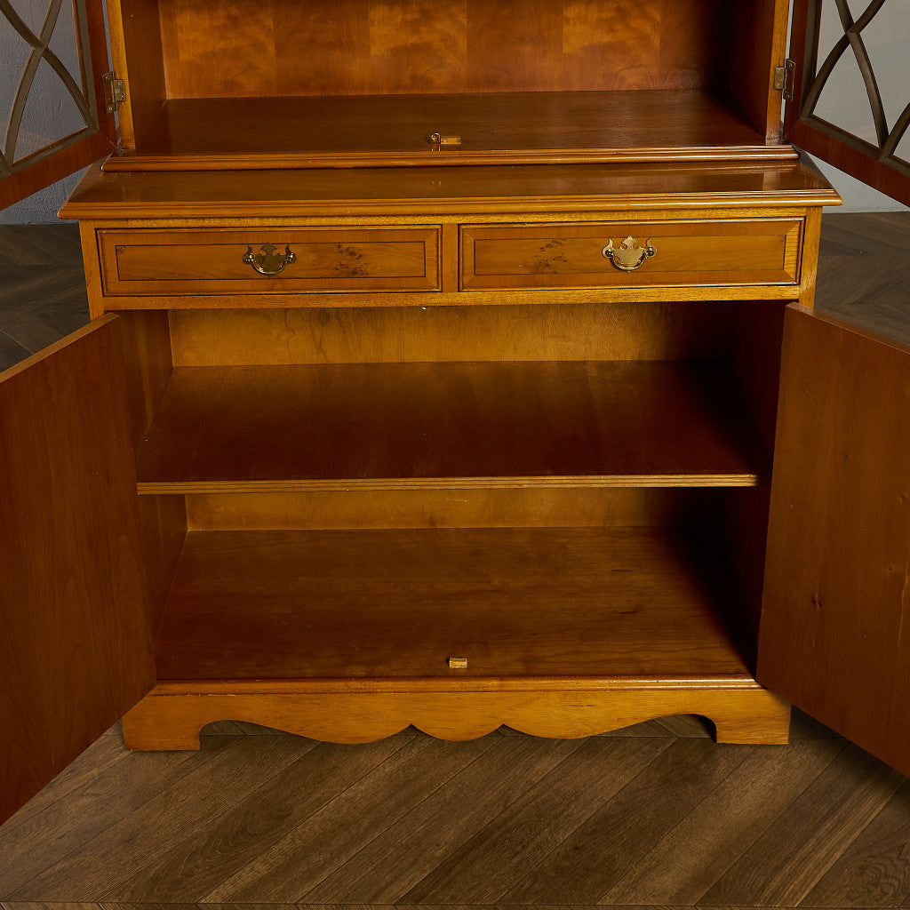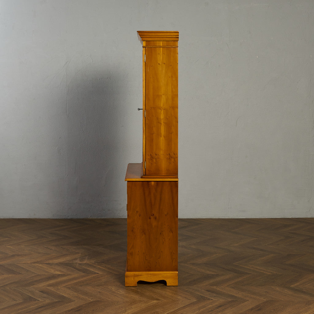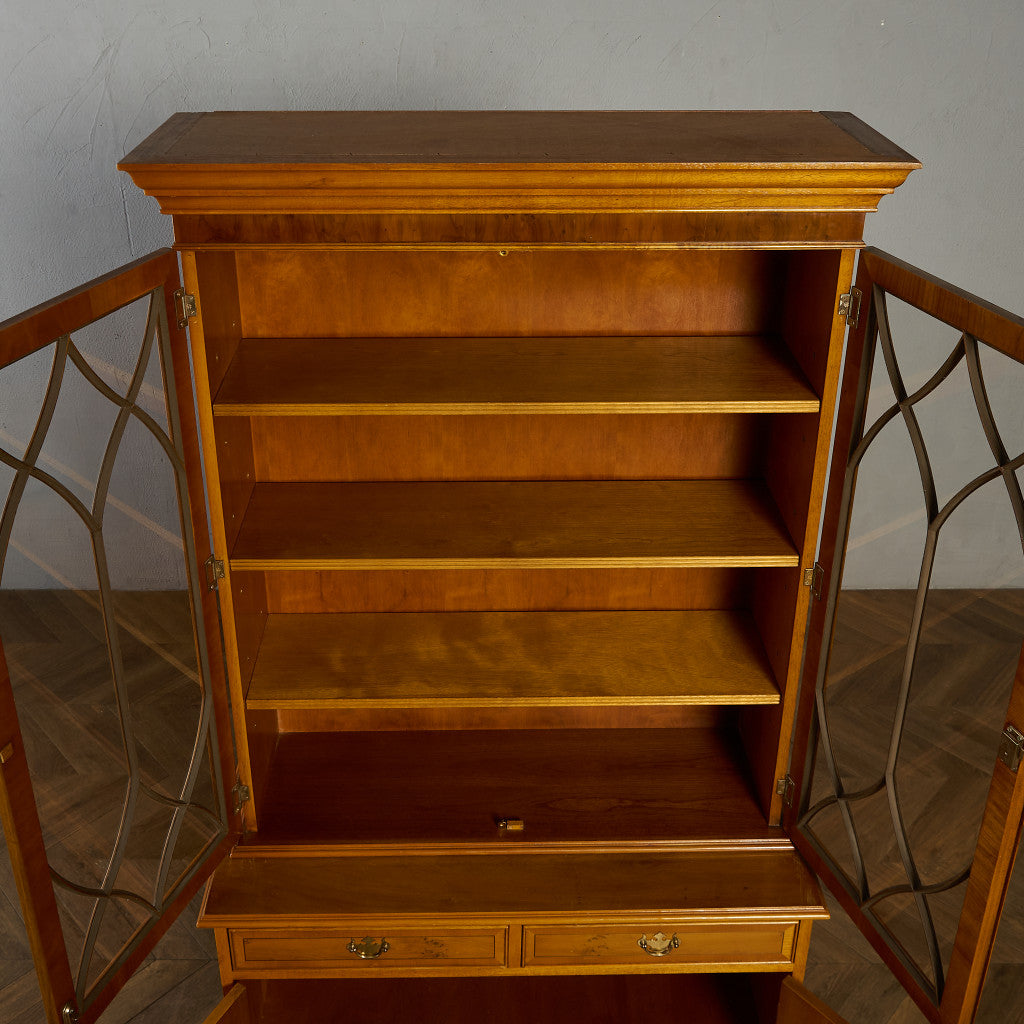 扉部分はシノワズリを思わせる美しい飾り格子、モールディングや象嵌など全体的にエドワーディアン様式の特徴が現れています。美しい木目のイチイ材を使用した外観は荘厳な出で立ちでお部屋の雰囲気をぐっと格調高いものに演出してくれます。コレクションを飾る飾り棚や食器棚、本棚として使える大容量のキャビネットです
