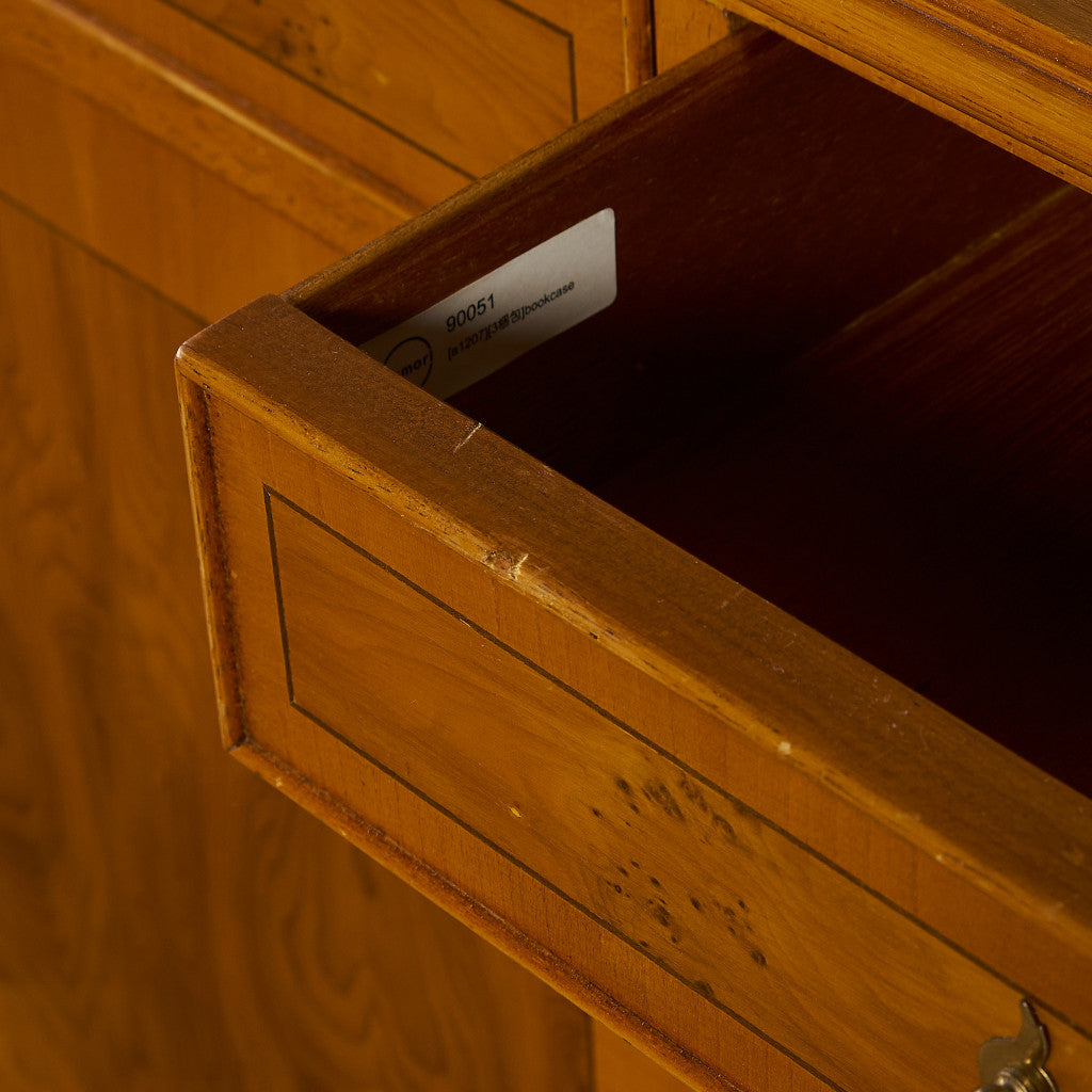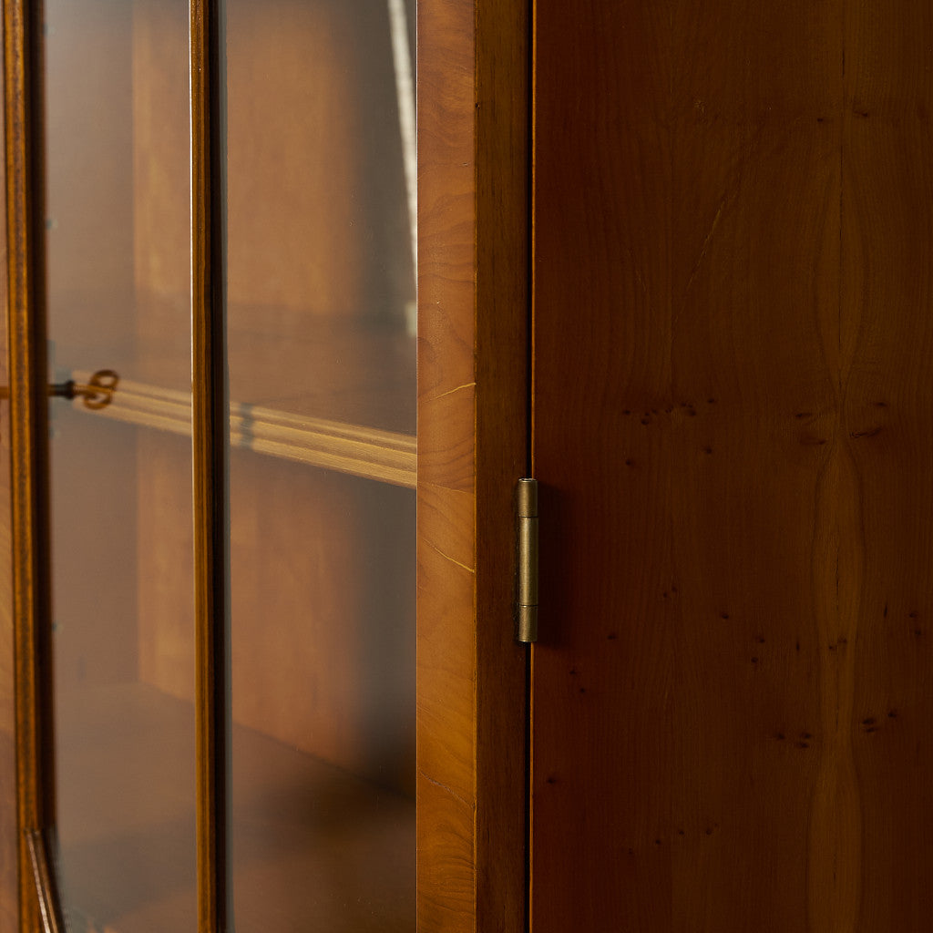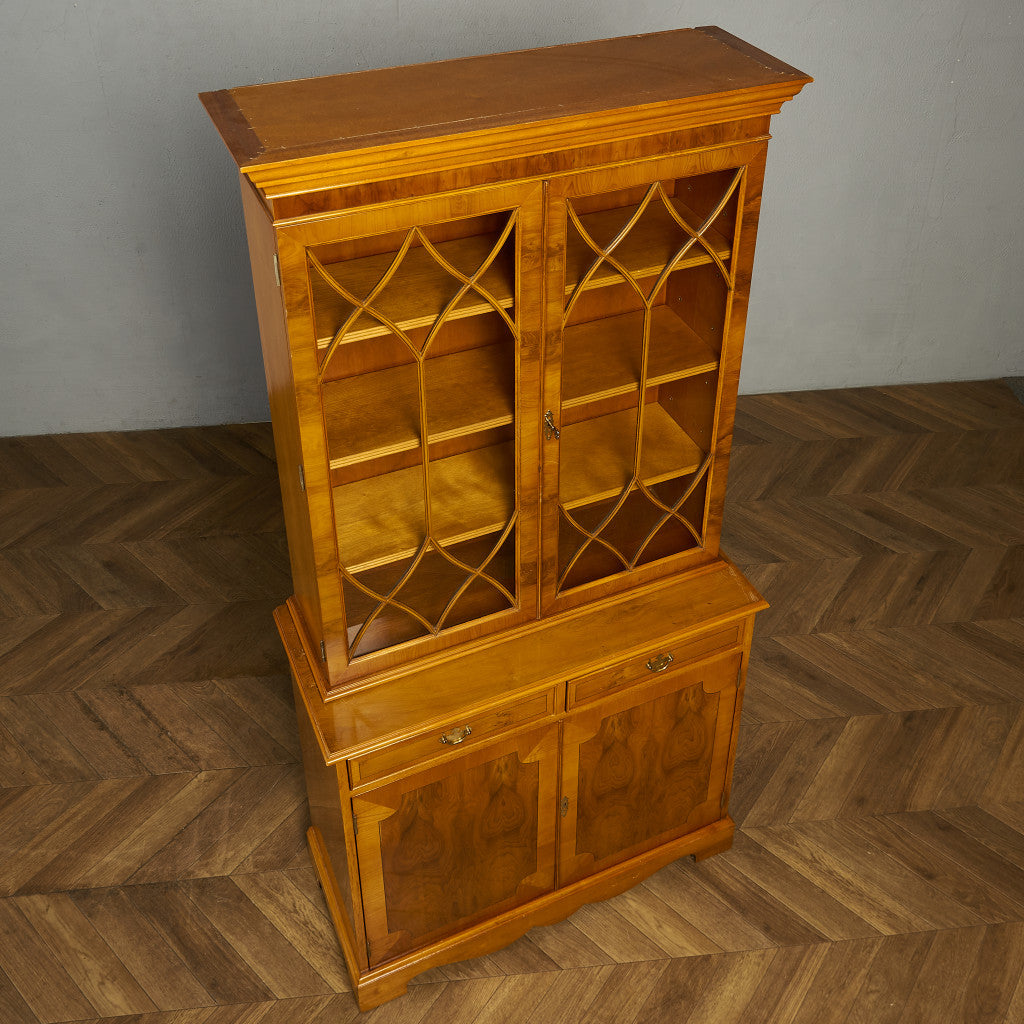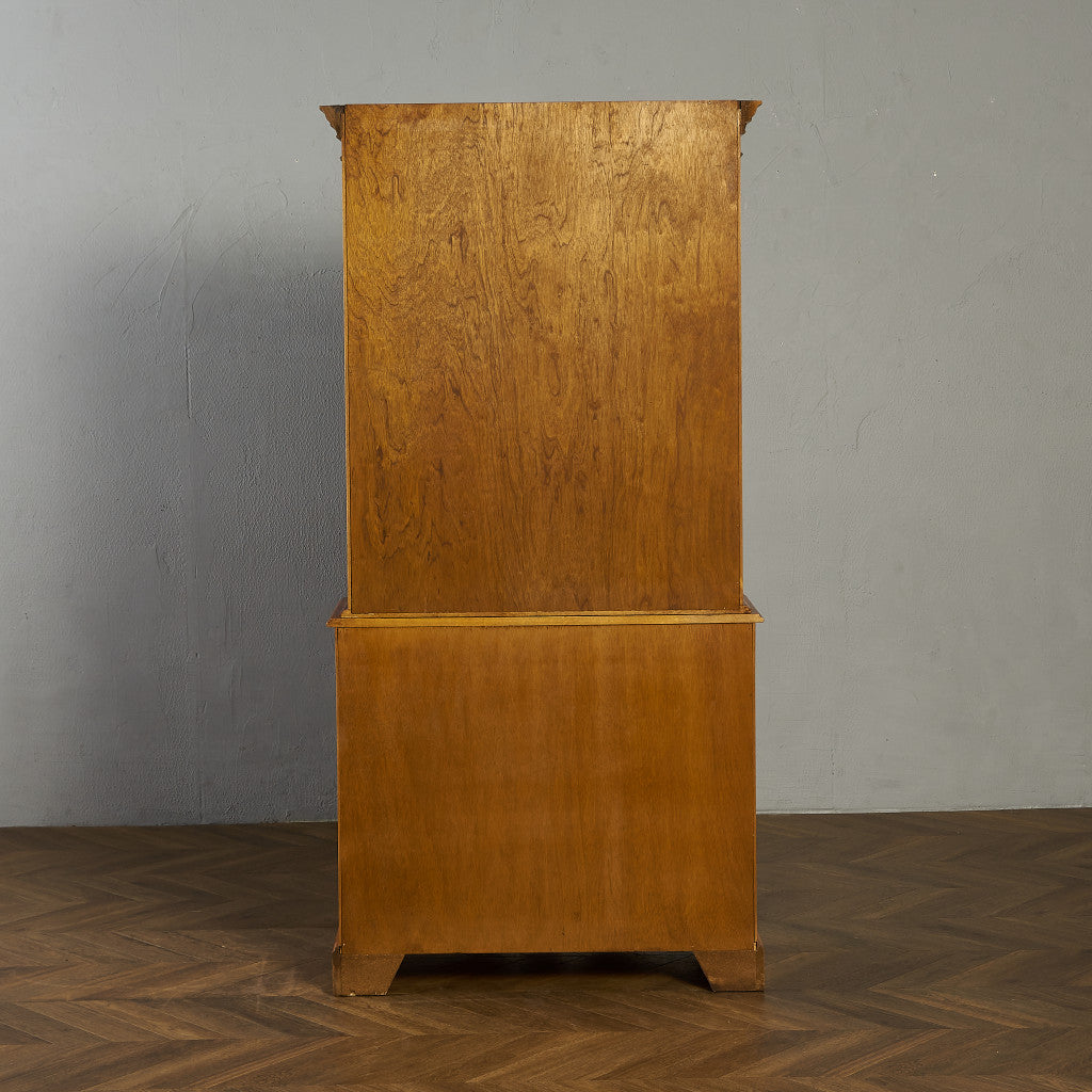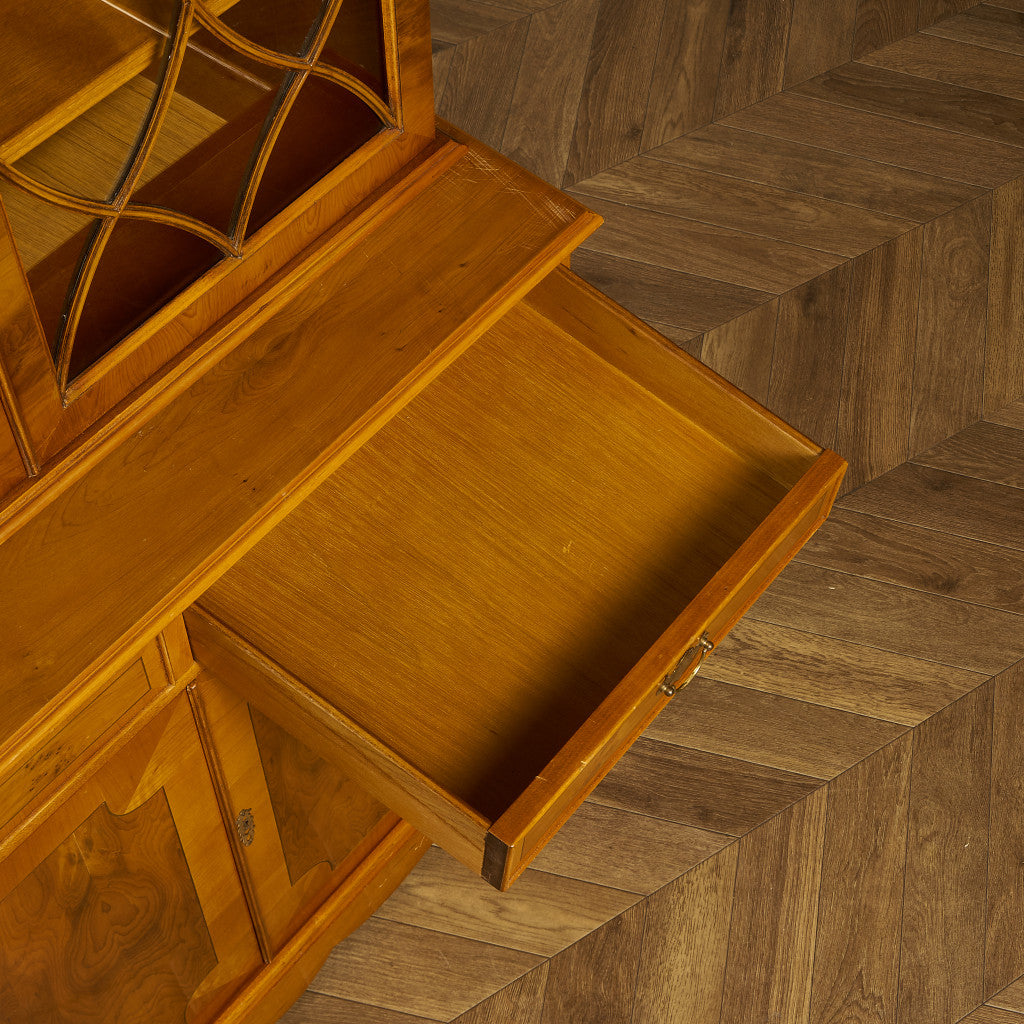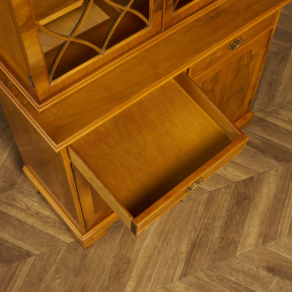 扉部分はシノワズリを思わせる美しい飾り格子、モールディングや象嵌など全体的にエドワーディアン様式の特徴が現れています。美しい木目のイチイ材を使用した外観は荘厳な出で立ちでお部屋の雰囲気をぐっと格調高いものに演出してくれます。コレクションを飾る飾り棚や食器棚、本棚として使える大容量のキャビネットです