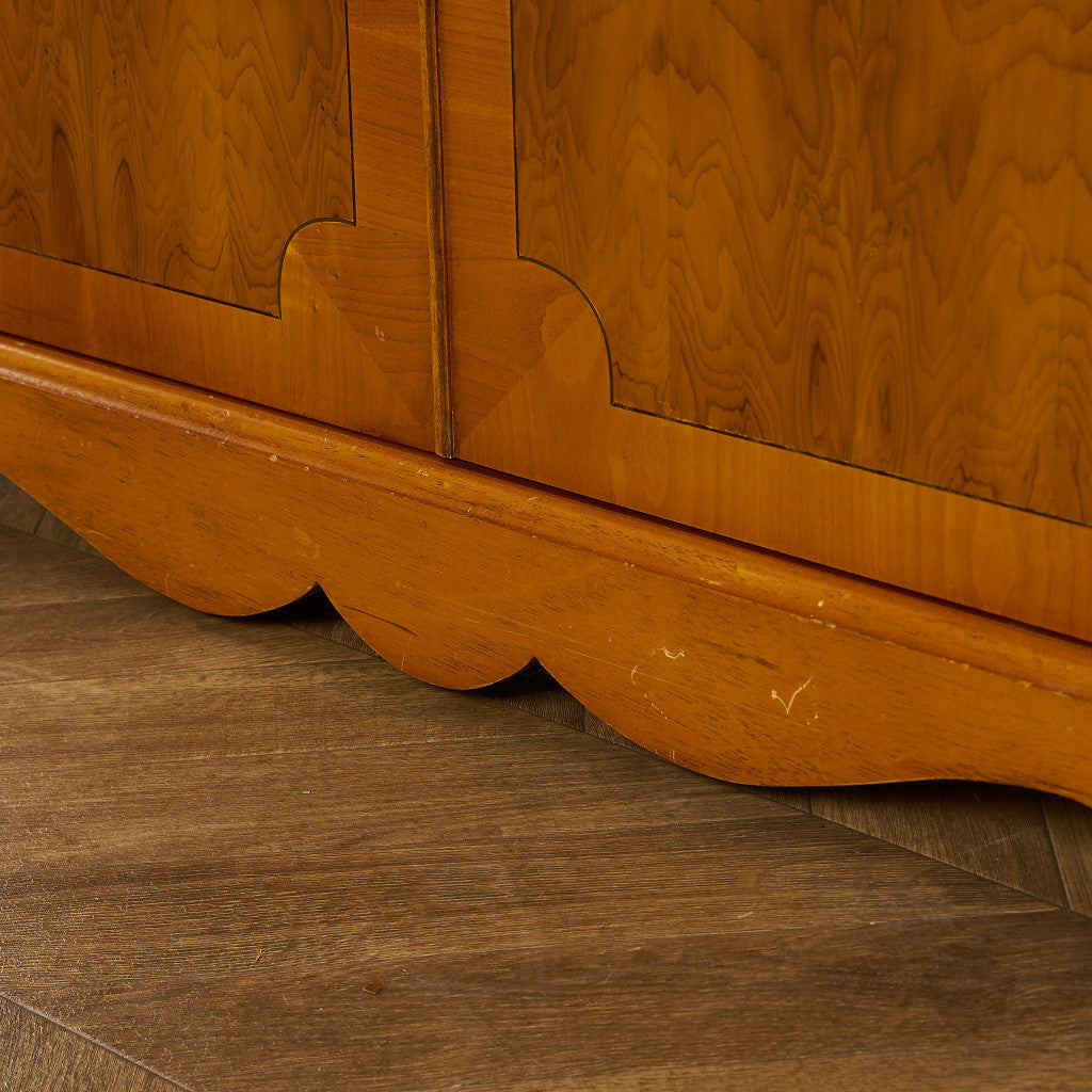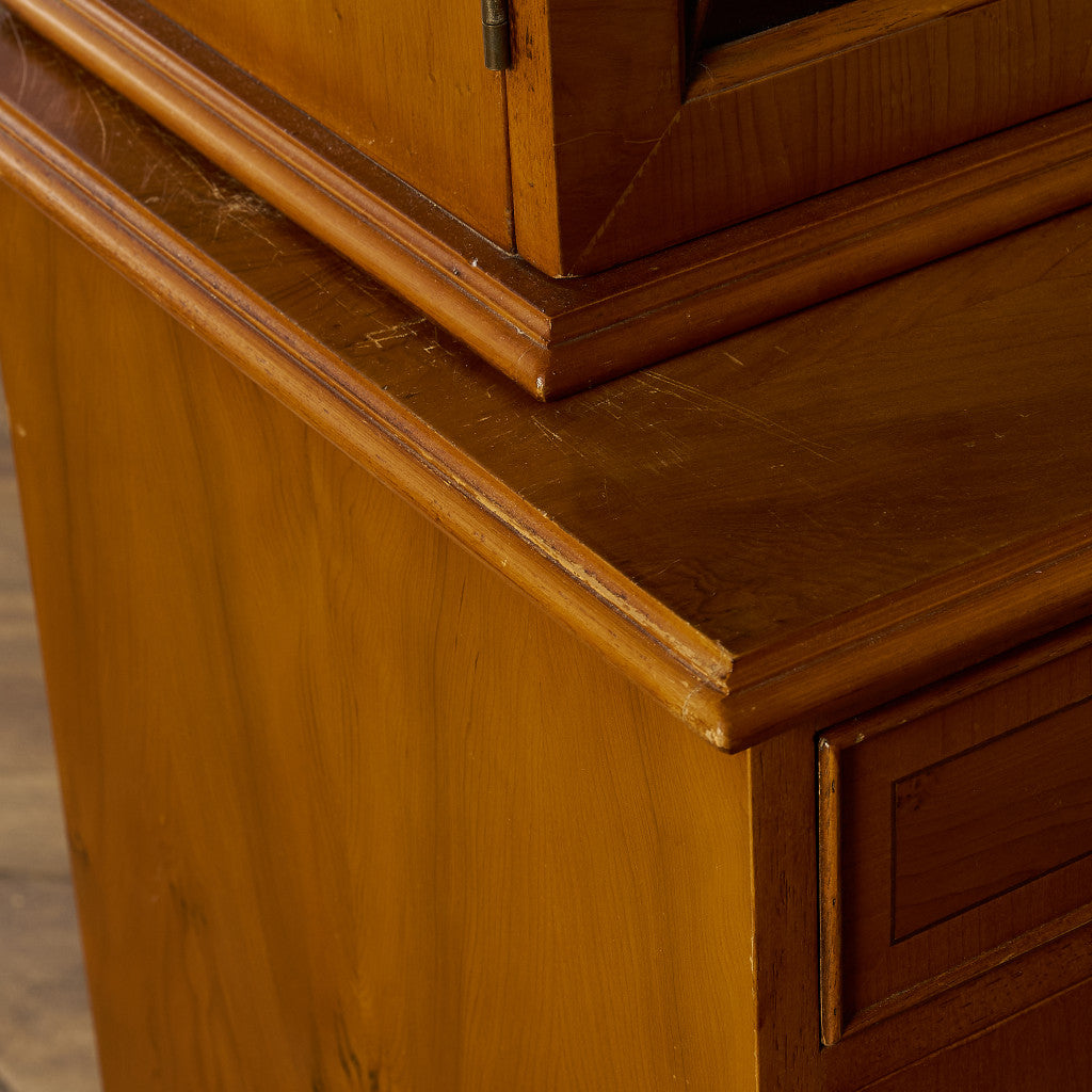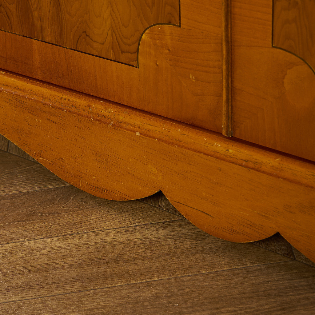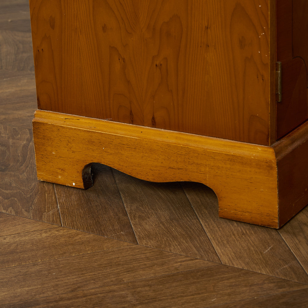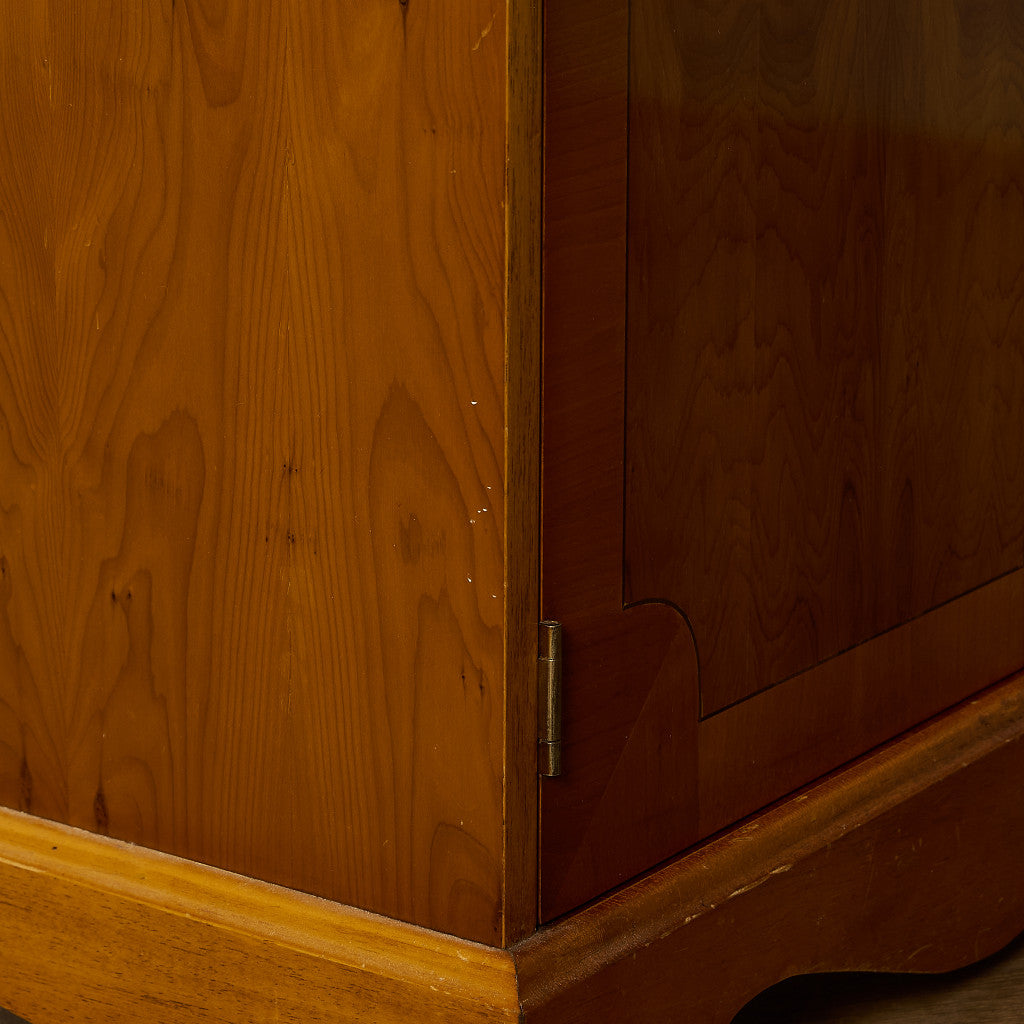 扉部分はシノワズリを思わせる美しい飾り格子、モールディングや象嵌など全体的にエドワーディアン様式の特徴が現れています。美しい木目のイチイ材を使用した外観は荘厳な出で立ちでお部屋の雰囲気をぐっと格調高いものに演出してくれます。コレクションを飾る飾り棚や食器棚、本棚として使える大容量のキャビネットです