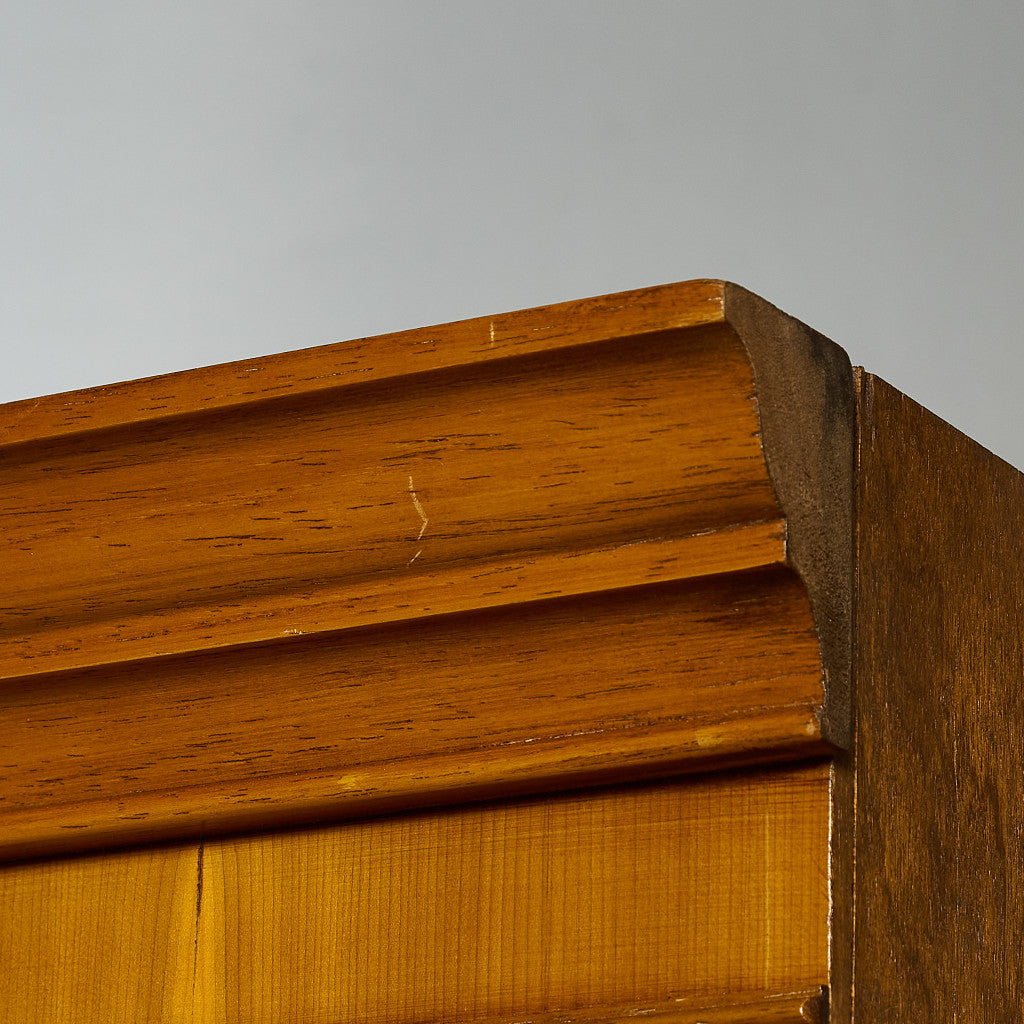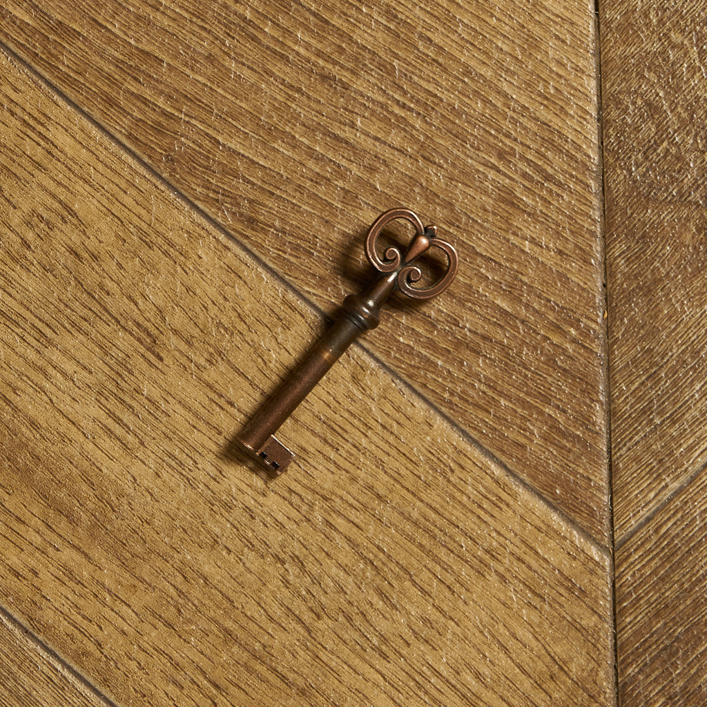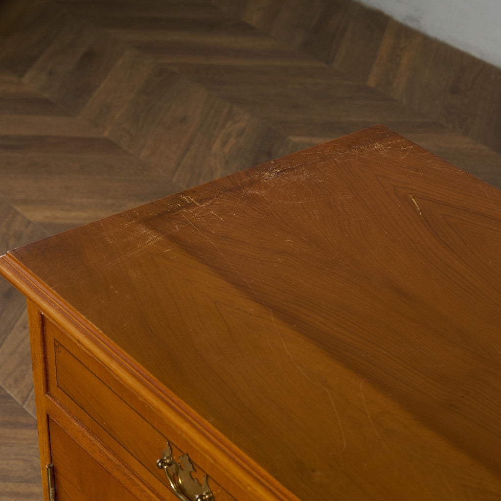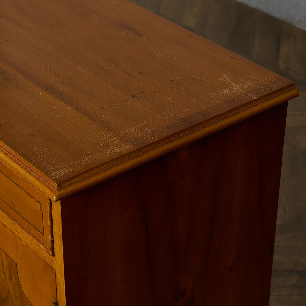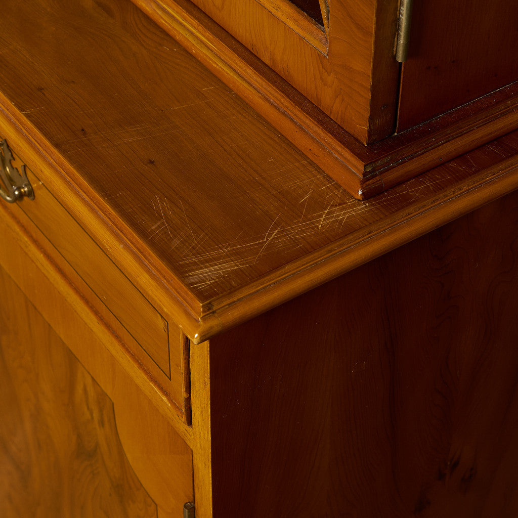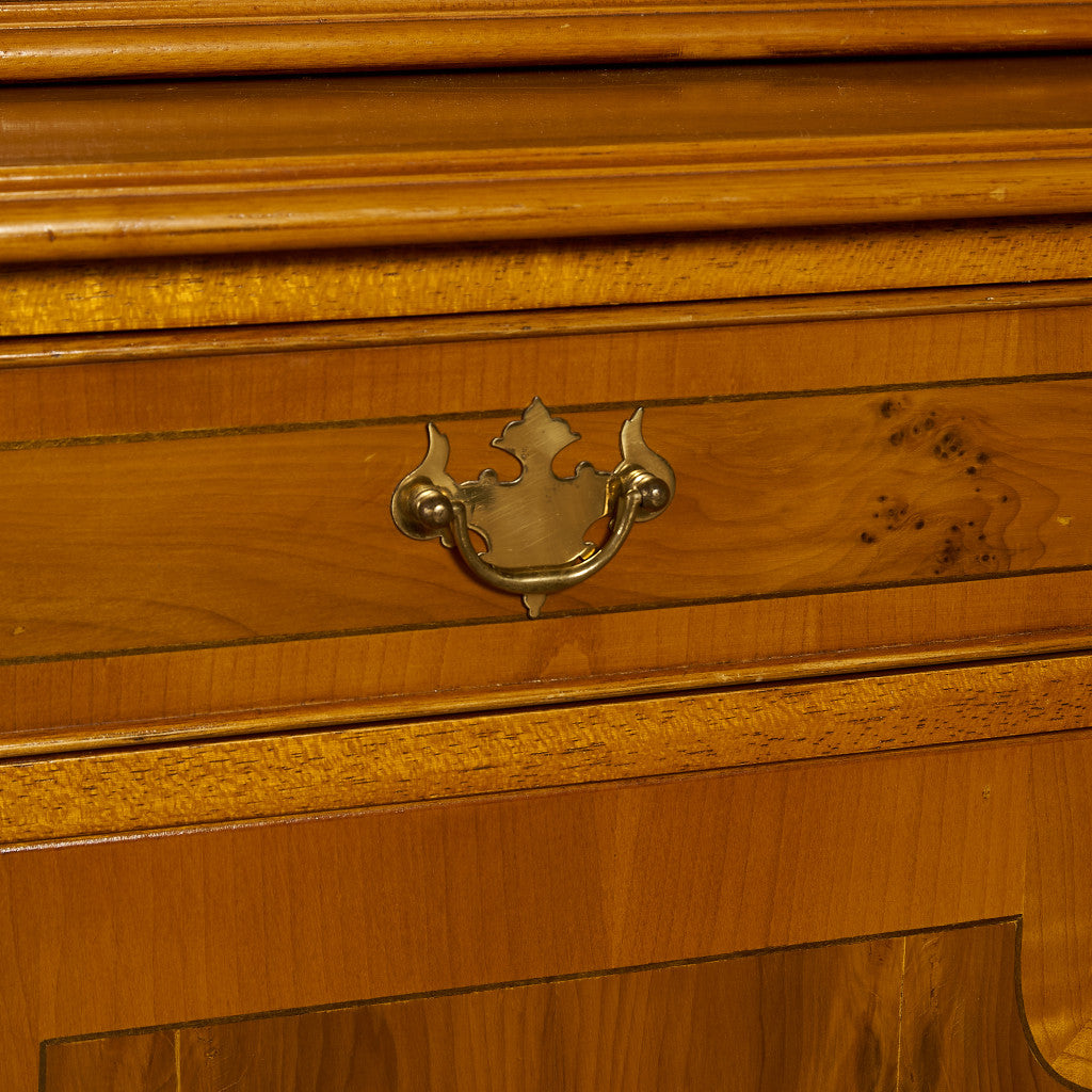 扉部分はシノワズリを思わせる美しい飾り格子、モールディングや象嵌など全体的にエドワーディアン様式の特徴が現れています。美しい木目のイチイ材を使用した外観は荘厳な出で立ちでお部屋の雰囲気をぐっと格調高いものに演出してくれます。コレクションを飾る飾り棚や食器棚、本棚として使える大容量のキャビネットです