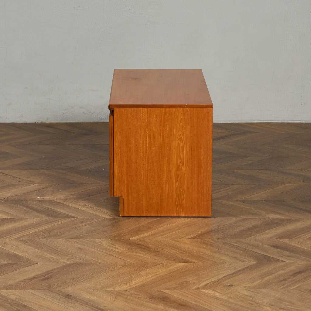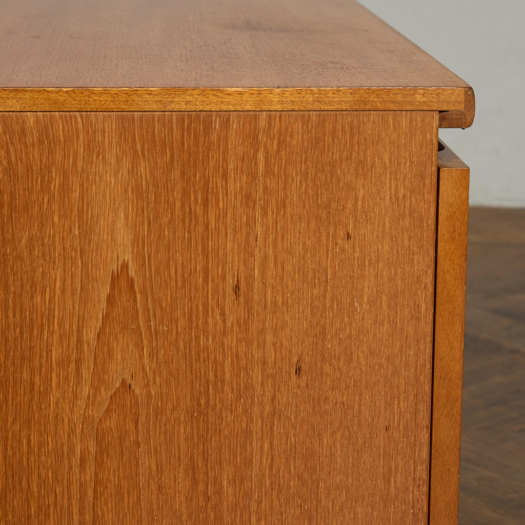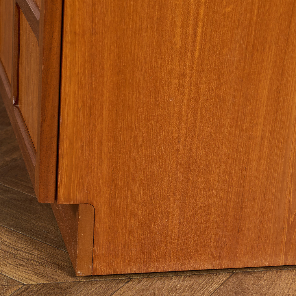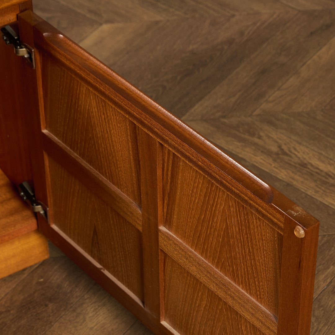 ヴィンテージチークのあたたかな質感と、少しクラシック家具寄りの前面扉框構造が印象的。洗練された手の込んだ英国らしいお品で、G-PLANやMcIntoshと比べて流通が少ないこともコレクター心をくすぐります。