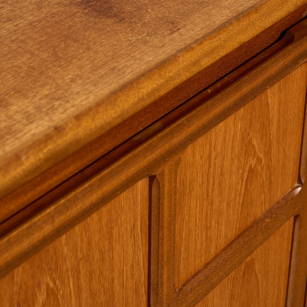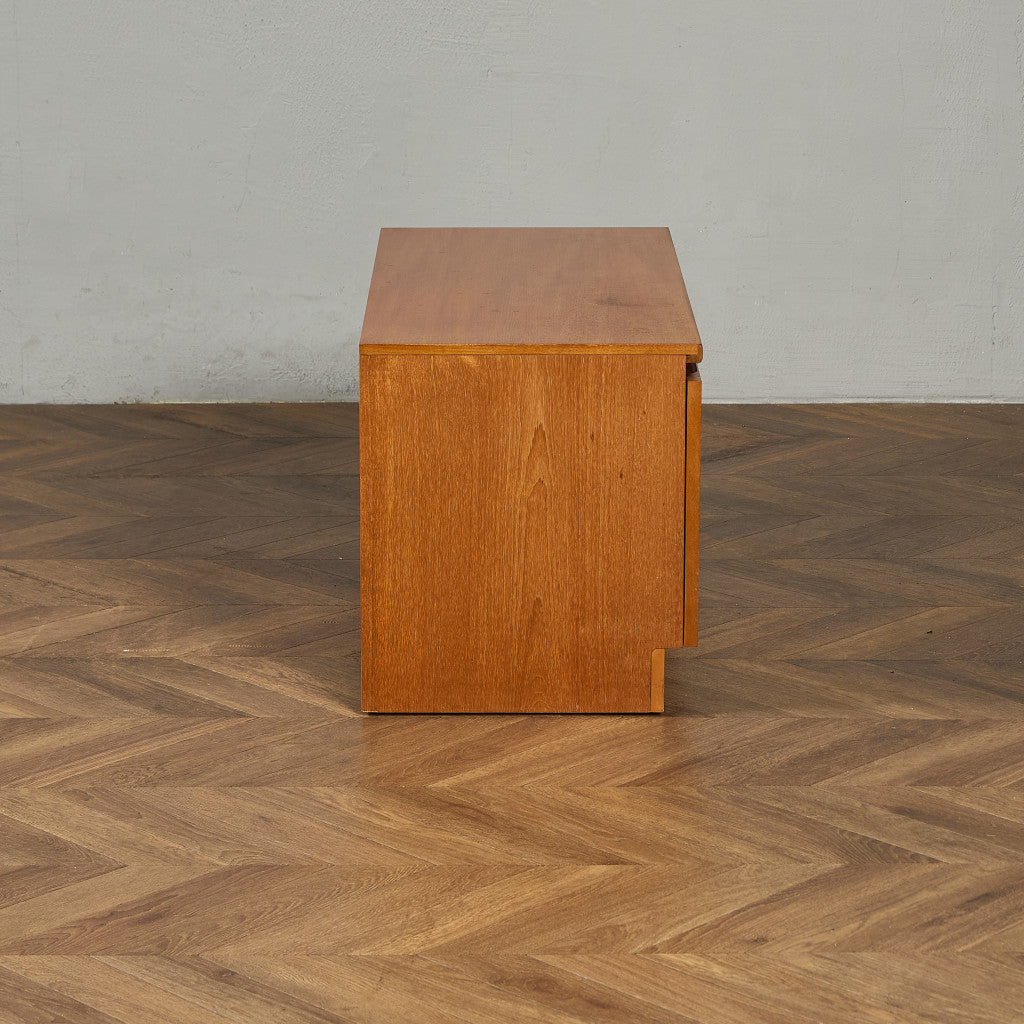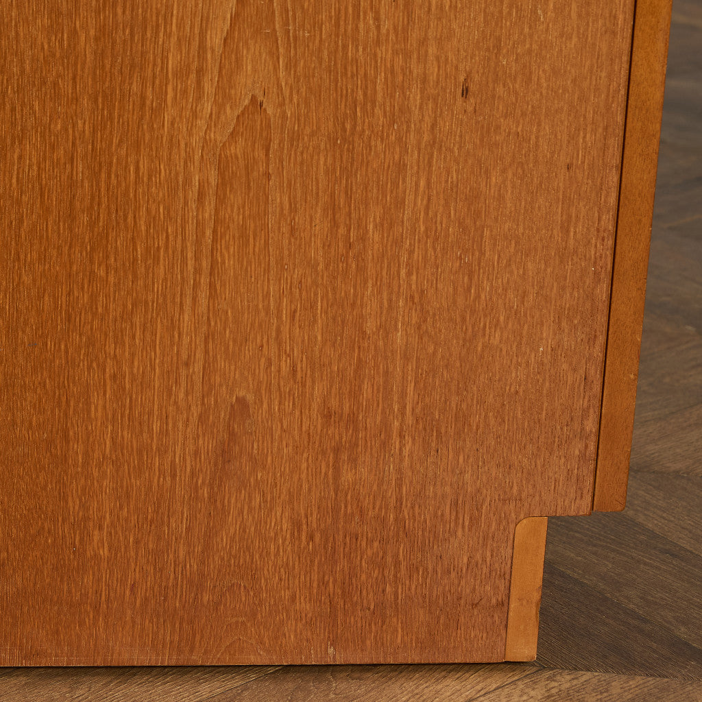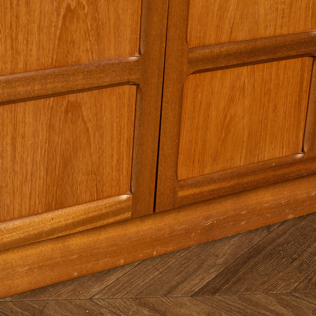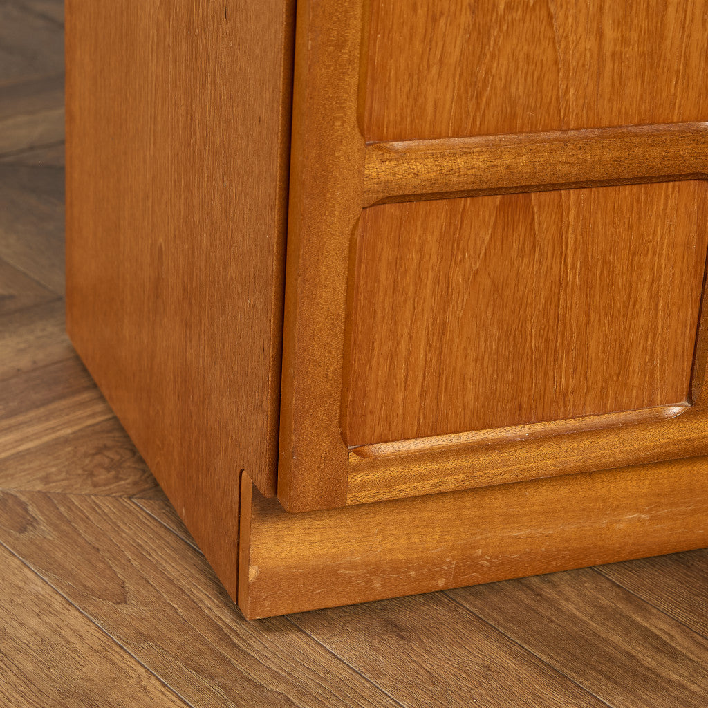 ヴィンテージチークのあたたかな質感と、少しクラシック家具寄りの前面扉框構造が印象的。洗練された手の込んだ英国らしいお品で、G-PLANやMcIntoshと比べて流通が少ないこともコレクター心をくすぐります。