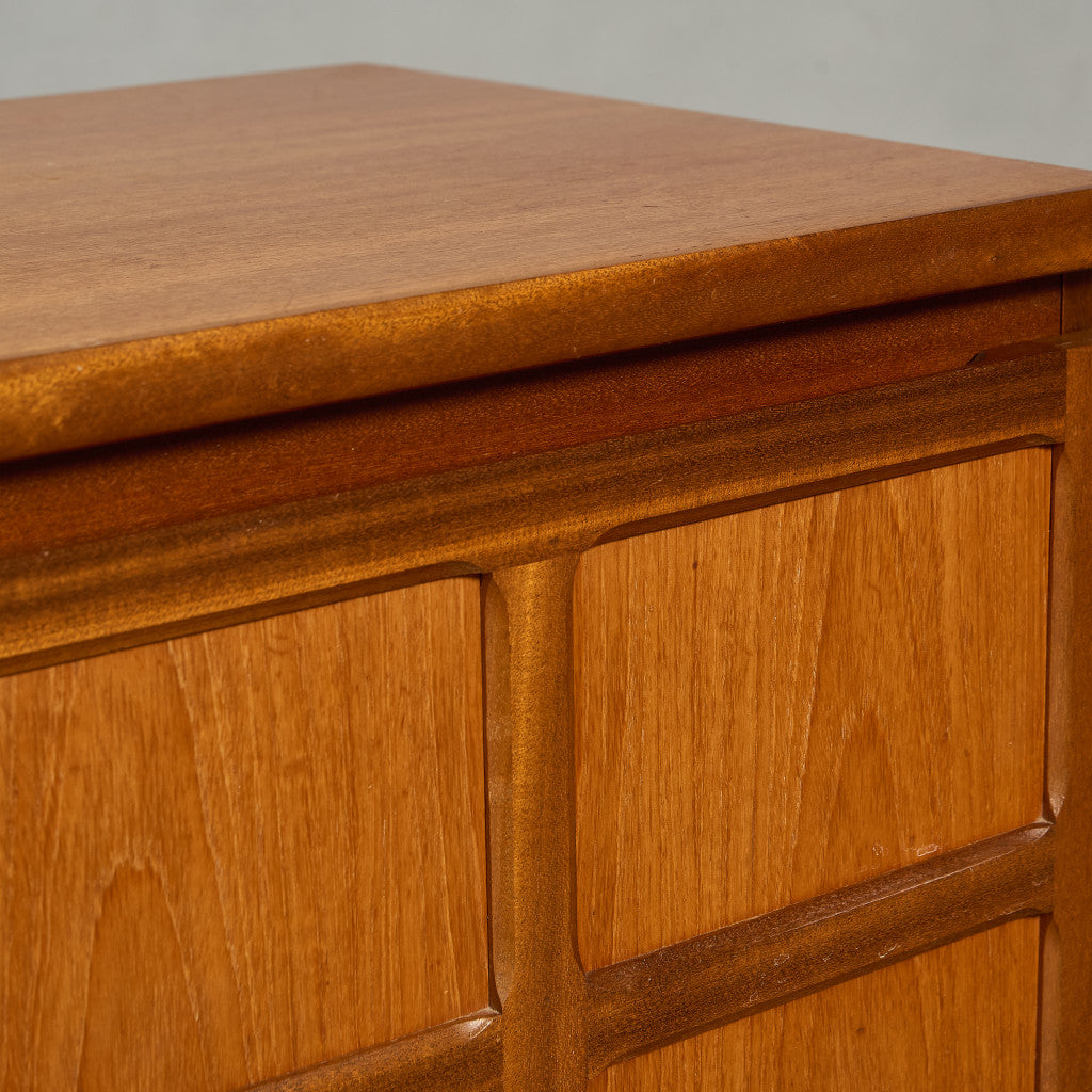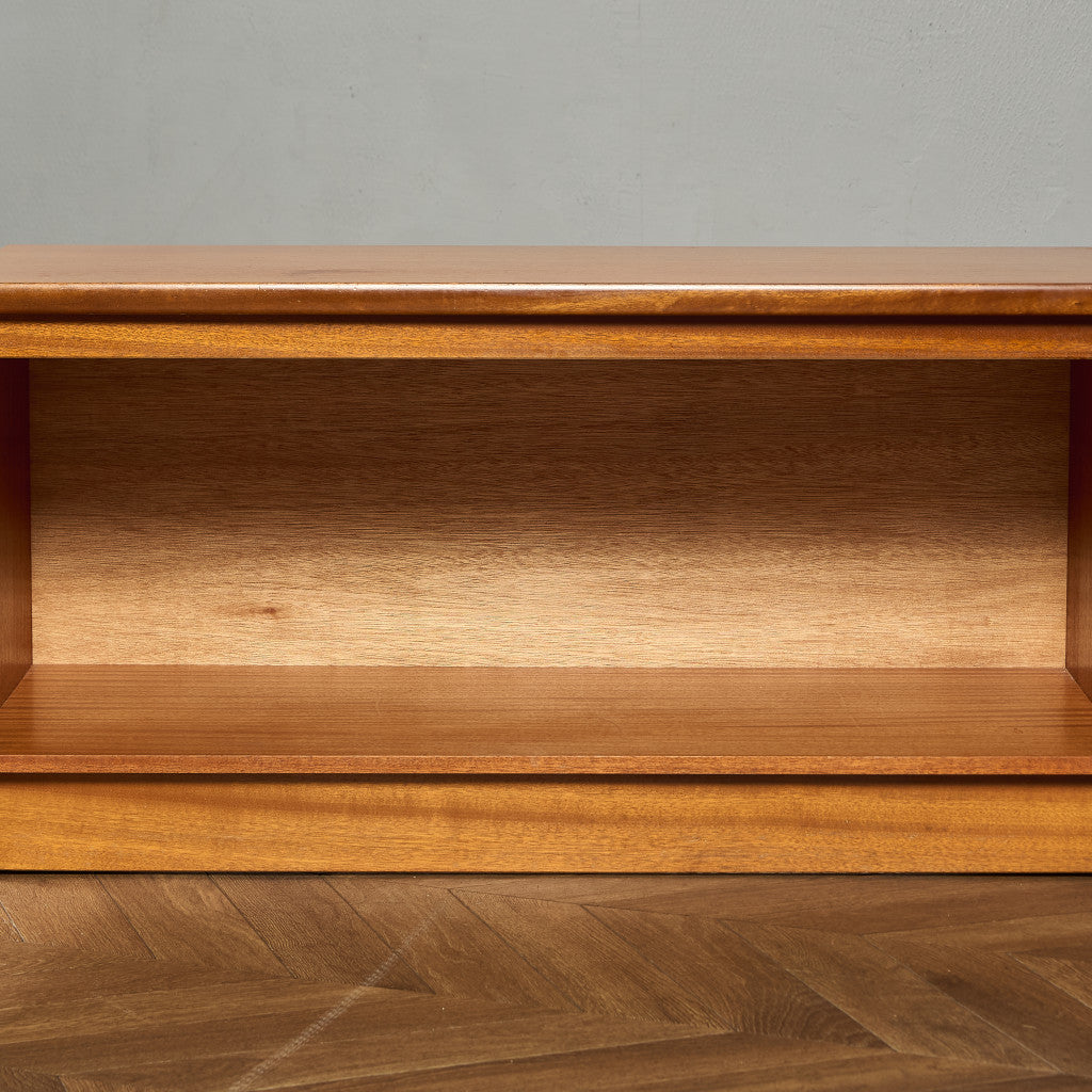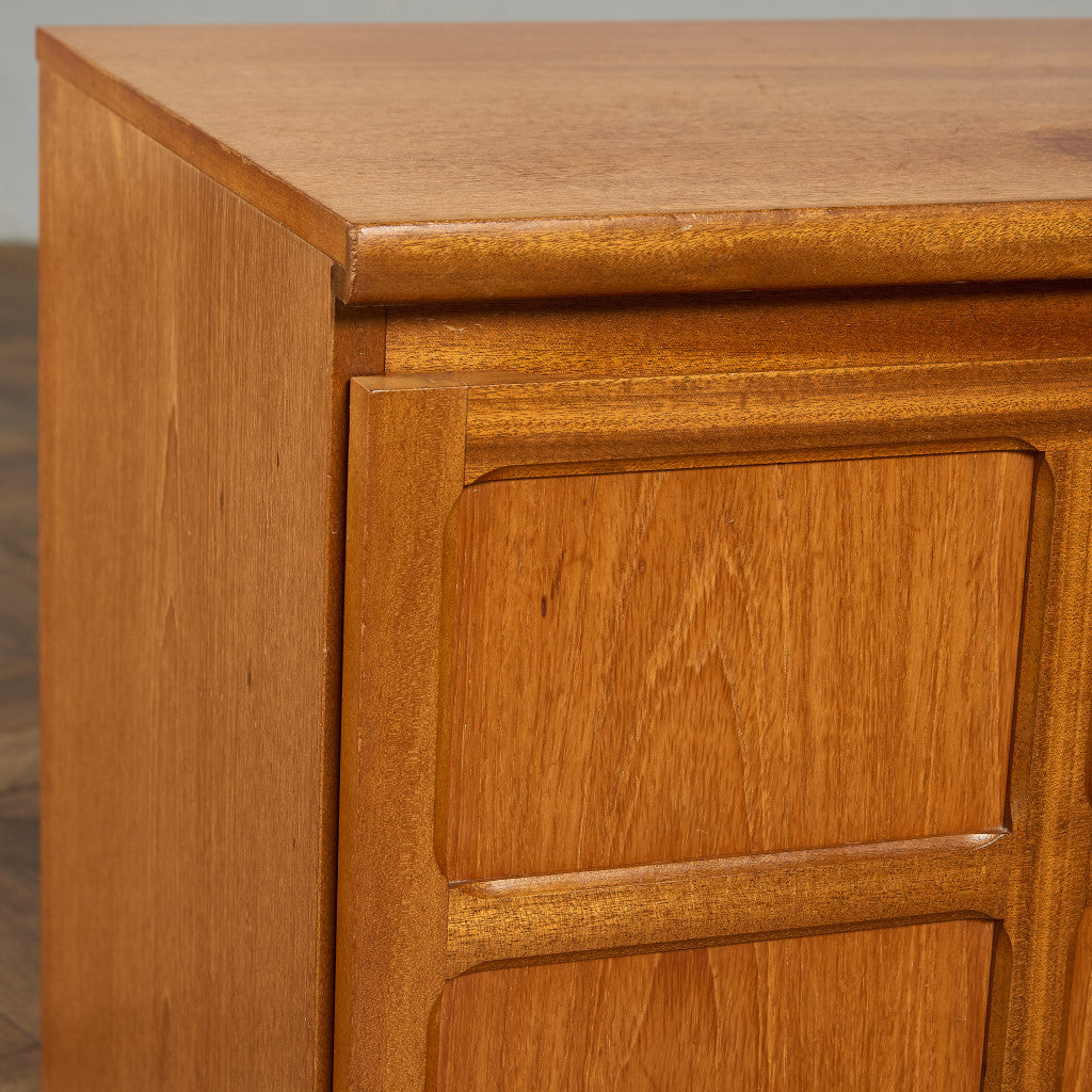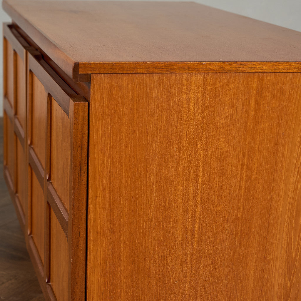 ヴィンテージチークのあたたかな質感と、少しクラシック家具寄りの前面扉框構造が印象的。洗練された手の込んだ英国らしいお品で、G-PLANやMcIntoshと比べて流通が少ないこともコレクター心をくすぐります。