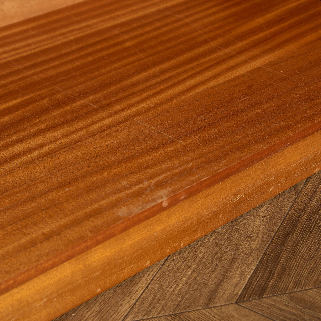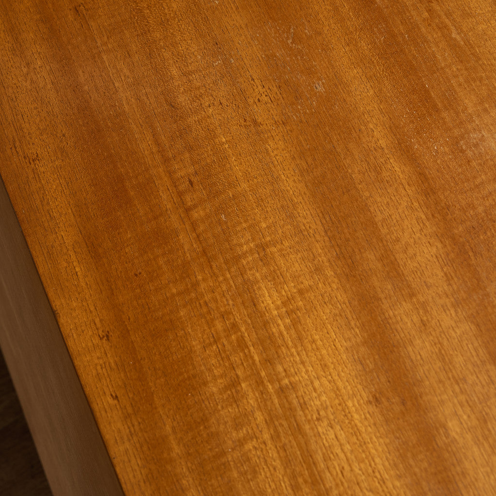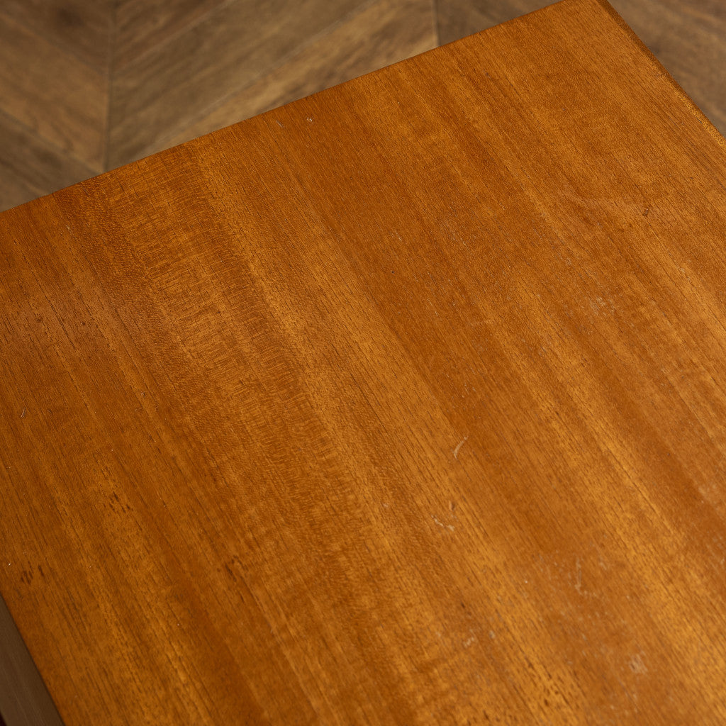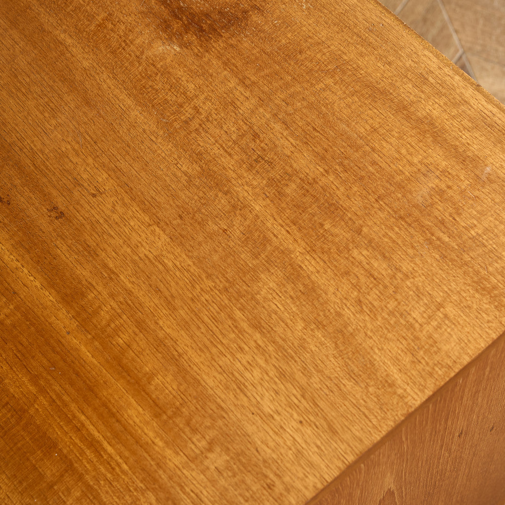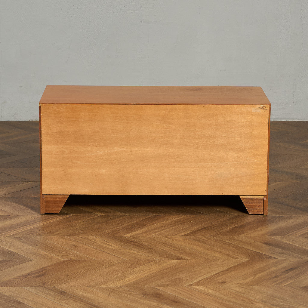 ヴィンテージチークのあたたかな質感と、少しクラシック家具寄りの前面扉框構造が印象的。洗練された手の込んだ英国らしいお品で、G-PLANやMcIntoshと比べて流通が少ないこともコレクター心をくすぐります。