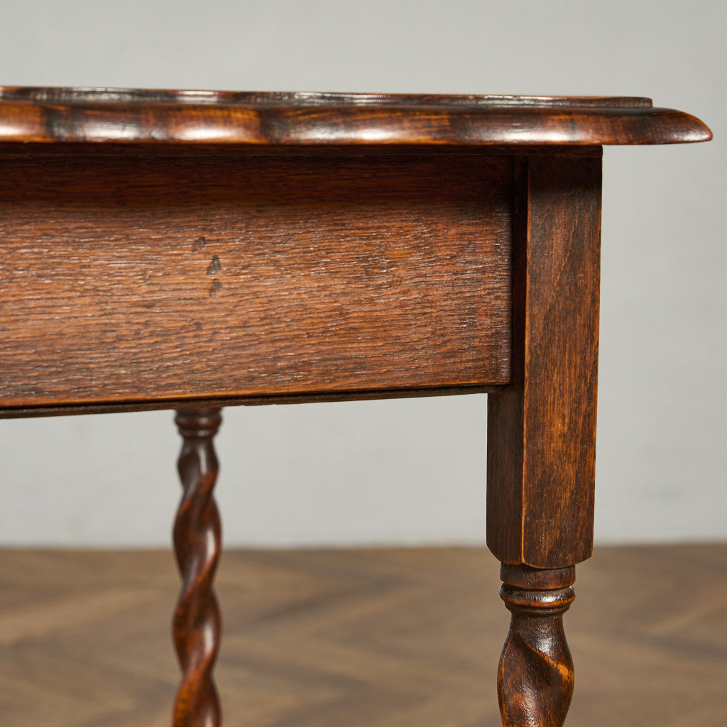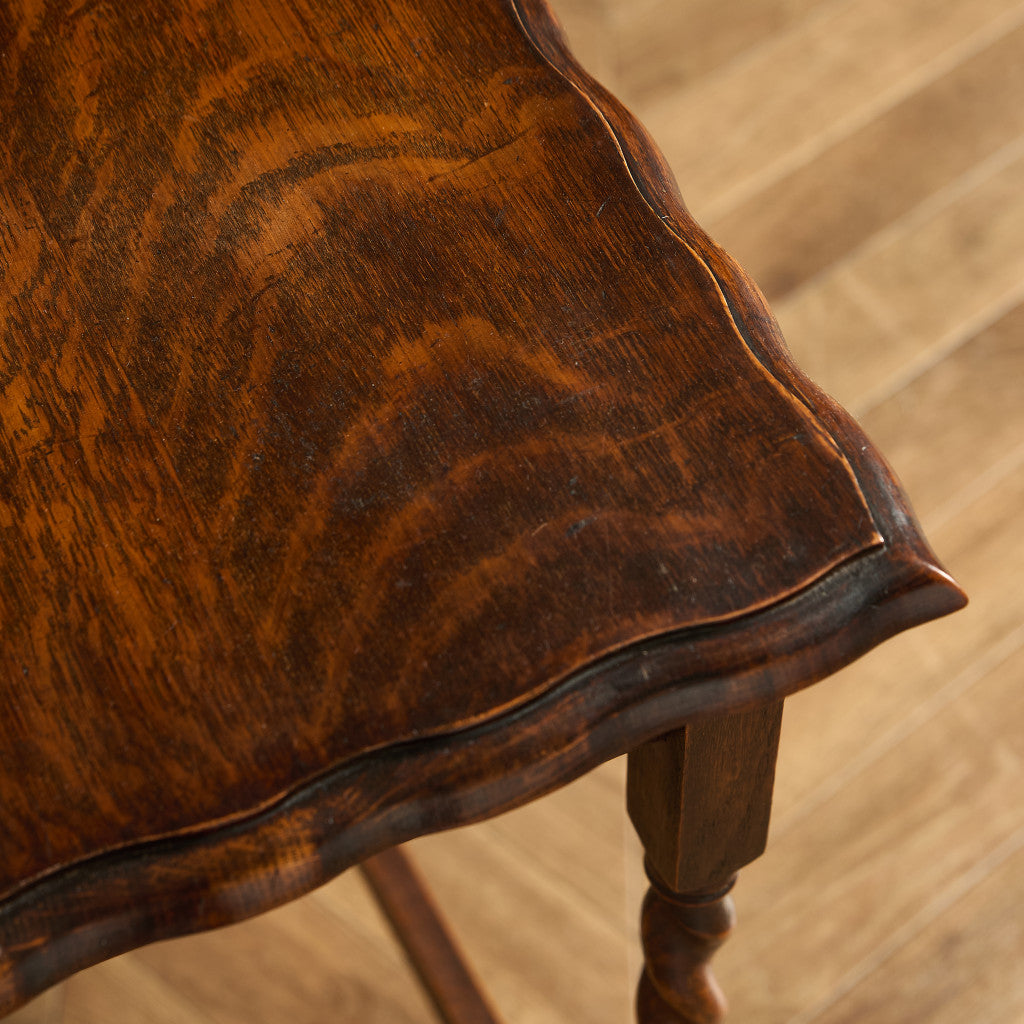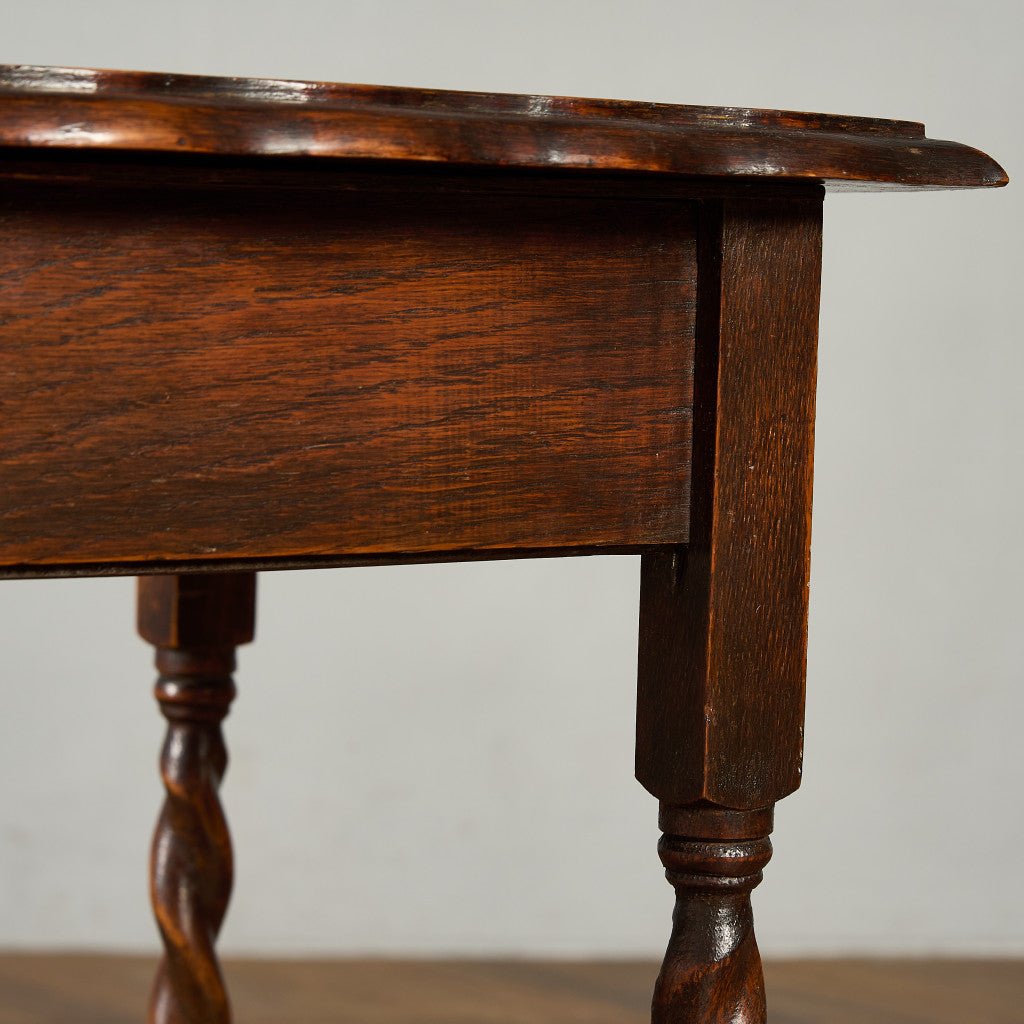 バーリーシュガーツイストの美しいディテールが目を引く上質なサイドテーブル。天板下に収納を備え、多様なシーンで活躍してくれる一品。ほどよく古びた風合いが素朴で優しい雰囲気を演出します。