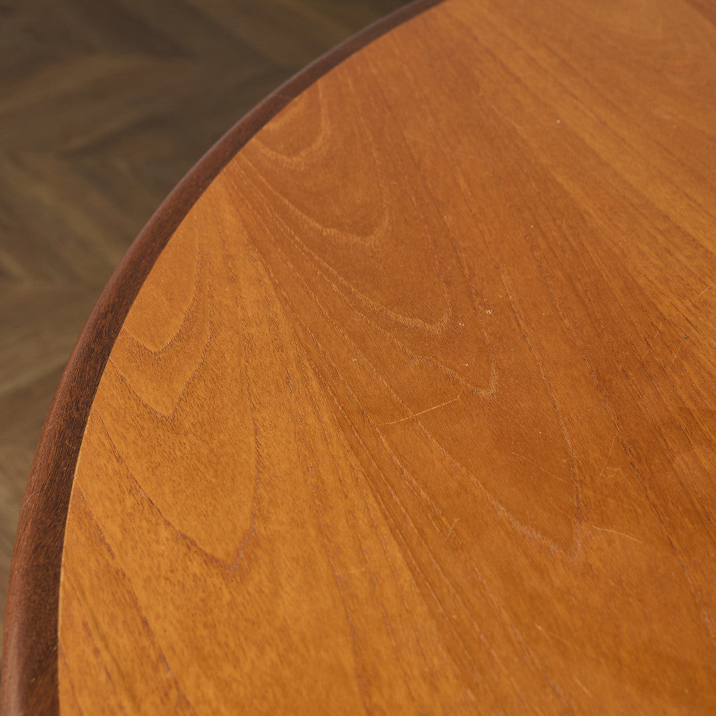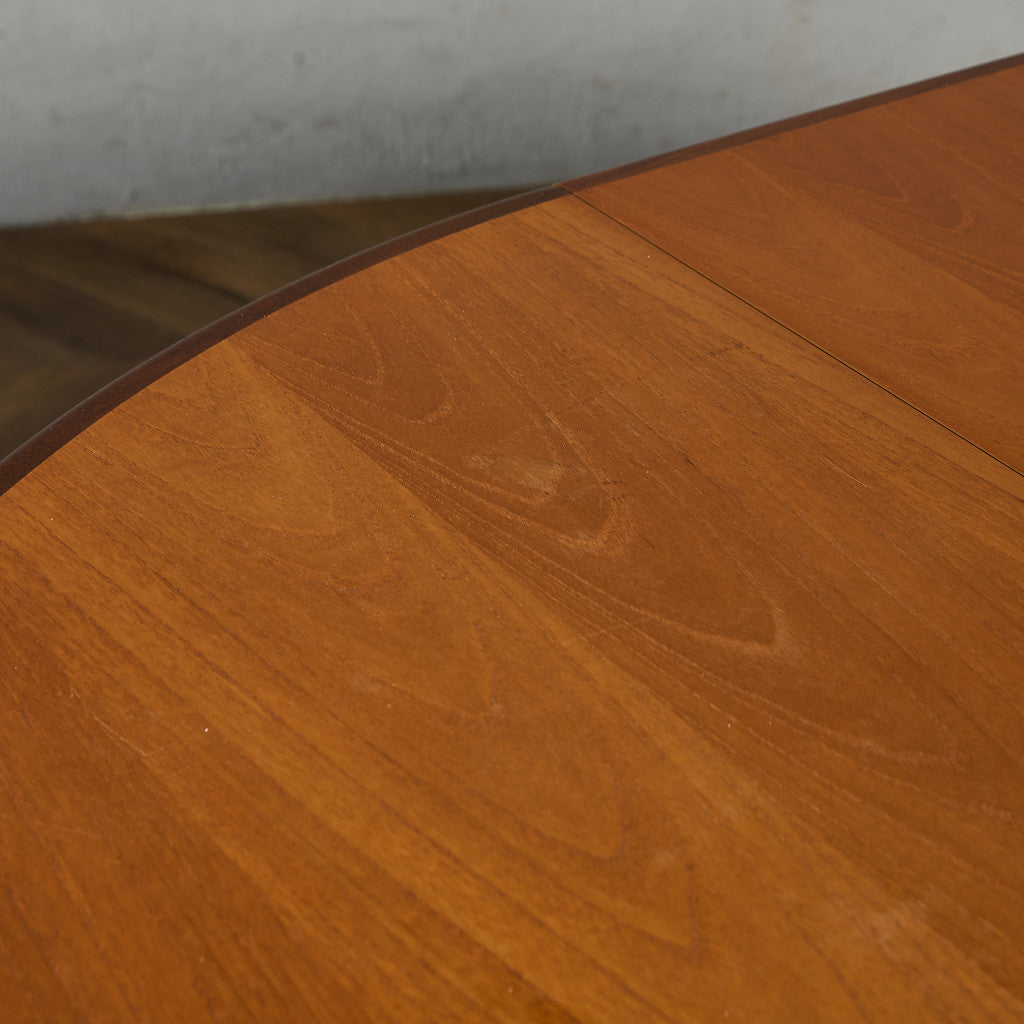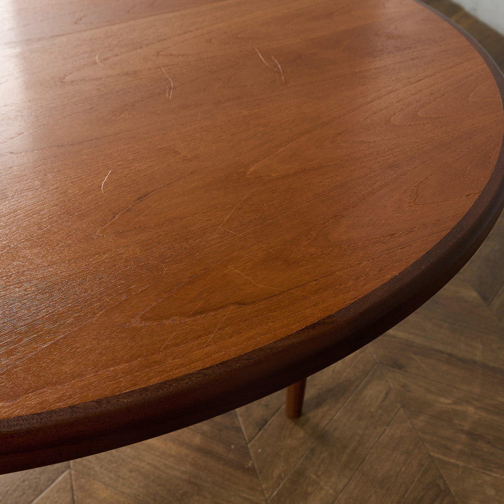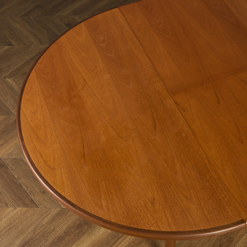 ミッドセンチュリーG-PLANコレクションの中心とも言える定番モデルのラウンドエクステンションテーブル。G-PLANのカタログにおいてもフレスコ、シエラ、ダニッシュ等のチーク材を用いたシリーズで横断的に組み合わせられるベーシックかつ汎用性の高いテーブルです。トップにはチーク、脚と縁には濃色の材を用いたバイカラー仕様。天板下に収納された拡張天板を中央に展開させることでテーブルの上はそのままに簡単にサイズの拡張が可能なエクステンションテーブルです。普段は2人〜4人用、来客時などは天板をさっと広げて6人用としてお使いいただけます。