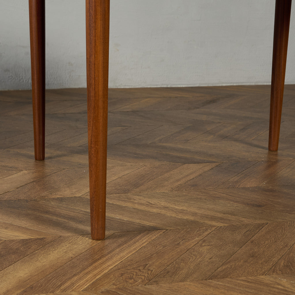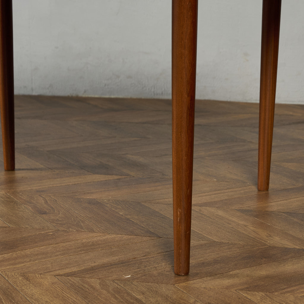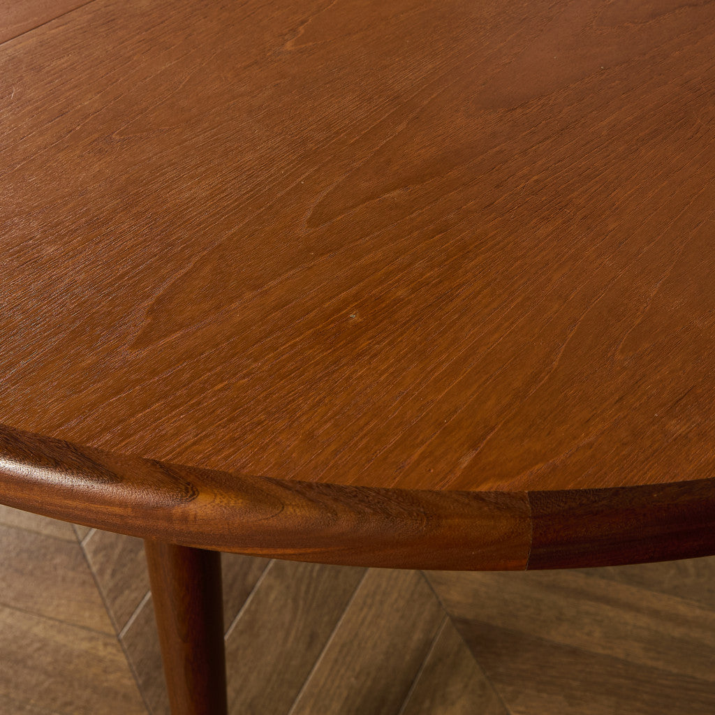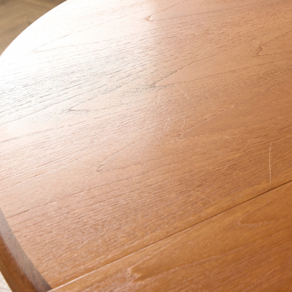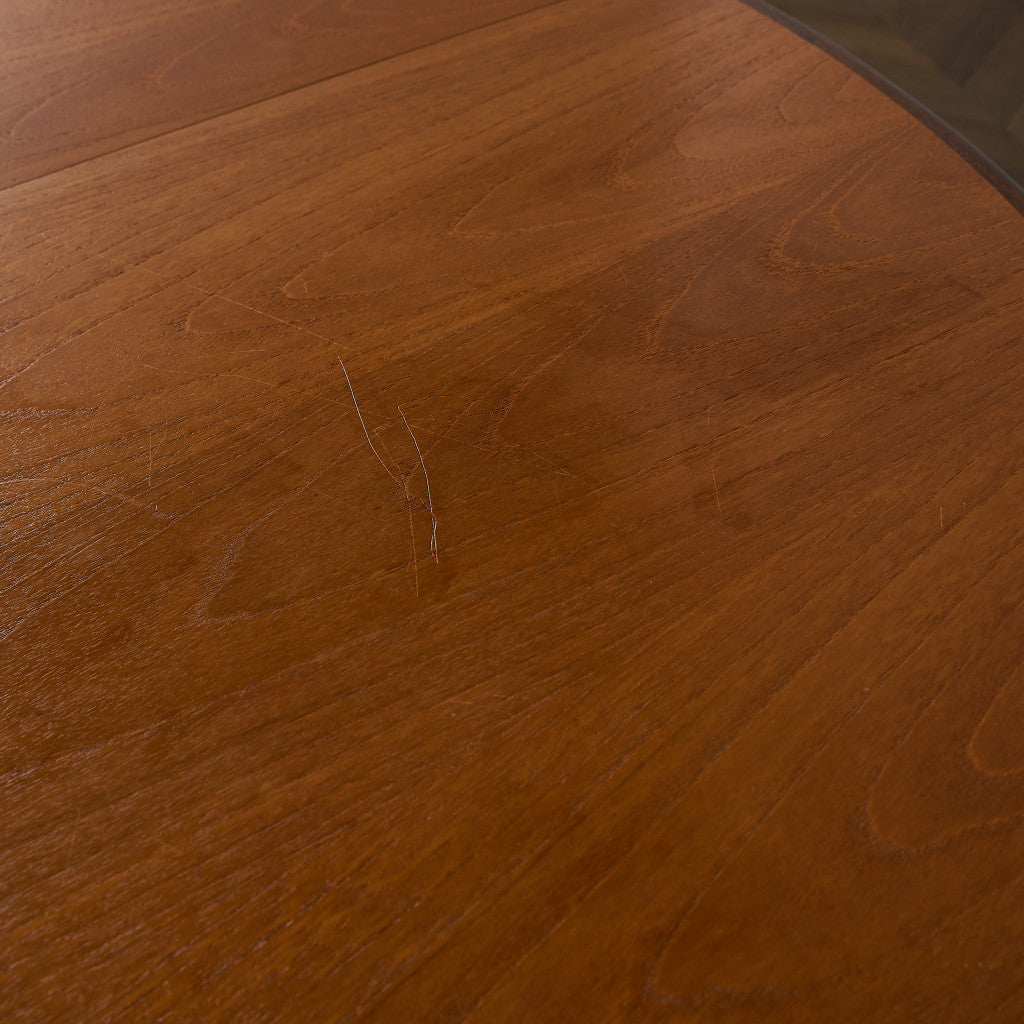 ミッドセンチュリーG-PLANコレクションの中心とも言える定番モデルのラウンドエクステンションテーブル。G-PLANのカタログにおいてもフレスコ、シエラ、ダニッシュ等のチーク材を用いたシリーズで横断的に組み合わせられるベーシックかつ汎用性の高いテーブルです。トップにはチーク、脚と縁には濃色の材を用いたバイカラー仕様。天板下に収納された拡張天板を中央に展開させることでテーブルの上はそのままに簡単にサイズの拡張が可能なエクステンションテーブルです。普段は2人〜4人用、来客時などは天板をさっと広げて6人用としてお使いいただけます。