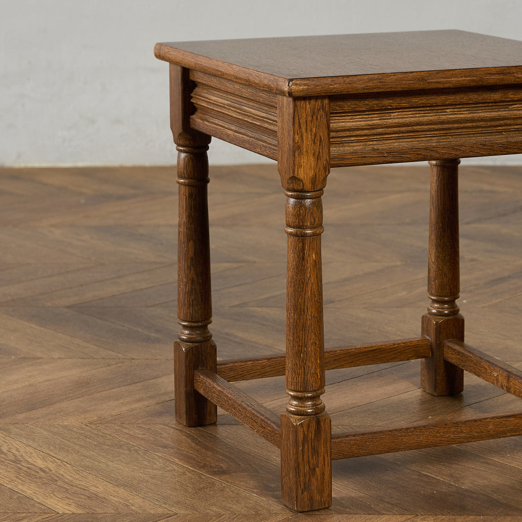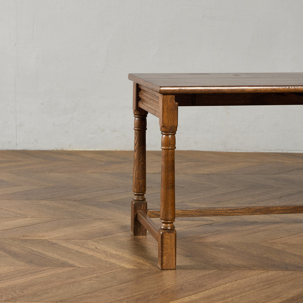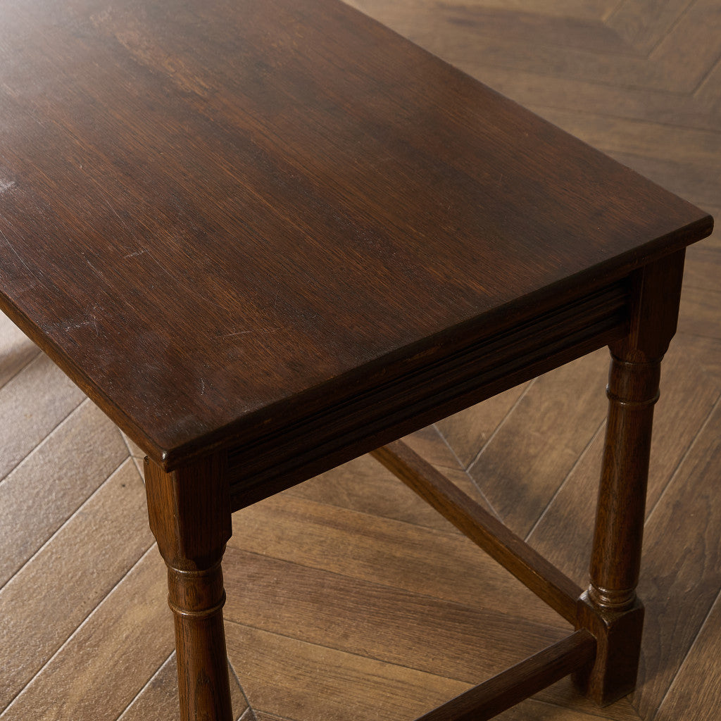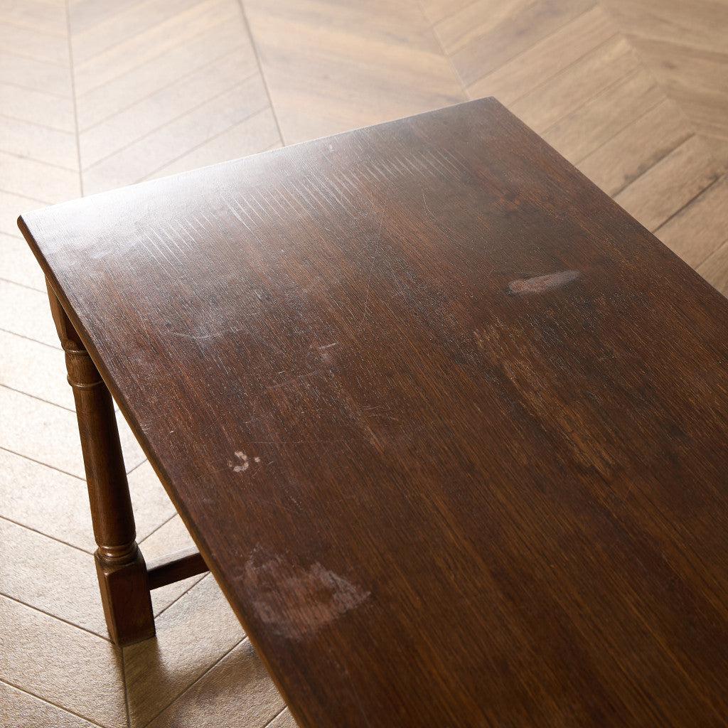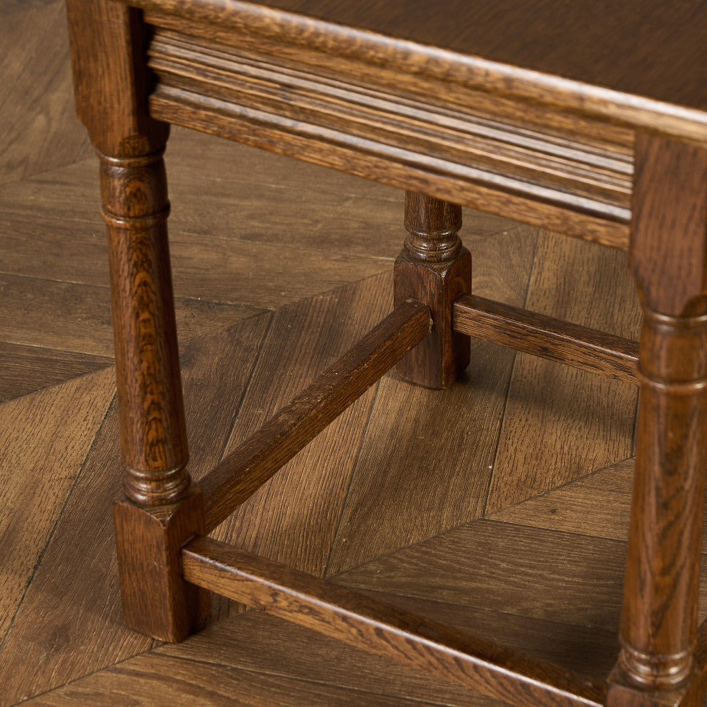 センターテーブルに対し、小テーブルを2点備えた珍しい仕様のコーヒーテーブル。随所に美しいディテールを備えた上質なお品です。オーク材の心地よい温もり、程よく古びた風合いが素朴で優しい雰囲気を演出します。ヨーロピアンアンティークの空間づくりやショップのディスプレイにもおすすめです。