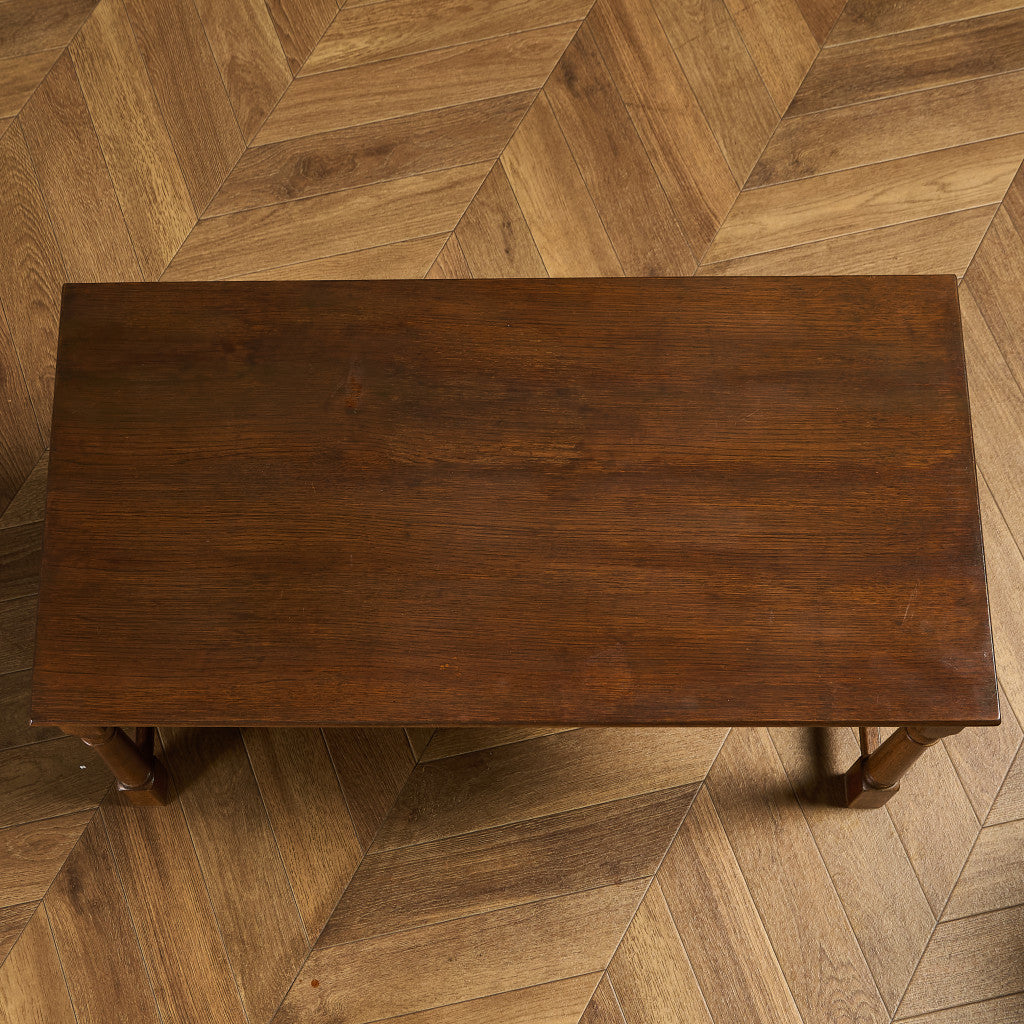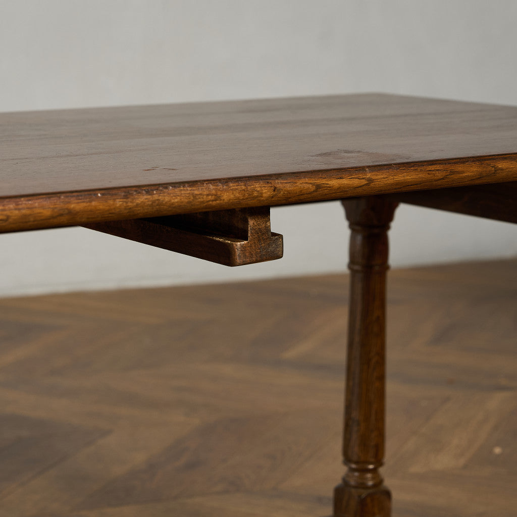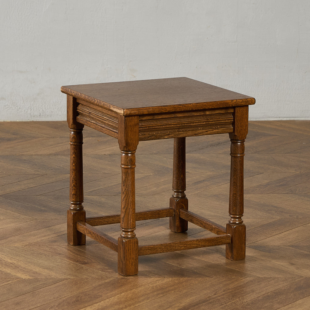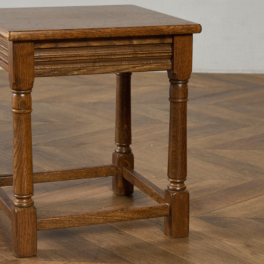 センターテーブルに対し、小テーブルを2点備えた珍しい仕様のコーヒーテーブル。随所に美しいディテールを備えた上質なお品です。オーク材の心地よい温もり、程よく古びた風合いが素朴で優しい雰囲気を演出します。ヨーロピアンアンティークの空間づくりやショップのディスプレイにもおすすめです。