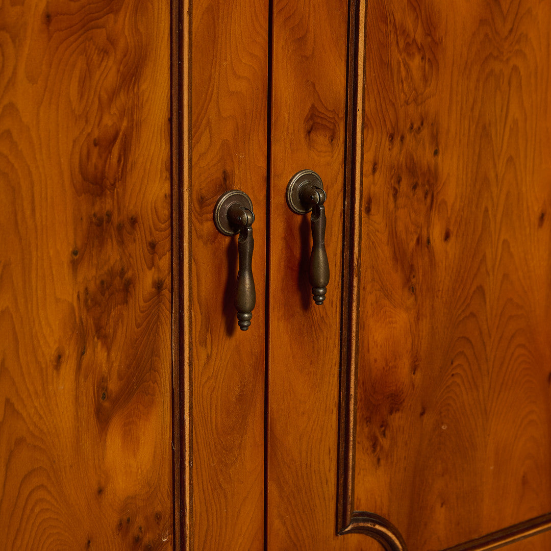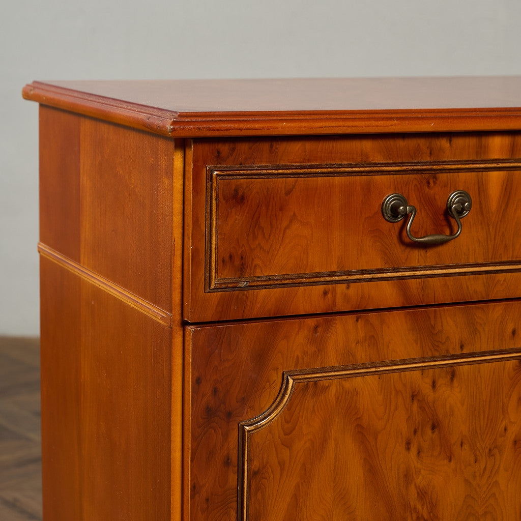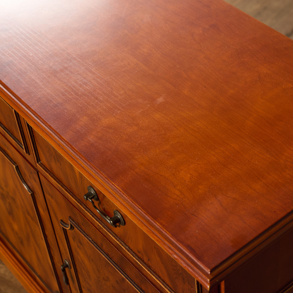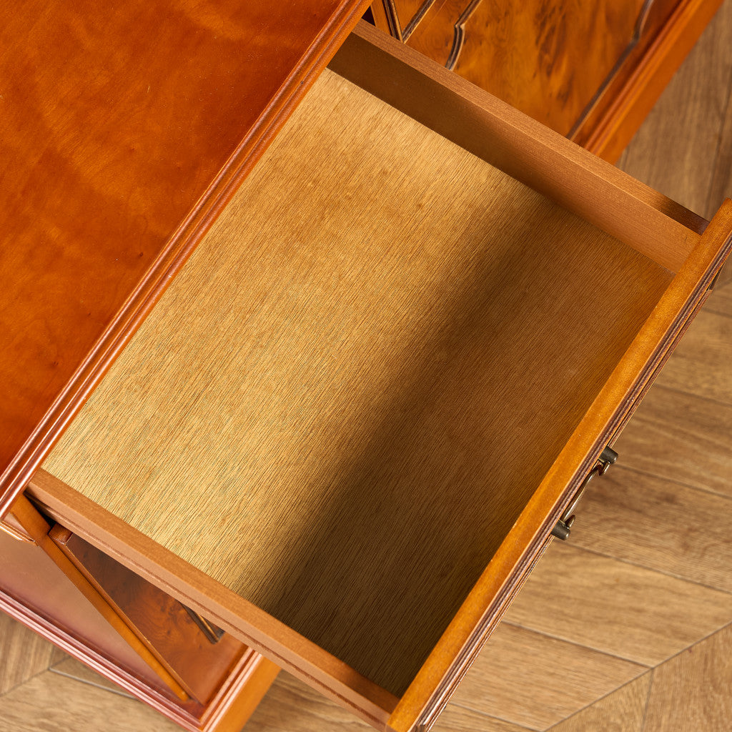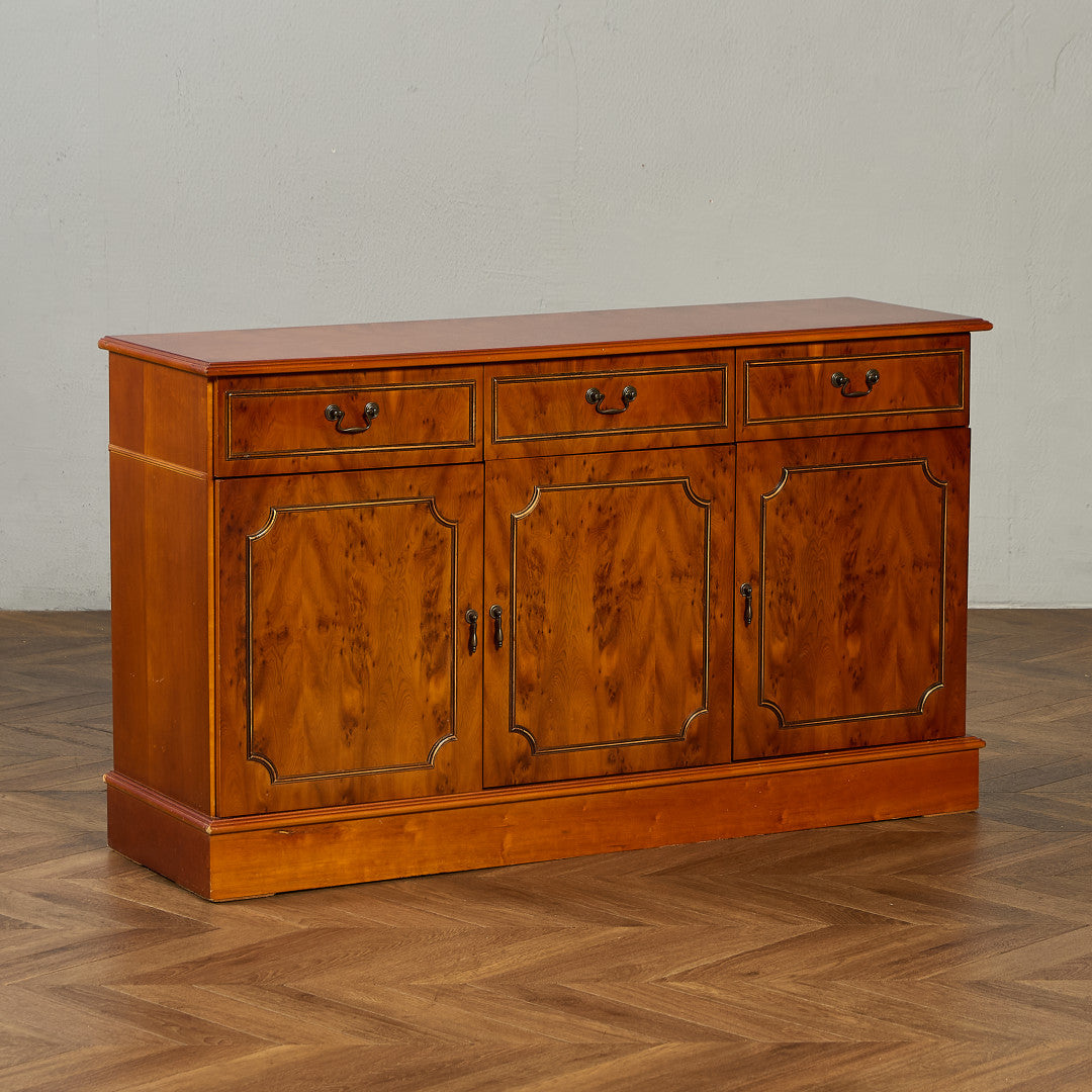 美しい木目のイチイ材を使用。実用性を重視したシンプルなデザインにクラシカルな金具がアクセントを添える、趣あるシックな佇まいが魅力です。ヨーロピアンアンティークの空間づくりやショップのディスプレイにもおすすめです。