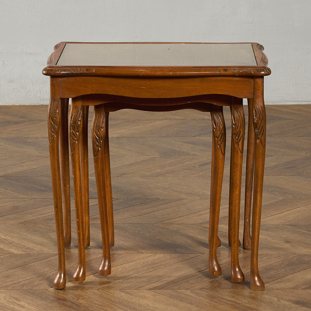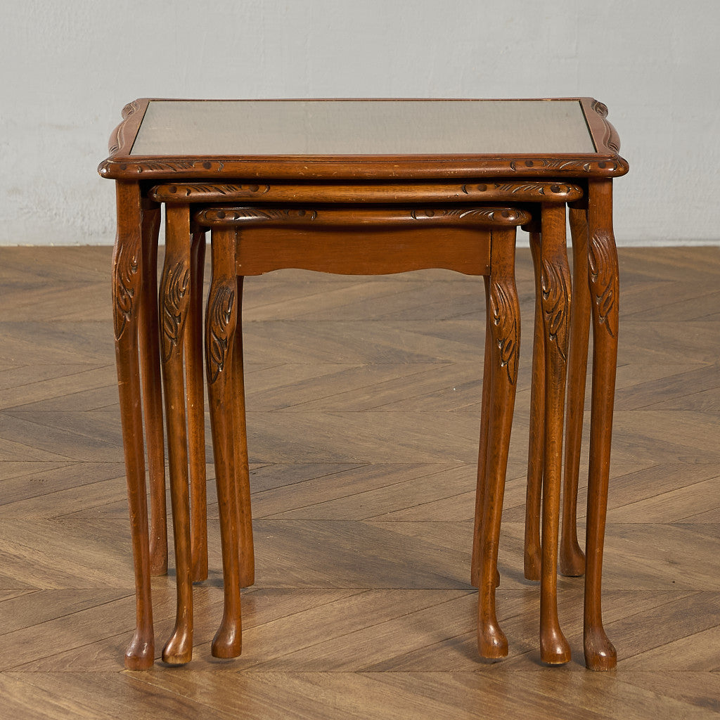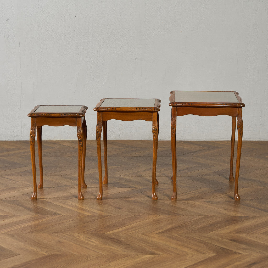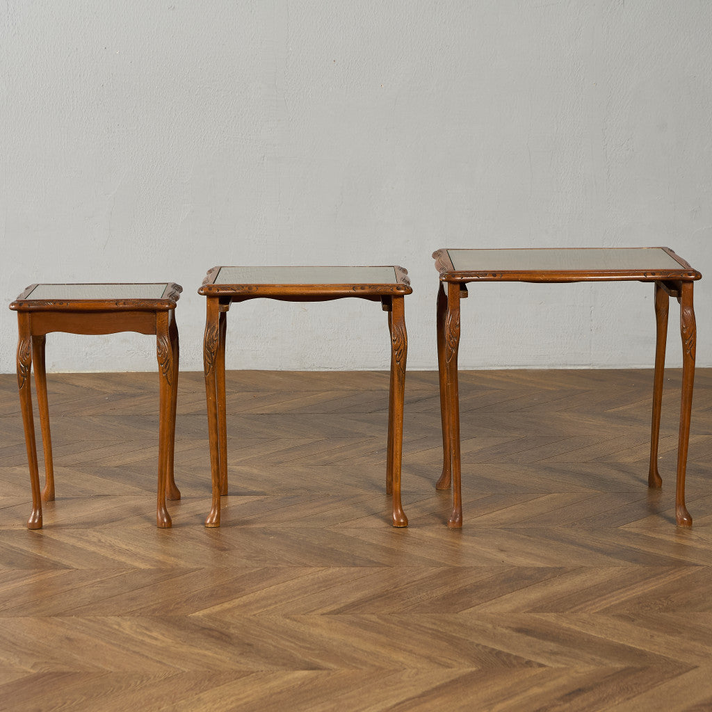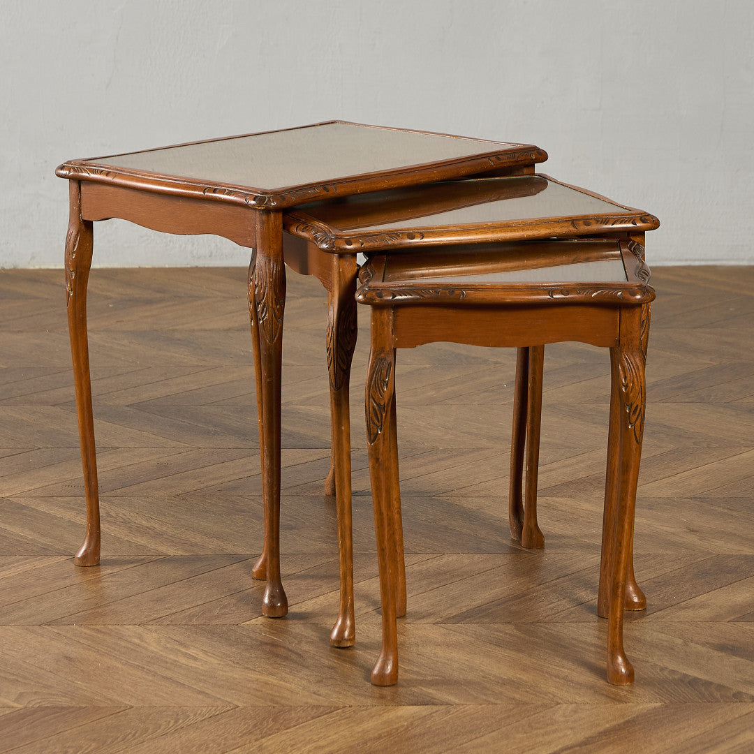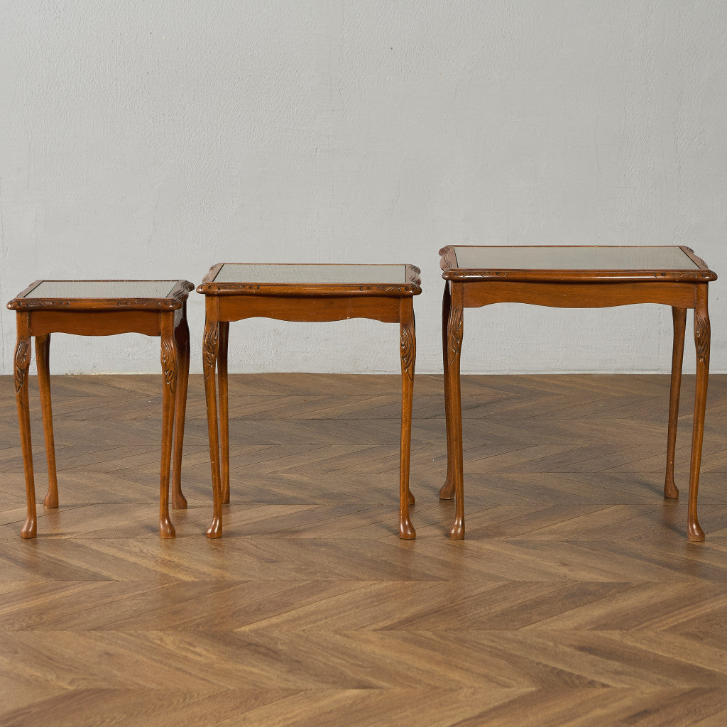 上品な印象のカブリオールレッグなど、繊細なディテールを備えた優雅なデザインが魅力のネストテーブル。リビングのサイドテーブルや寝室に置くナイトテーブルとしてはもちろん、必要に応じて引き出すことでフレキシブルにお使いいただけます。