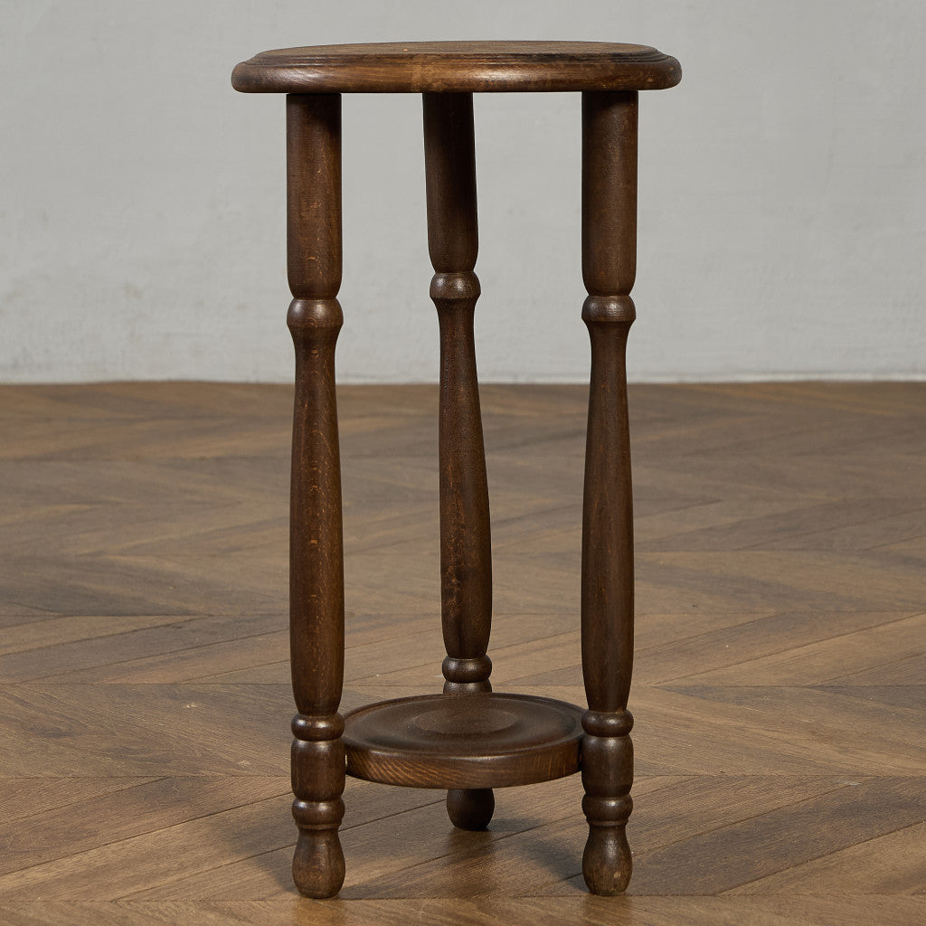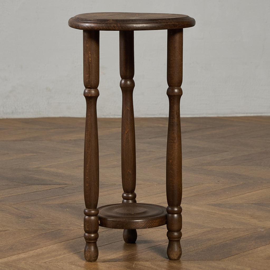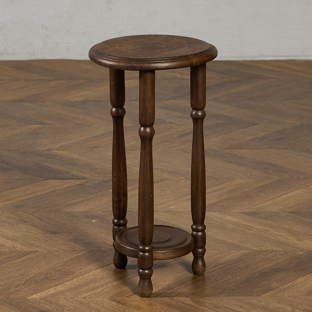 深い色合いのブナ材に木彫り装飾が美しいプランタースタンド。脚部には繊細な挽物細工が施され、クラシック家具らしい優雅なフォルムが、植物を上品に引き立てます。観葉植物や花鉢はもちろん、照明や小物を置くサイドテーブルなど、幅広い用途でお使いいただけます。