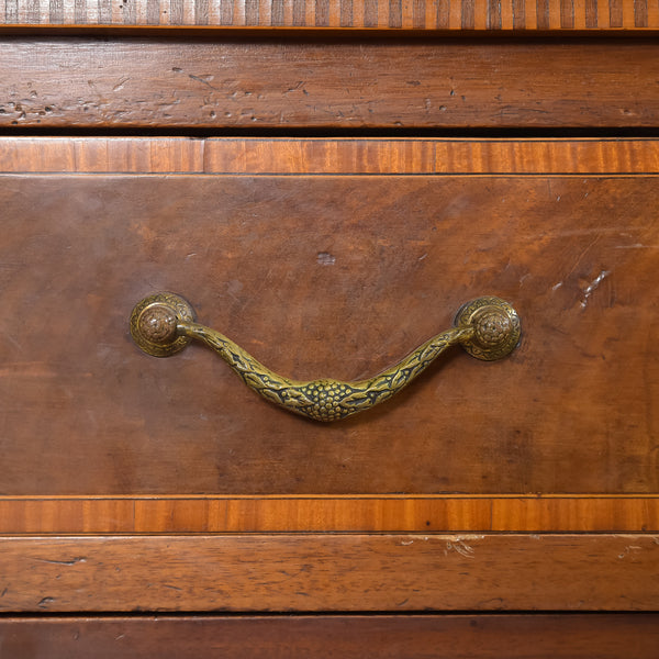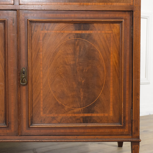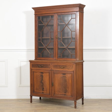 扉部分はシノワズリを思わせる美しい飾り格子、モールディングや象嵌など全体的にエドワーディアン様式の特徴が現れています。美しい褐色のマホガニー材を使用した外観は荘厳な出で立ちでお部屋の雰囲気をぐっと格調高いものに演出してくれます。コレクションを飾る飾り棚や食器棚、本棚として使える大容量のキャビネットです。