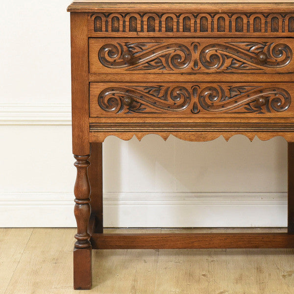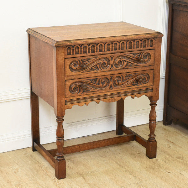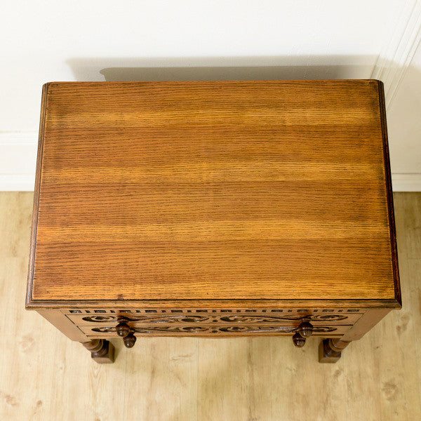 英国の伝統的な木彫装飾を備えた上品なナイトテーブル。ベッドサイドはもちろん、サイドテーブルやサイドチェストとして多目的にお使いいただけます。