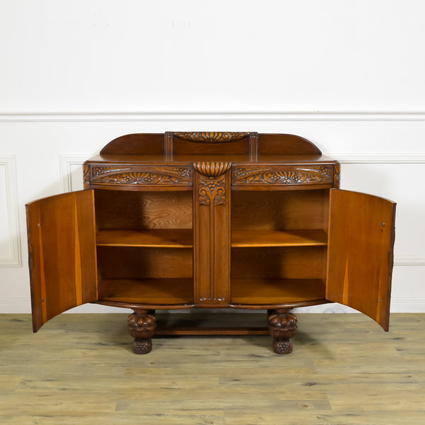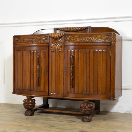 鮮やかな虎斑が特徴のブリティッシュオーク材を使用。曲線と直線を取り入れたアールデコスタイルのフォルムに手彫りの木彫レリーフが華やかな印象を添えています。飾り過ぎない品の良さと現代家具に通じる実用性が魅力の英国スタイルです。