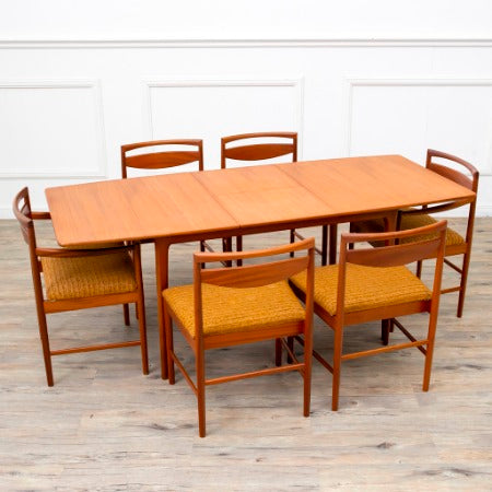 エクステンションダイニングテーブルとアームチェア2脚&アームレスチェア4脚の7点セット。ヴィンテージチークのあたたかな質感と、空間にすっきりと収まるシンプルな佇まい。滑らかに一体感をもって繋がれた脚のディテールなどG-PLANの家具とは一味違った美しさと魅力を持った、McINTOSHならではと言える一品です。