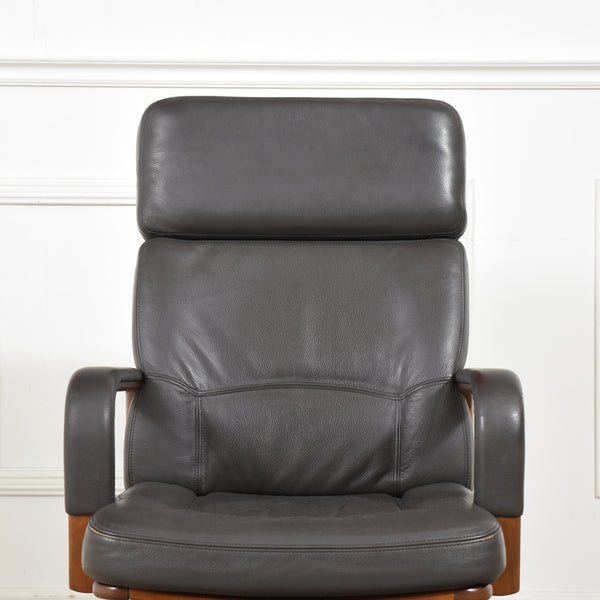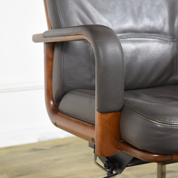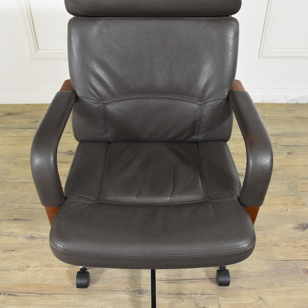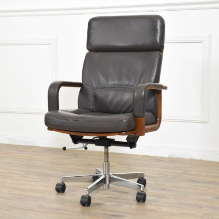 企業役員室向けにデザインされたハイエンドな総本革張りの執務椅子。ロッキング、昇降等としてのベーシックな機能は踏まえながら国内トップ家具ブランドならでは座り心地の良いシート構造と木質インテリアに調和する美観を備えた上質なチェアです。
