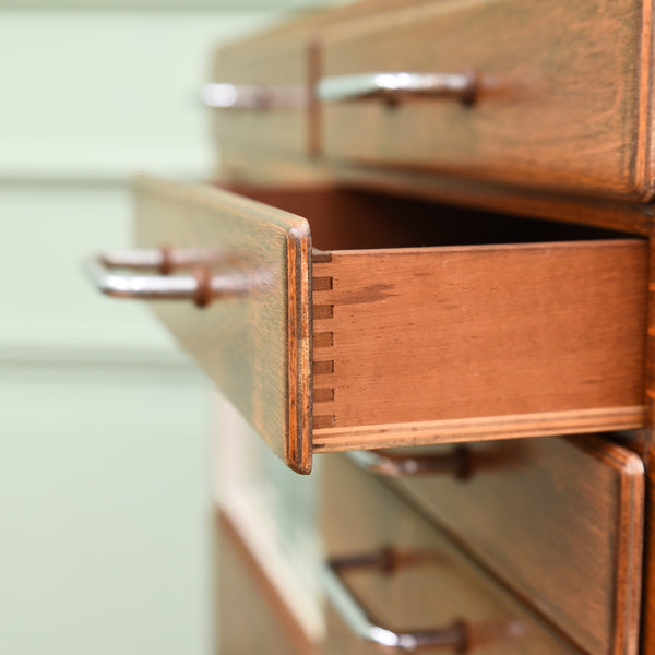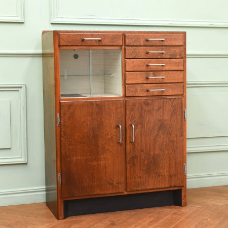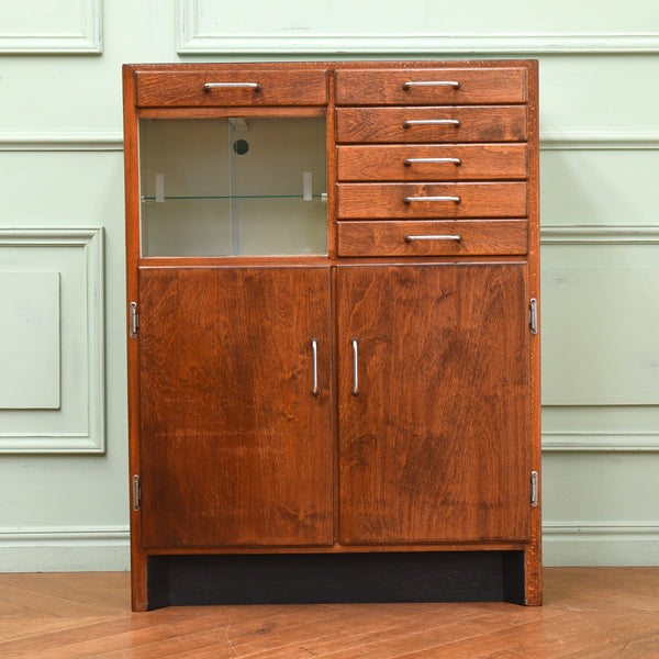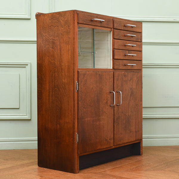 ガラス戸収納や引出し、下部には2段になった収納がついており、様々なシーンでご使用できる一品、ヴィンテージ感溢れるシルバー取手や使い込まれた風合いの木肌が魅力的です。