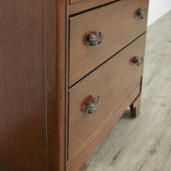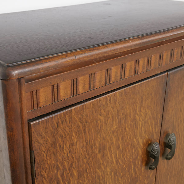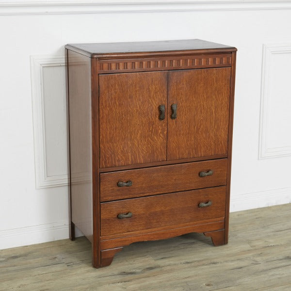 今では貴重となった良質なオーク材をふんだんに使用したアンティークキャビネット。大型のクローゼットを子供用サイズに小さくしたかのようなユニークなデザイン。 木彫のモールディング装飾やクラシカルなシェル型金具がアクセントを添えるコンパクトながらも存在感のあるお品です。