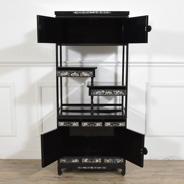 様々なモチーフが螺鈿によって綿密に描かれた存在感を放つ一品。角度や光加減によって見え方が異なり、美術作品のように見応えがある一品です。