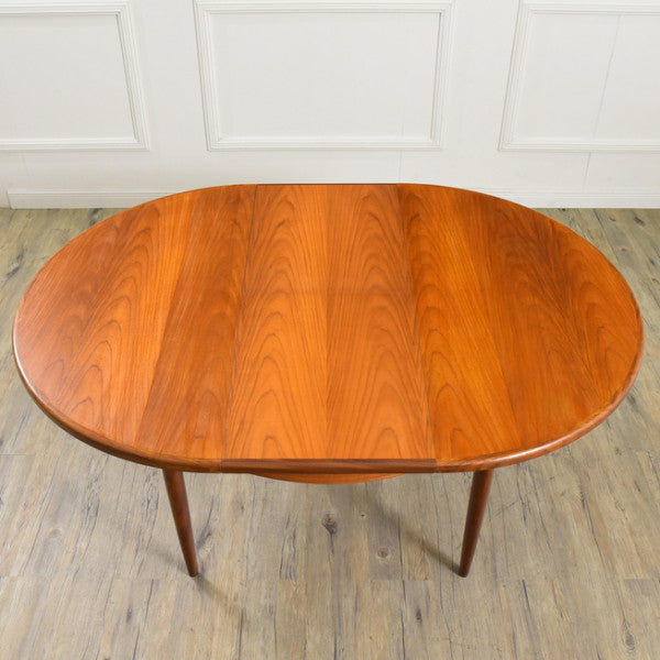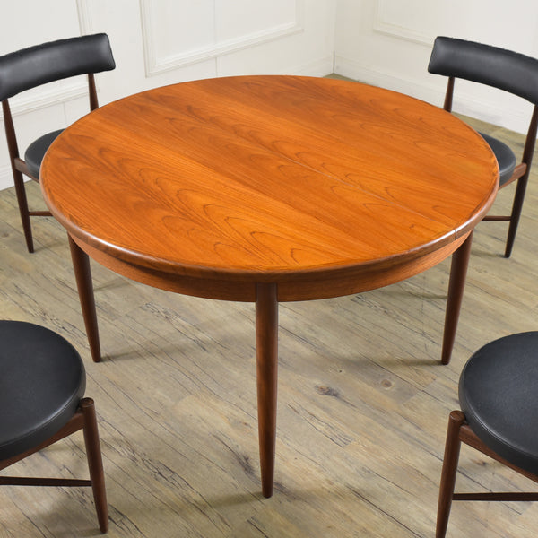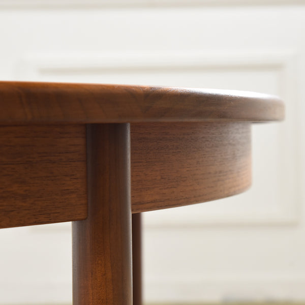 ミッドセンチュリーG-PLANコレクションの中心とも言えるラウンドエクステンションテーブル。G-PLANフレスコ、シエラ、ダニッシュ等のチーク材を用いたシリーズに横断的に組み合わせられるベーシックかつ汎用性の高いテーブルです。天板下に収納された拡張天板を中央に展開させることでテーブルの上はそのままに簡単にサイズの拡張が可能なエクステンションテーブルです。普段は2人〜4人用、来客時などは天板をさっと広げて6人用としてお使いいただけます。