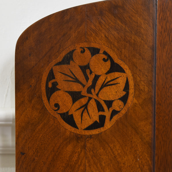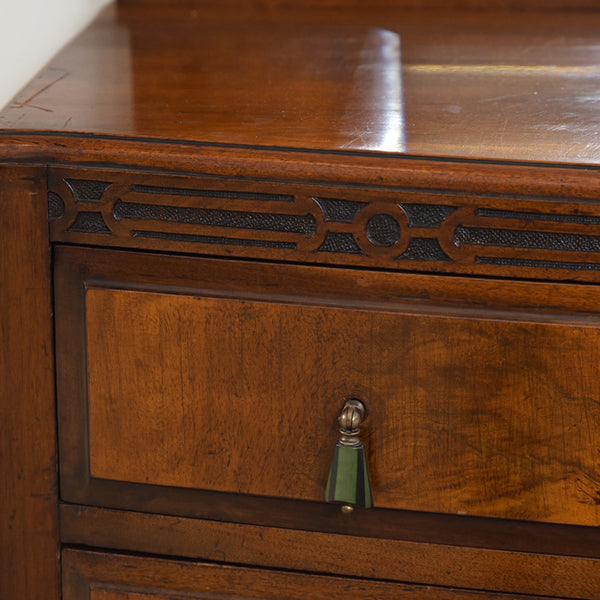 上品で落ち着いた色のマホガニー材を使用。鏡を支える両サイドの柱のトップには華やかさを加える象嵌が施され、縁の彫刻や取っ手、猫脚など、随所にエレガントなディテールを備えています。