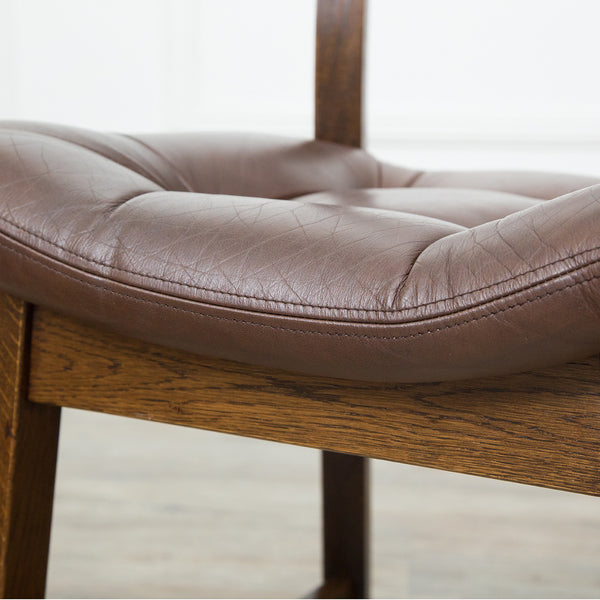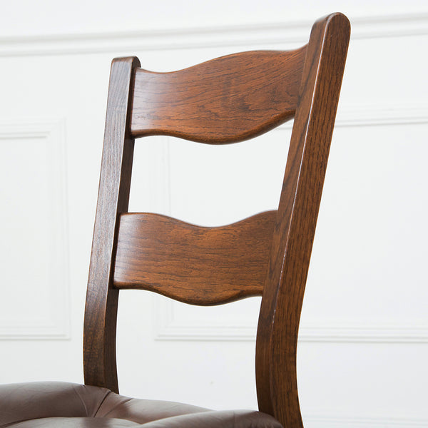 美しい木目と虎斑模様が特徴のオーク無垢材を使用したダイニングチェア。シンプルなフォルムながら、どっしりとした佇まいに丸みを帯びたラダーバッグのシルエットが素朴な温もりを感じさせるチェア。座面には本革を使用しています。木のあたたかみ溢れる本格カントリー家具です。