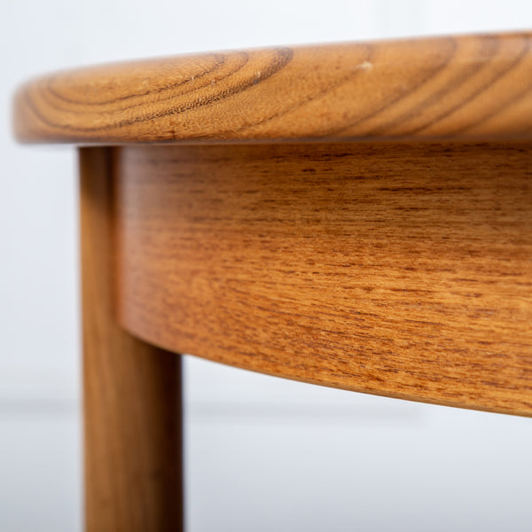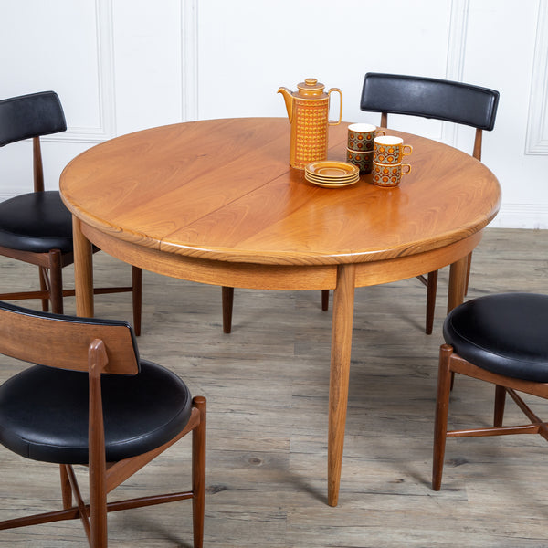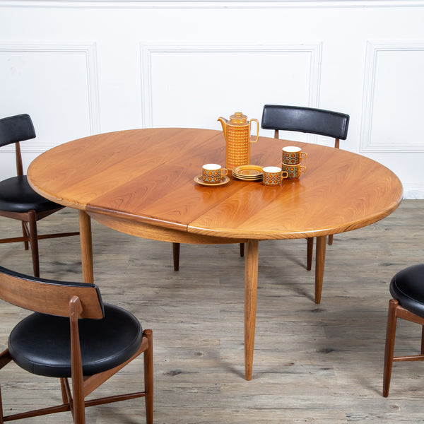 ミッドセンチュリーG-PLANコレクションの中心とも言えるラウンドエクステンションテーブル。G-PLANフレスコ、シエラ、ダニッシュ等のチーク材を用いたシリーズに横断的に組み合わせられるベーシックかつ汎用性の高いテーブルです。天板下に収納された拡張天板を中央に展開させることでテーブルの上はそのままに簡単にサイズの拡張が可能なエクステンションテーブルです。普段は2人〜4人用、来客時などは天板をさっと広げて6人用としてお使いいただけます。