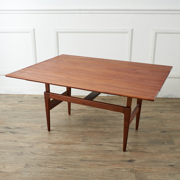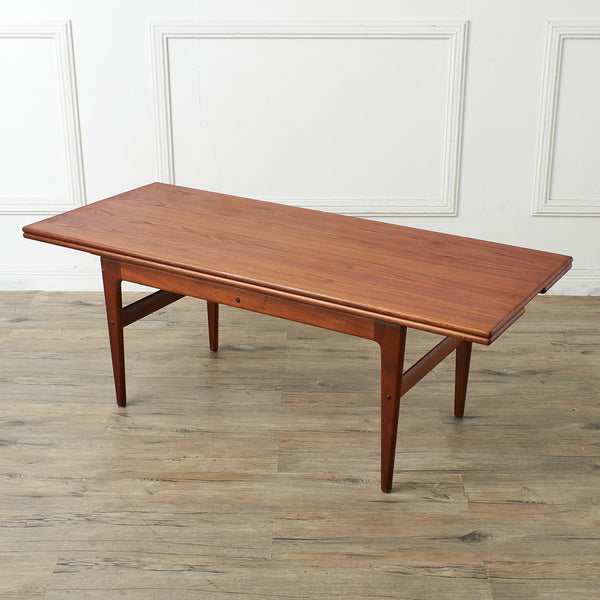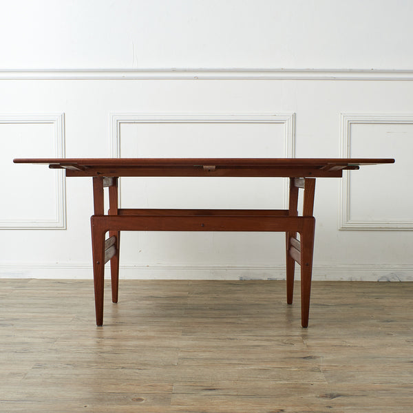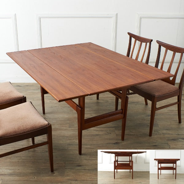ソファに合わせることでリビング用途のセンターテーブルと、ダイニング用途のダイニングテーブルの高さに可変することができるテーブル。ソファとの組み合わせをそのままダイニングスペースに変えることができるので、ひとり暮らしのリビング兼ダイニングスペースや来客が多いお宅のサブダイニングテーブルとして最適です。ドローリーフ式のエクステンション天板も備えているので、用途に合わせて簡単に拡張が可能。機能的で実用的なお品です。