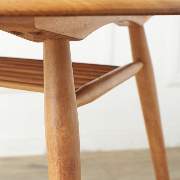 その名の通り、朝食用に作られたブレックファストテーブル。ダイニングテーブルより小ぶりで、キッチン横などで朝食やちょっとした食事をとる際に使われていました。他のアーコールのテーブルでは角ばった脚の形状が一般的ですが、このテーブルは椅子と同様のすっきりしたラインの美しい丸脚が特徴です。天板の下にはラックがついており、機能性も良く、使いやすいサイズなので、作業用デスクとしてもご利用いただけます。本国・イギリスでも入手困難となってきているアイテムですが、さらに珍しい丸型(厳密には若干オーバル型)の大変貴重な逸品です。
