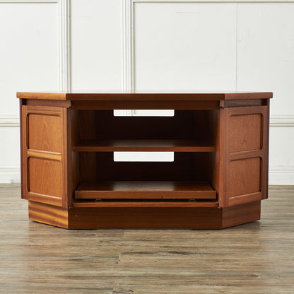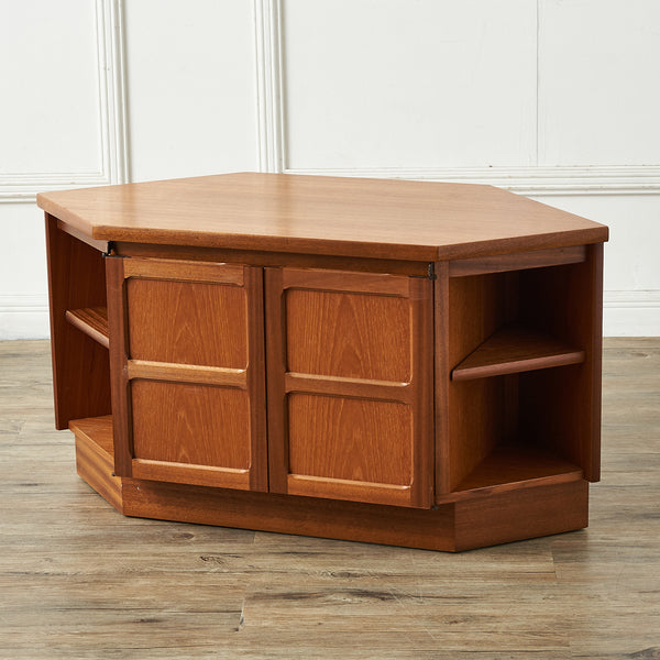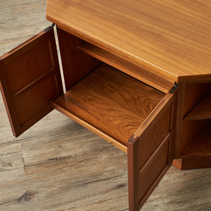 レア度の高いNathan社のコーナーキャビネットです。ヴィンテージチークのあたたかな質感と、少しクラシック家具寄りの前面扉框構造が印象的。左右の扉は中央のAV機器スペースの目隠しとしても使えるユニークなデザイン、手の込んだ仕上がりの英国らしい洗練されたキャビネットです。G-PLANやMcINTOSHと比べて流通が少ないこともコレクター心をくすぐります。