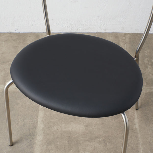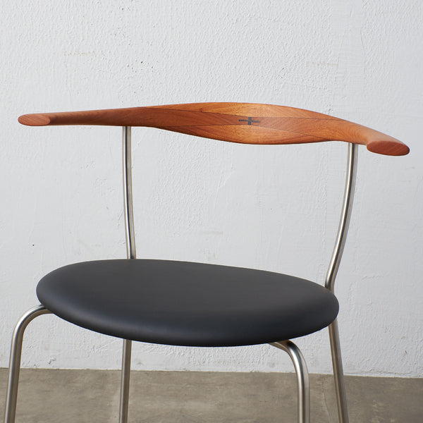 ウェグナーが自邸のダイニング用にデザインし、1965年に発表した「PP701 アームチェア」。木材・スチール・革という異素材を合わせて作られた、ウェグナーデザインでは珍しい作品です。エレガントで軽快なデザインと職人の繊細な造形美は言うまでもなく、長時間座っても疲れにくい座り心地や、サビに強いステンレススチールフレームの採用、4脚までのスタッキングが可能など、機能性・実用性も申し分ありません。ウェグナー夫人がこよなく愛したチェアとしても知られ、ウェグナー自身も大変気に入っていたという名作チェアです。