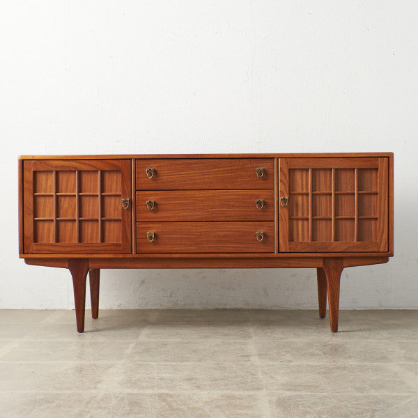 チークとアフロモシアによる木肌が美しい上質な一品。扉部分の格子細工が印象的で、金属取っ手とのコントラストが目を惹きます。ヤンガーらしい、作りの良さと手の込んだ意匠が調和したヴィンテージサイドボードです。